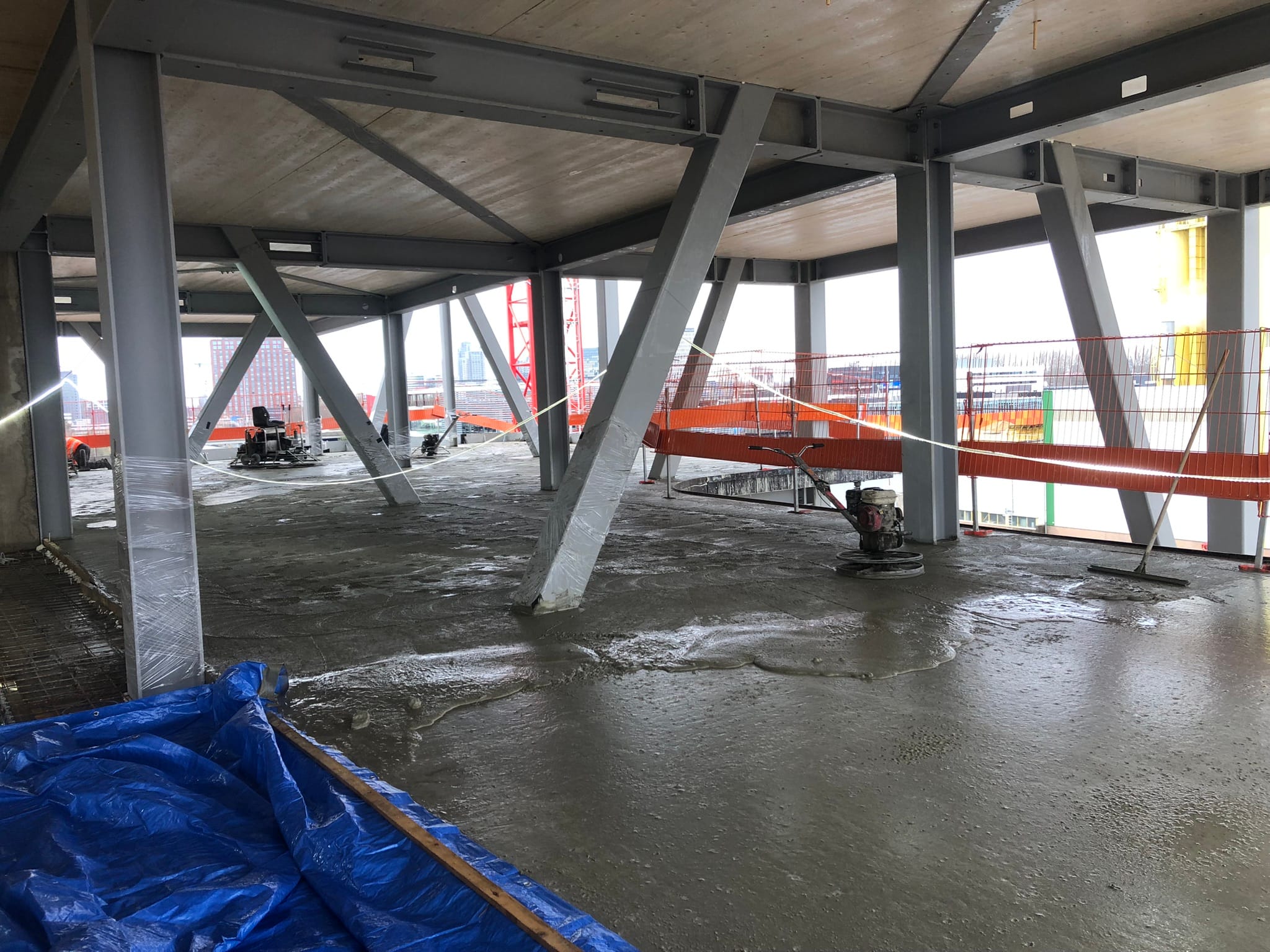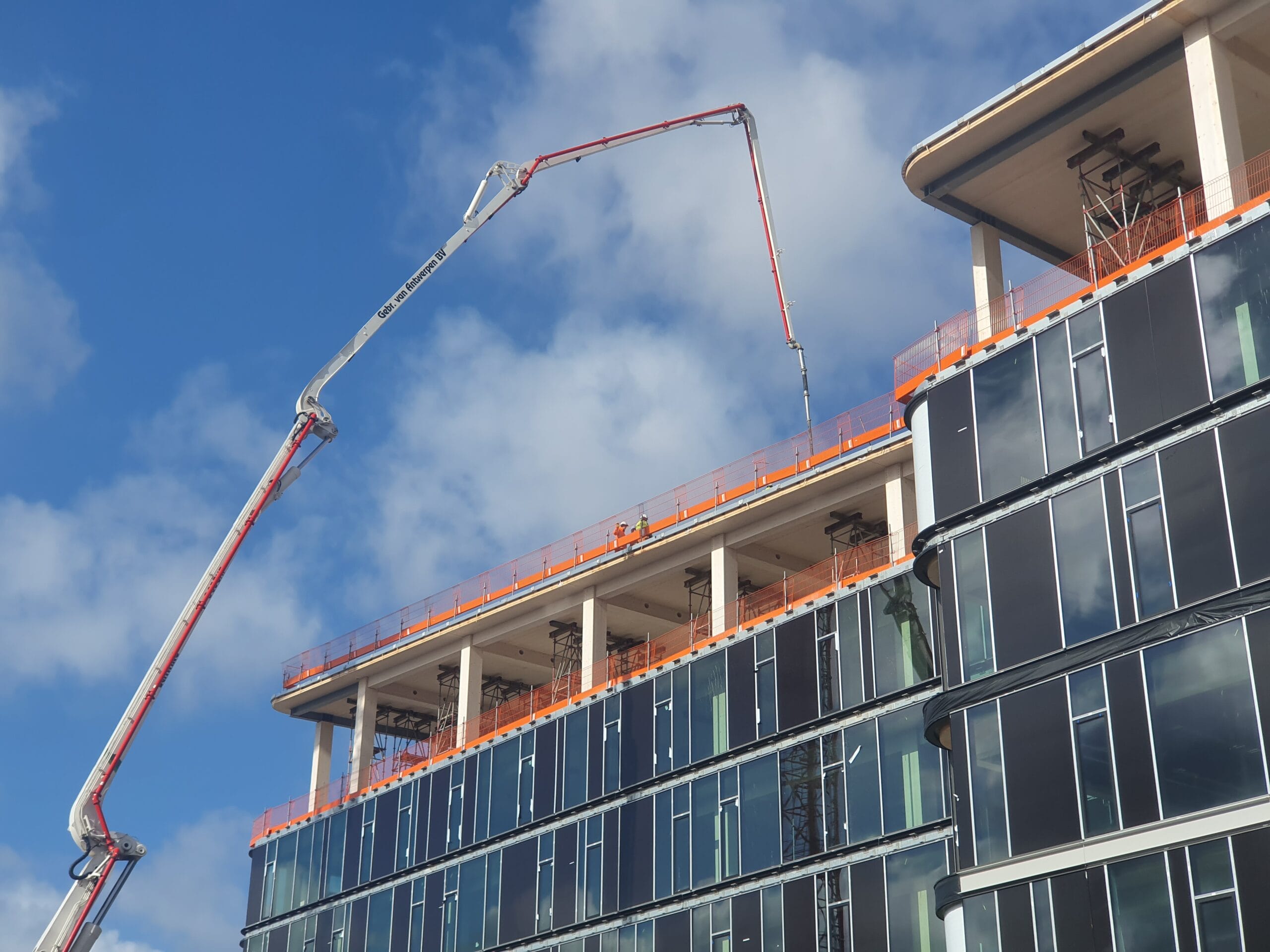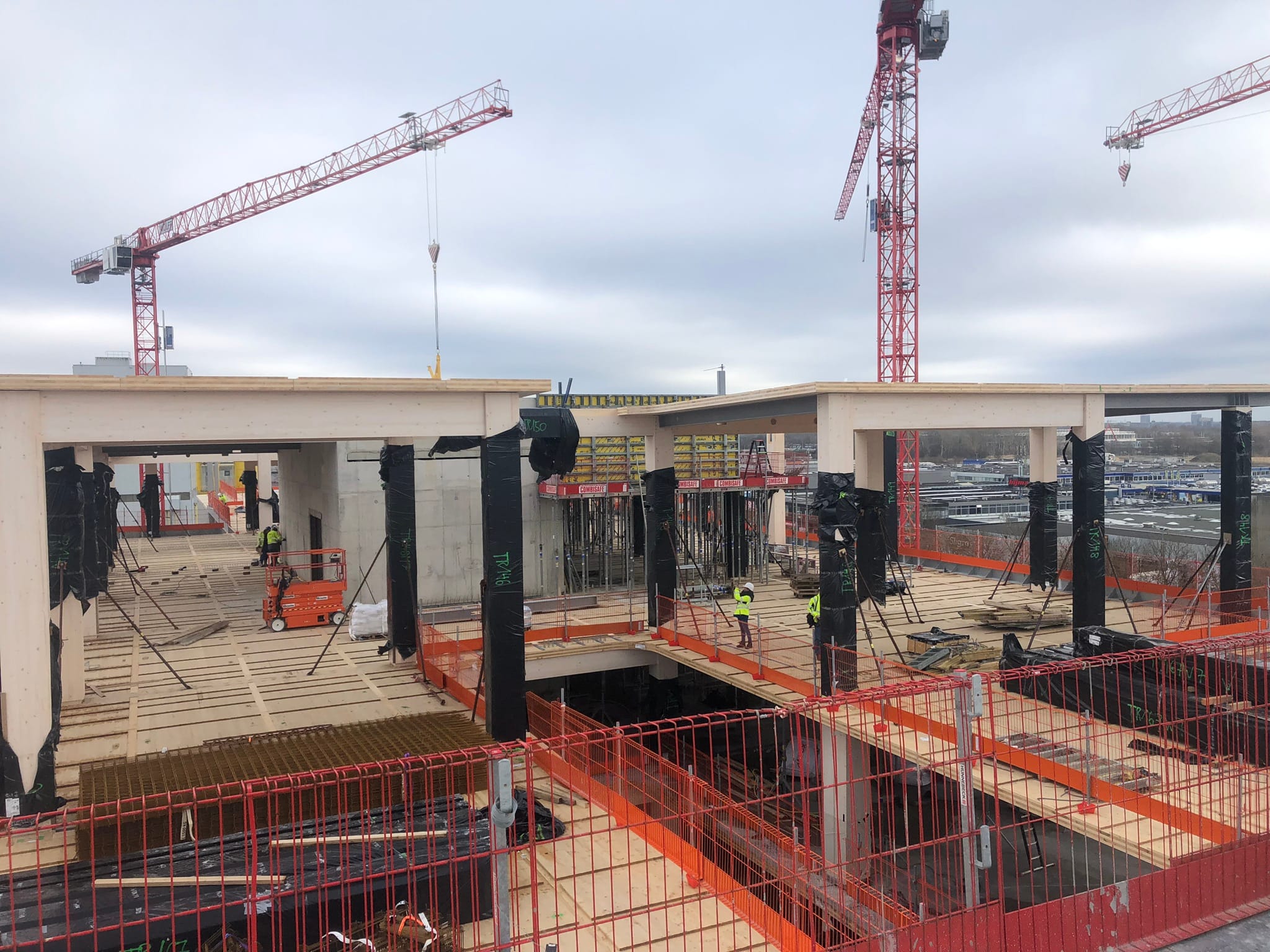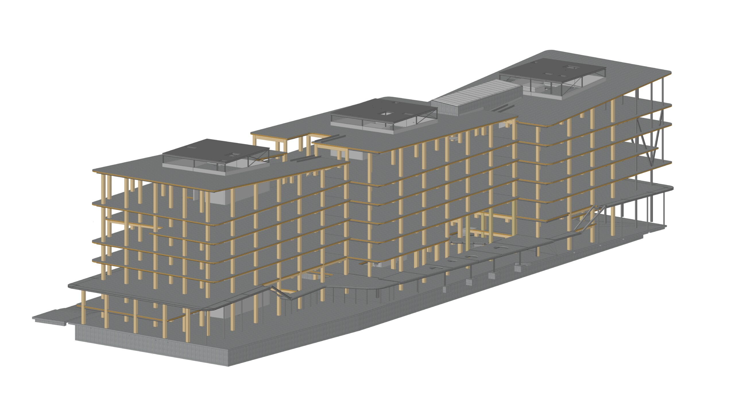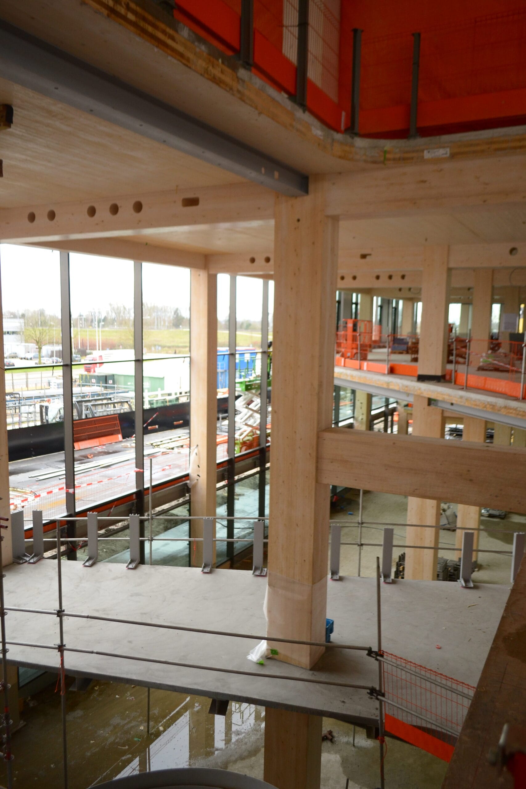 Most of the columns and beams of the superstructure are made of glued laminated timber. The floors are made of a state-of-the-art technology called timber-concrete composite structures, consisting of a concrete compression layer on top of CLT panels. Combining the advantages of concrete and timber slabs, this technology allows large spans to be covered while limiting the weight of the floor. By using timber-hybrid building methods, the aim is to achieve a BREEAM Outstanding certificate, which is the highest sustainable building benchmark of the Dutch Green Building Council.