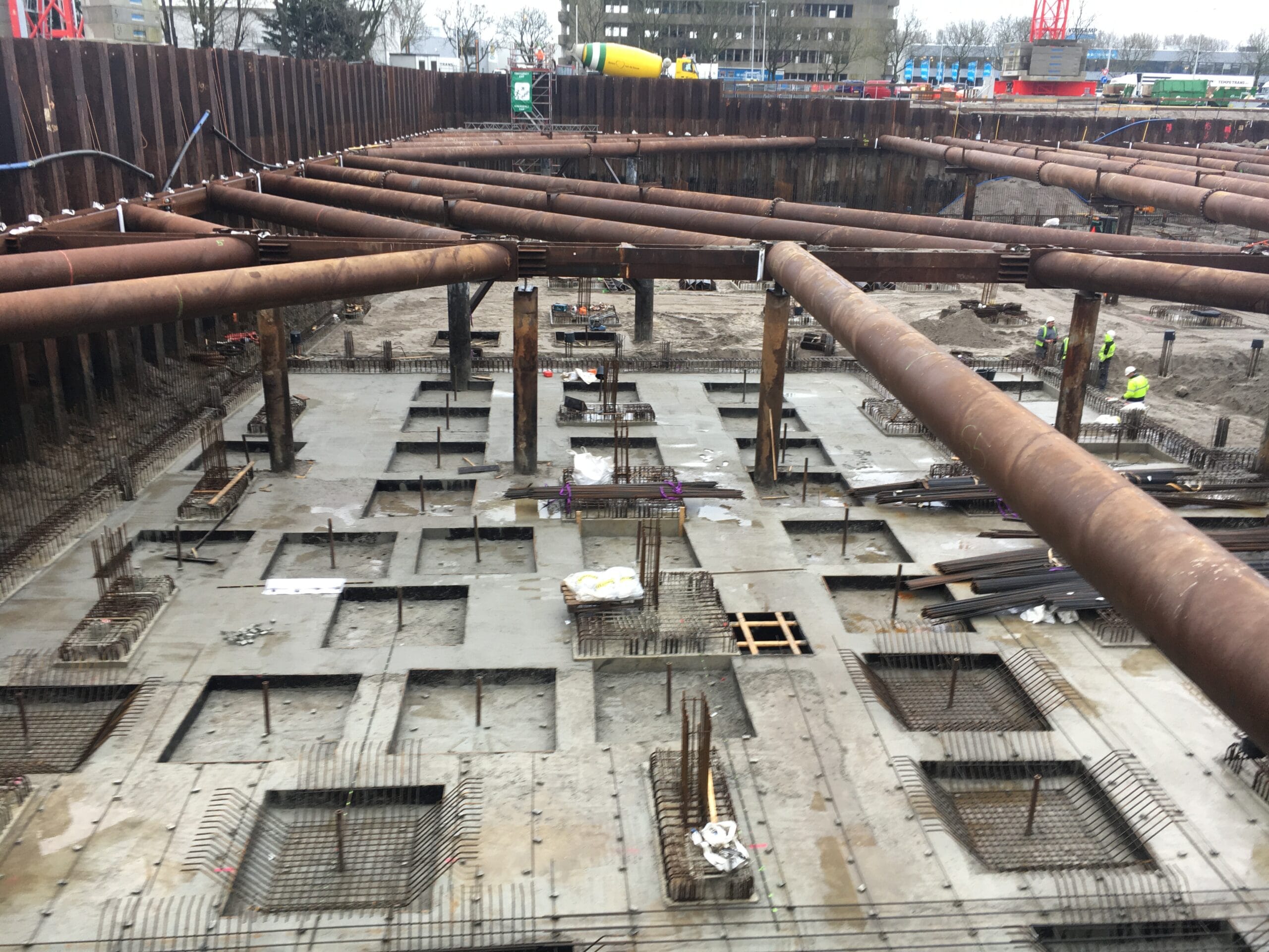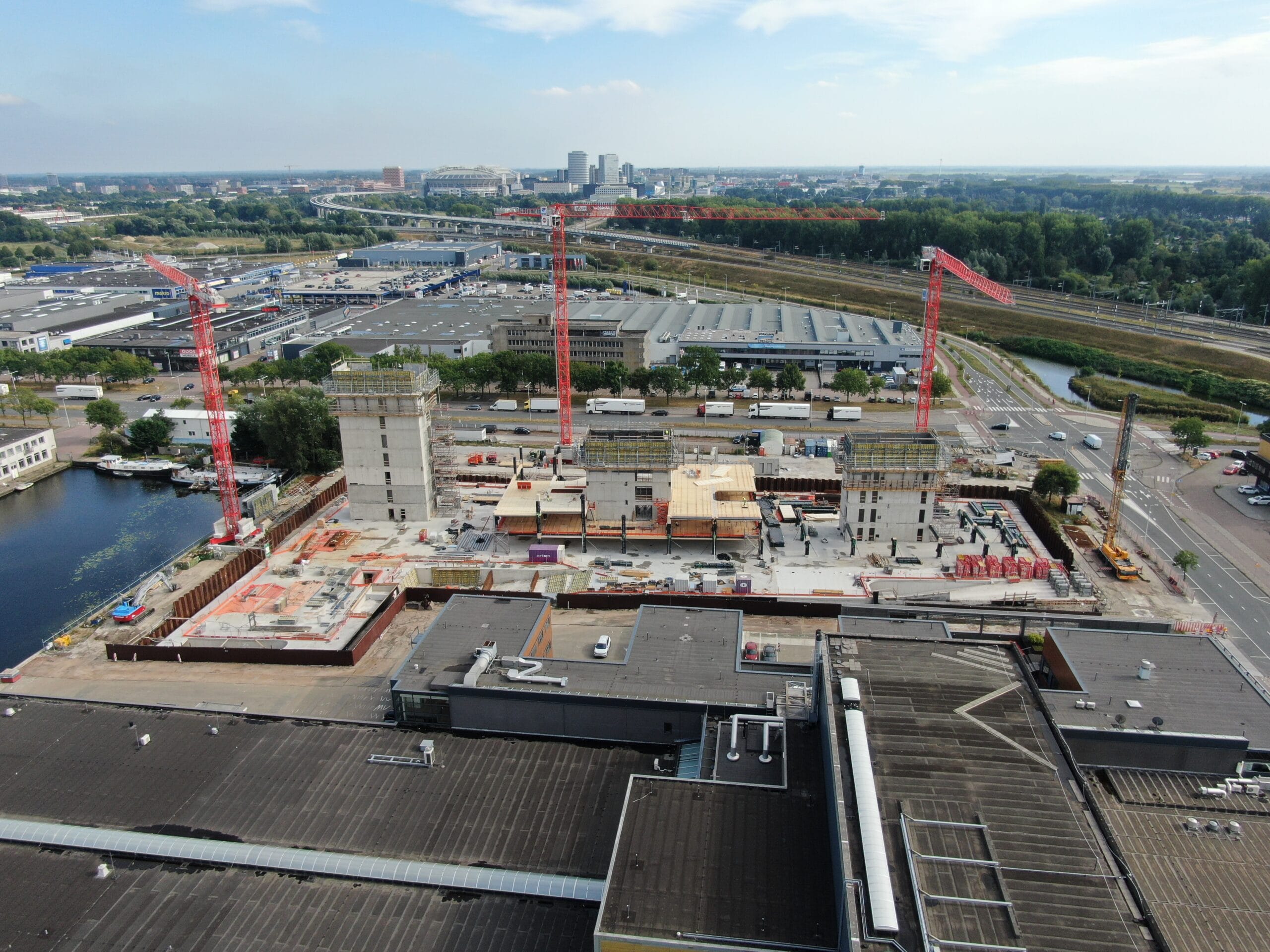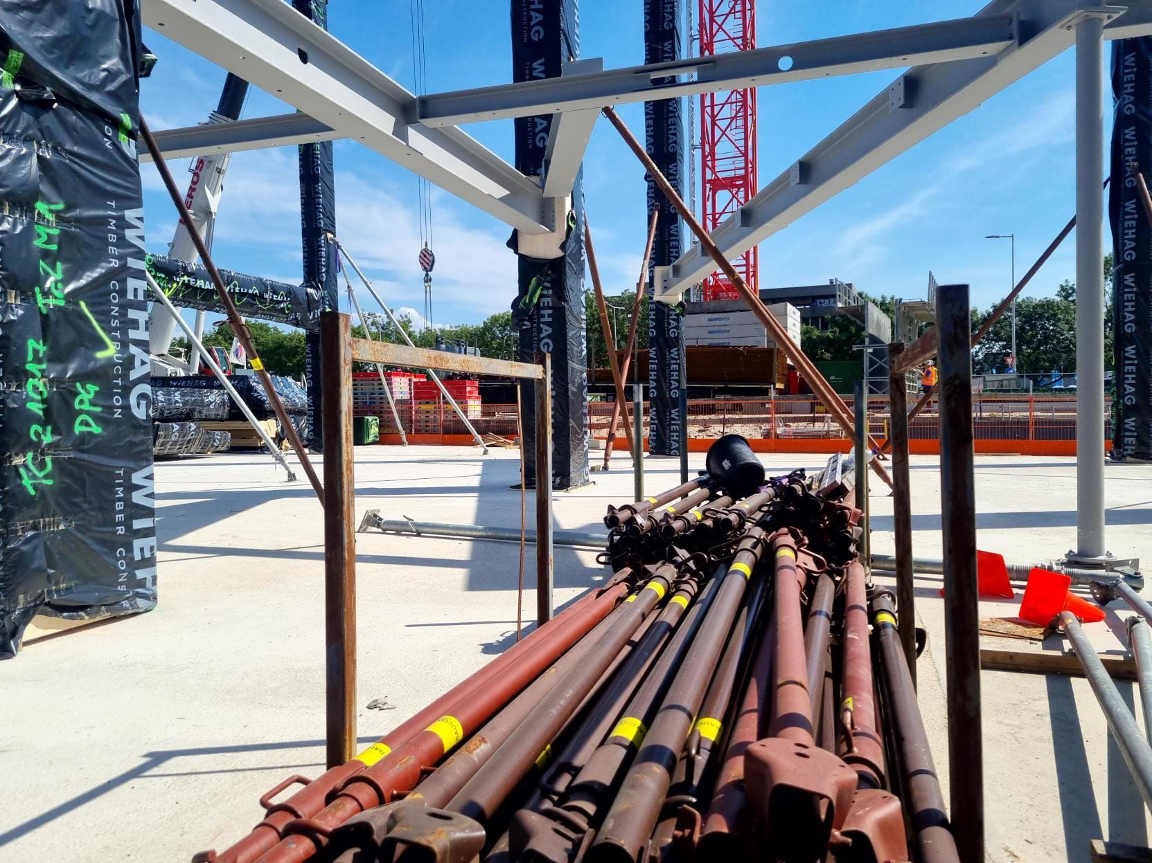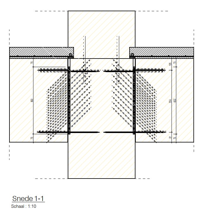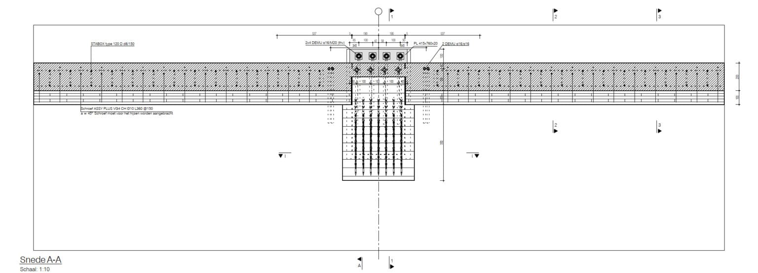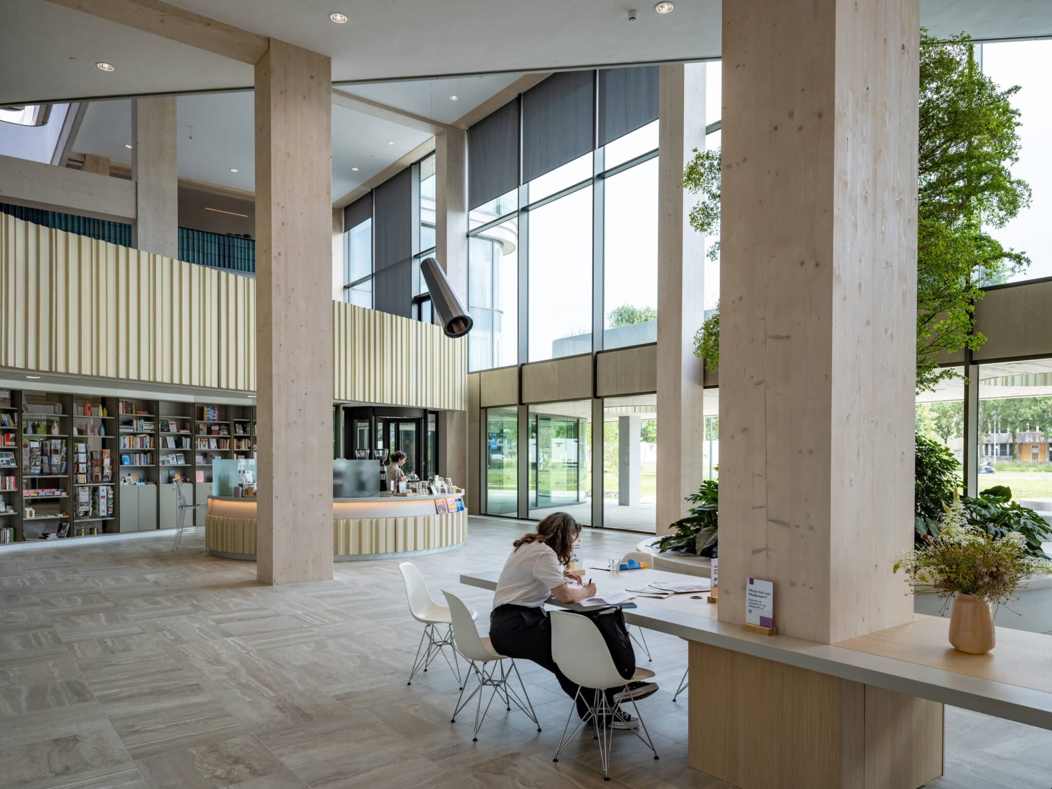 Most of the columns and beams of the superstructure are made of glued laminated timber. The floors are made of a state-of-the-art technology called timber-concrete composite structures, consisting of a concrete compression layer on top of CLT panels. Combining the advantages of concrete and timber slabs, this technology allows large spans to be covered while limiting the weight of the floor. By using timber-hybrid building methods, the aim is to achieve a BREEAM Outstanding certificate, which is the highest sustainable building benchmark of the Dutch Green Building Council.