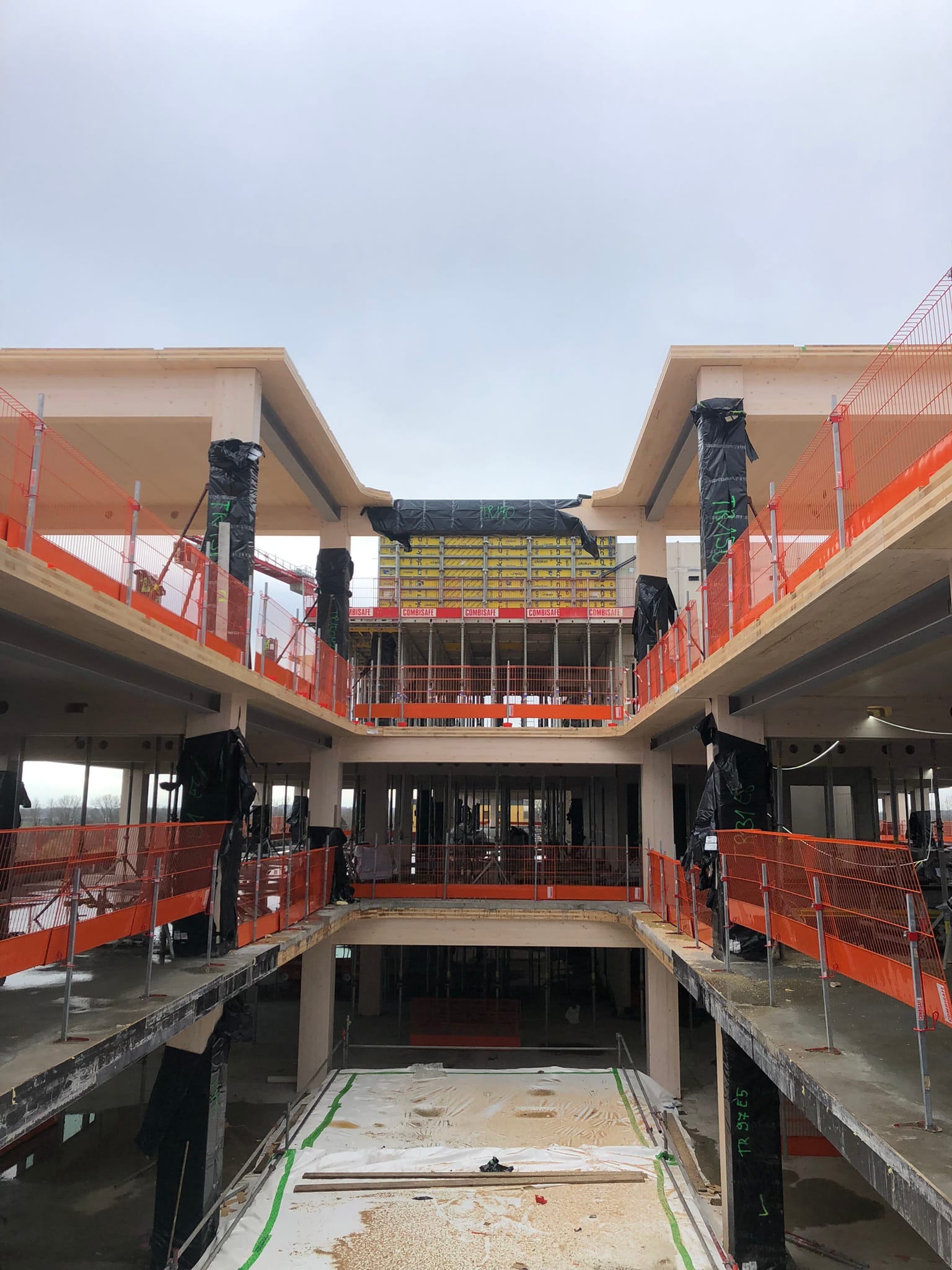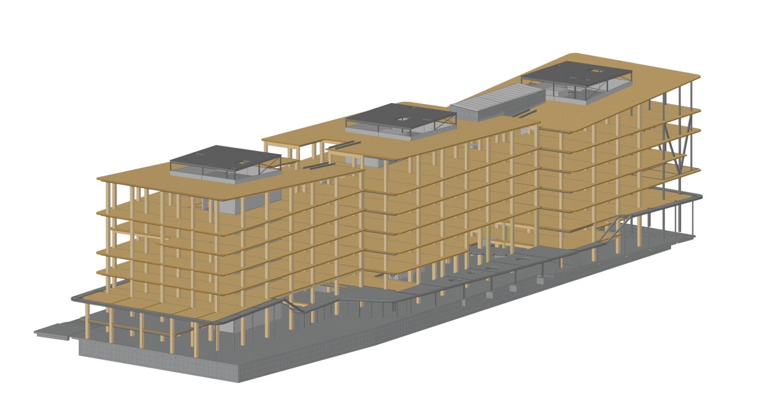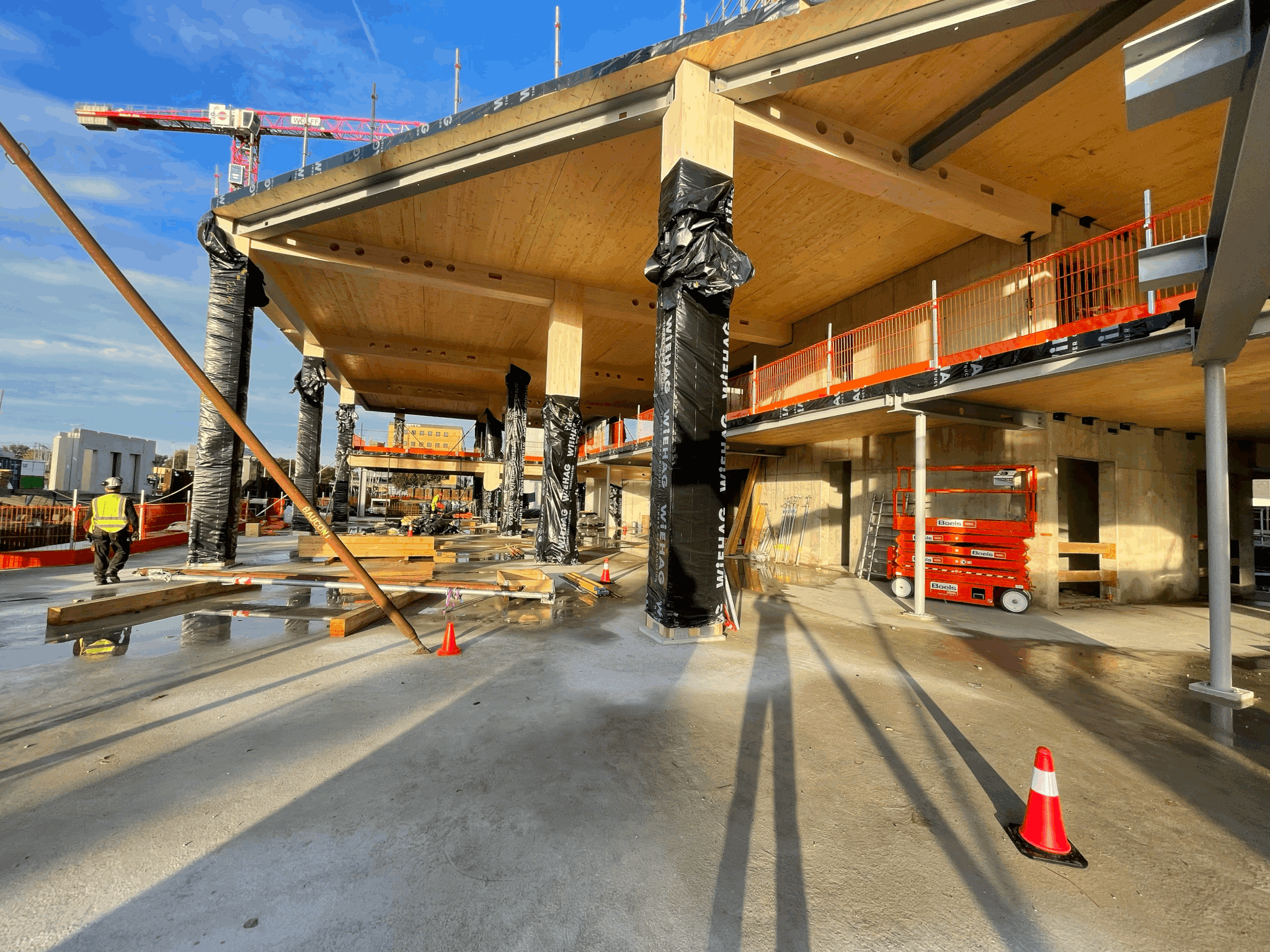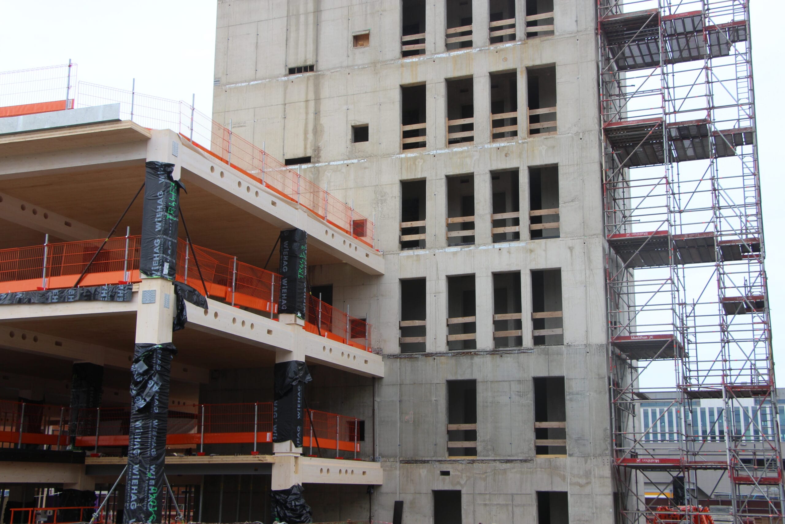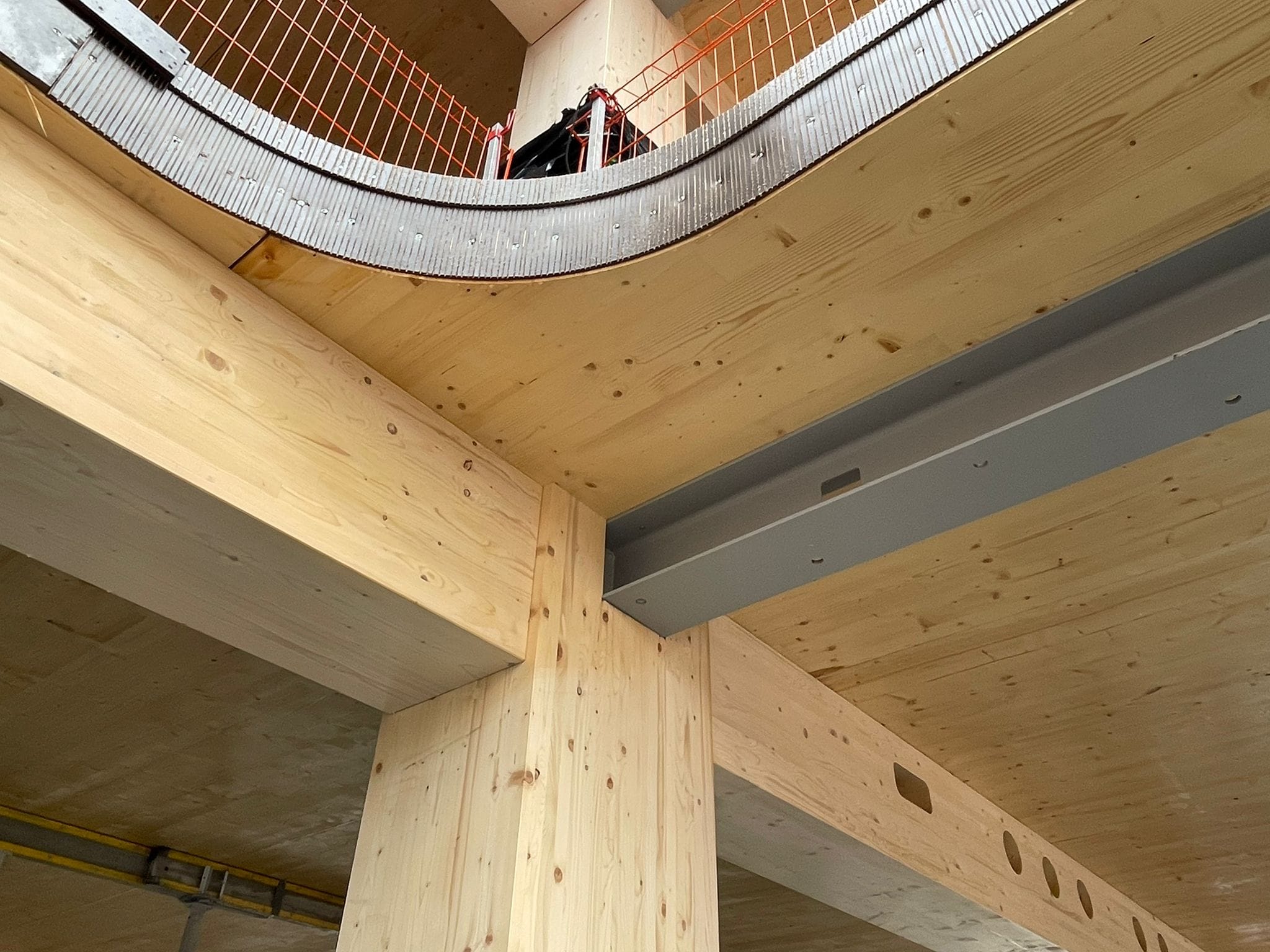 The majority of the columns and beams of the superstructure are made of glued laminated timber. The floors are made of a state-of-the-art technology called timber-concrete composite structures, consisting of a concrete compression layer on top of CLT panels.