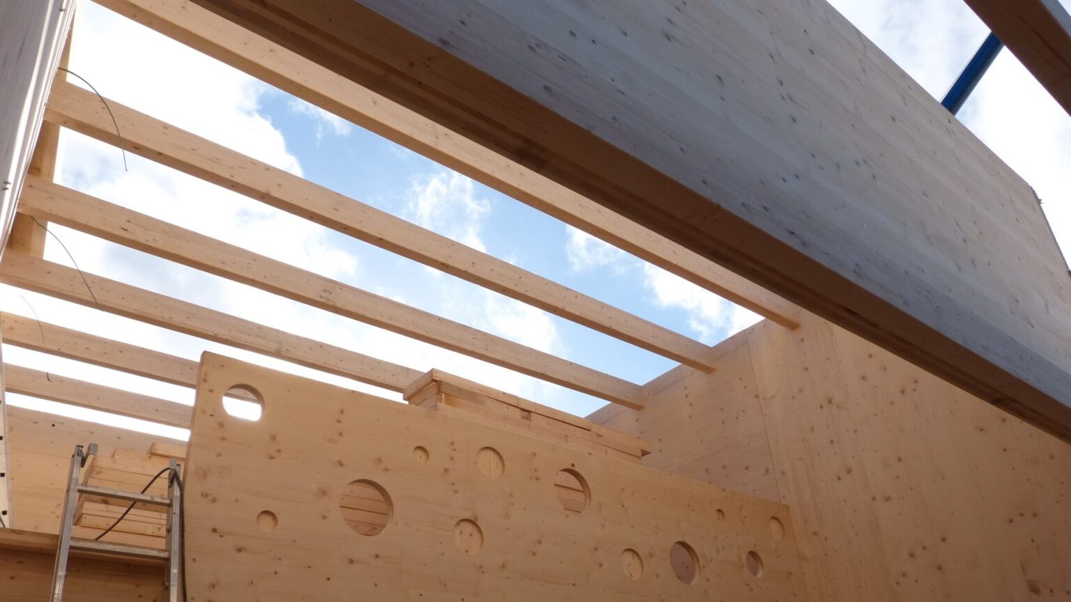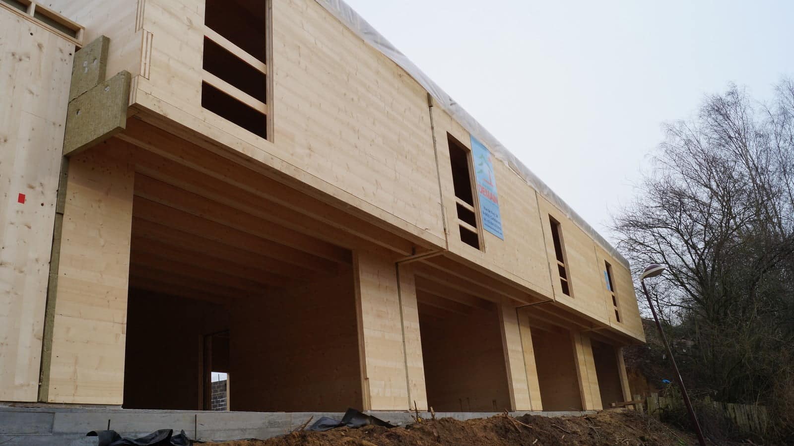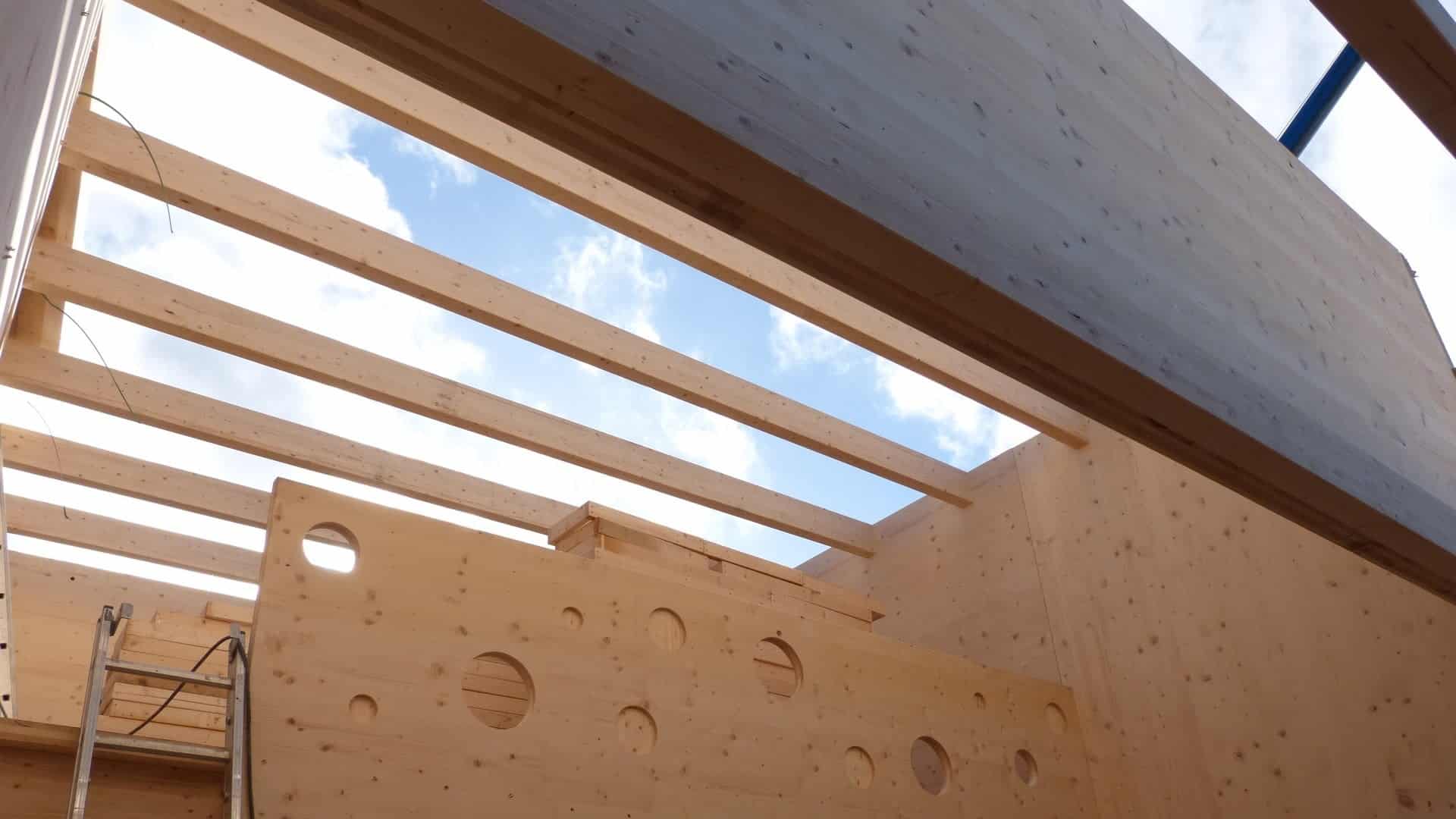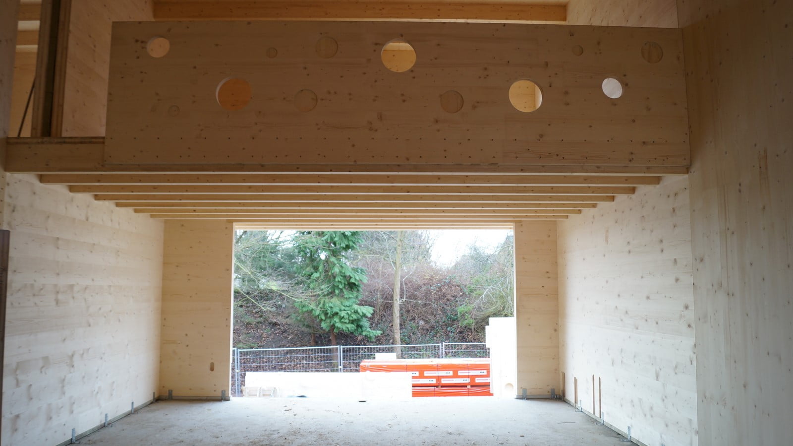 The structure is designed R60 (fire resistance of 60 minutes) with the interior face of the CLT visible as well as the mezzanine parapet with its multiple openings