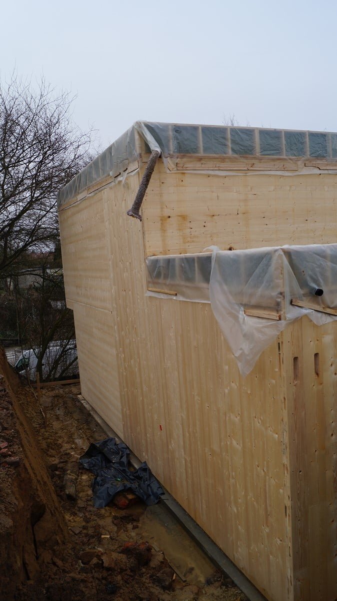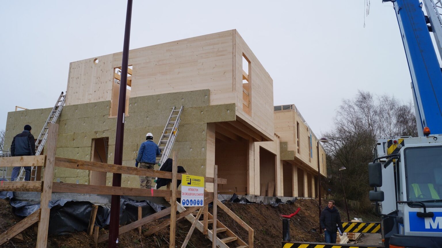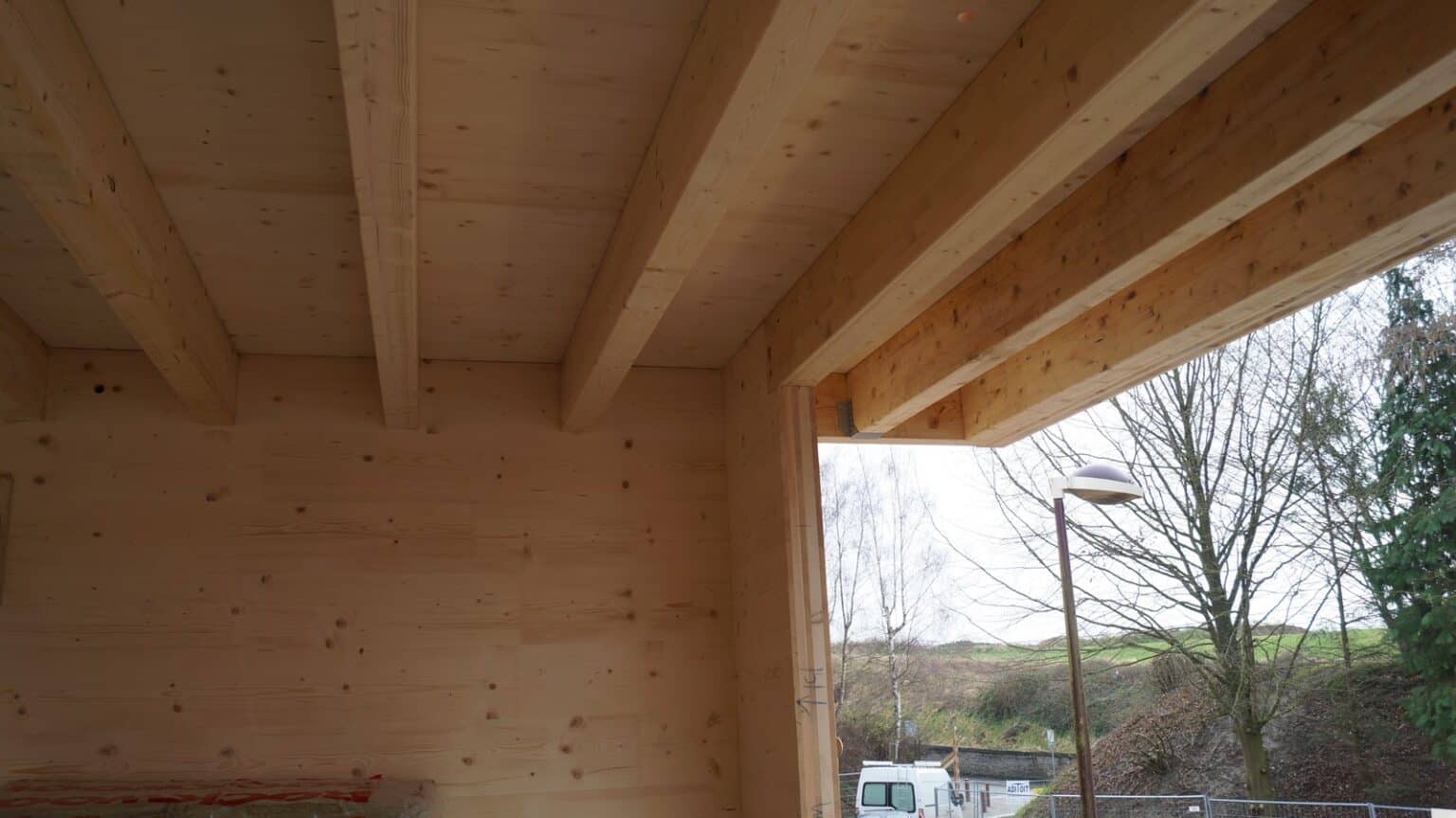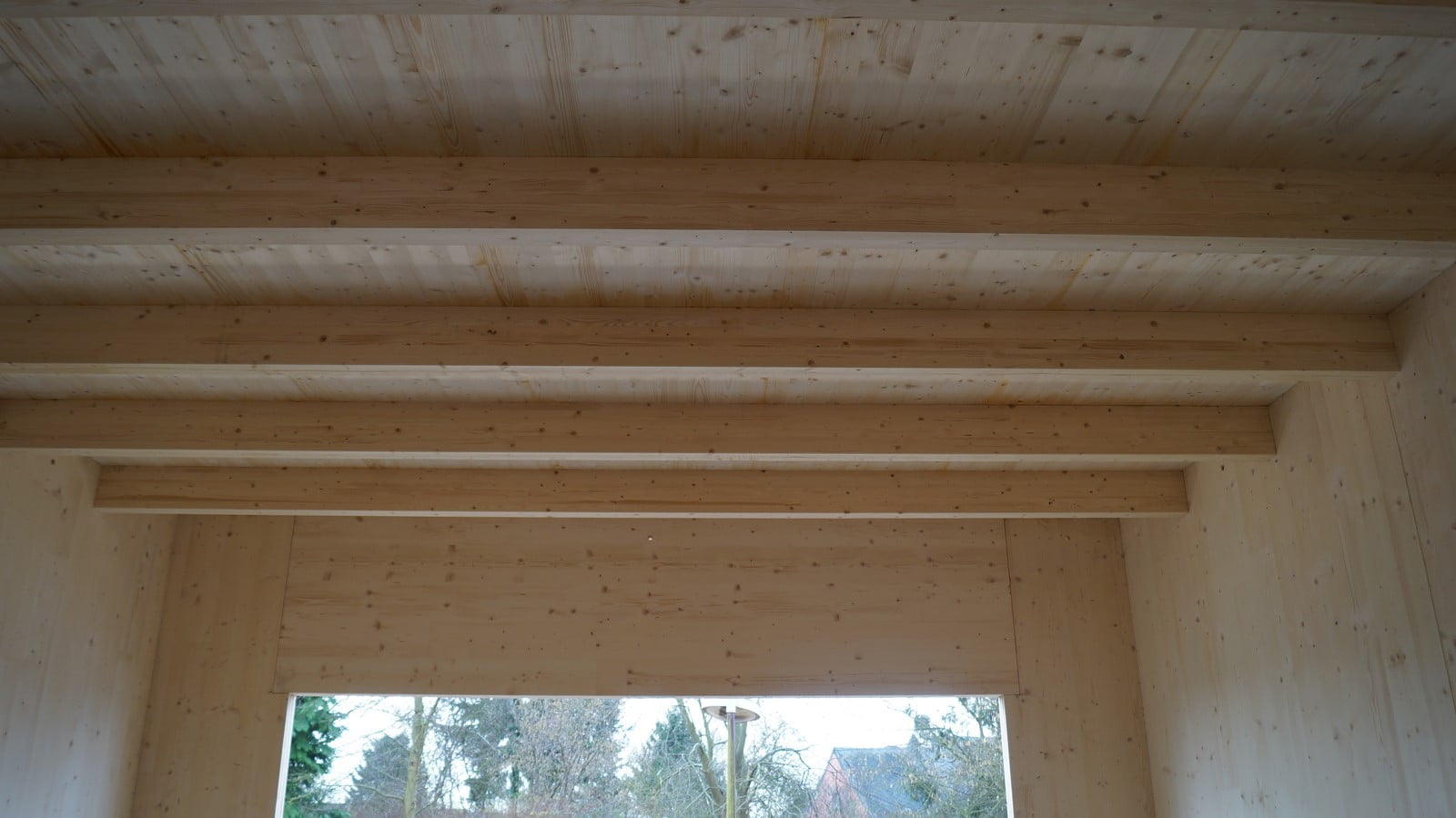 The structure is designed R60 (fire resistance of 60 minutes) with the interior face of the CLT visible as well as the mezzanine parapet with its multiple openings