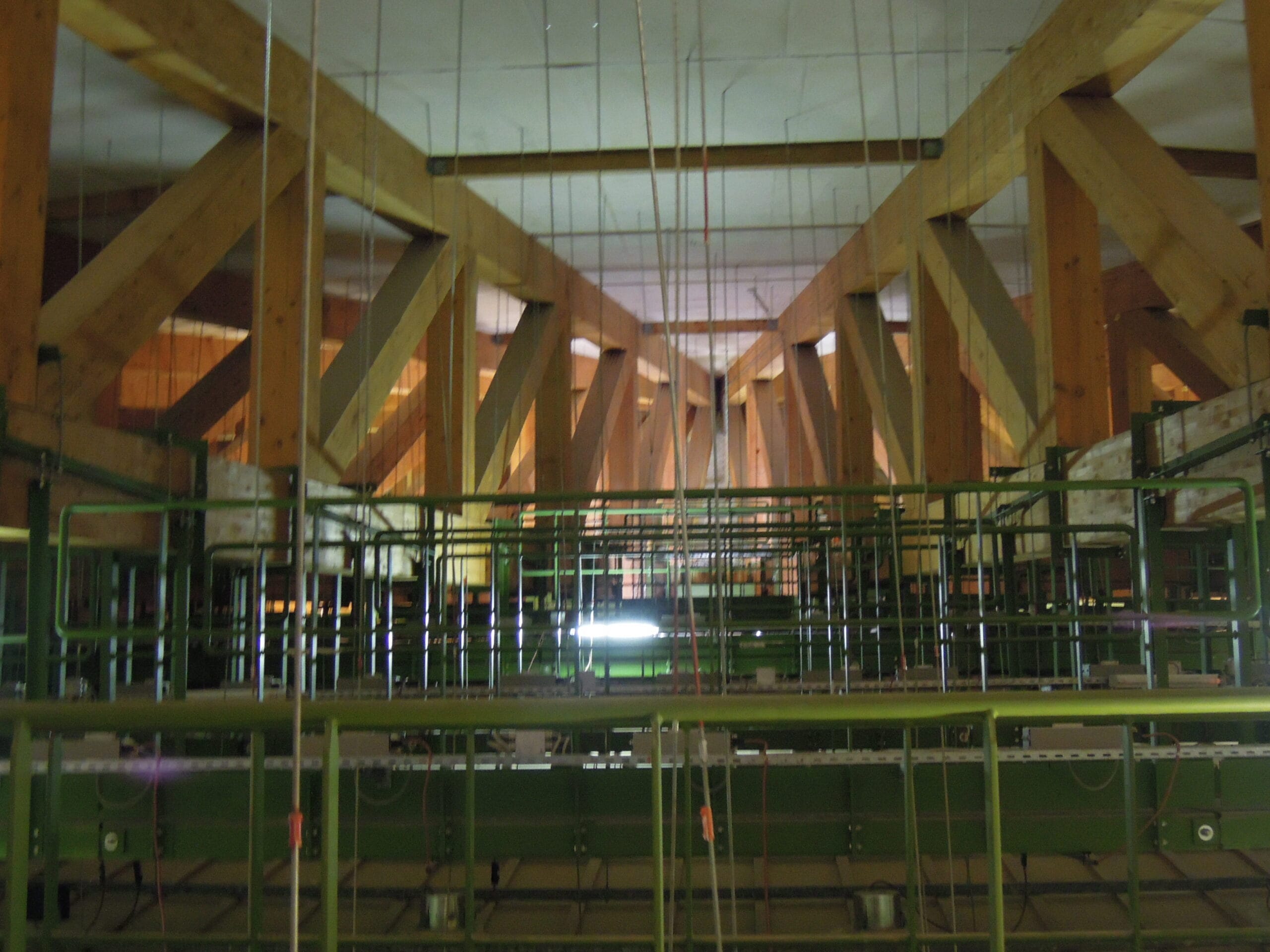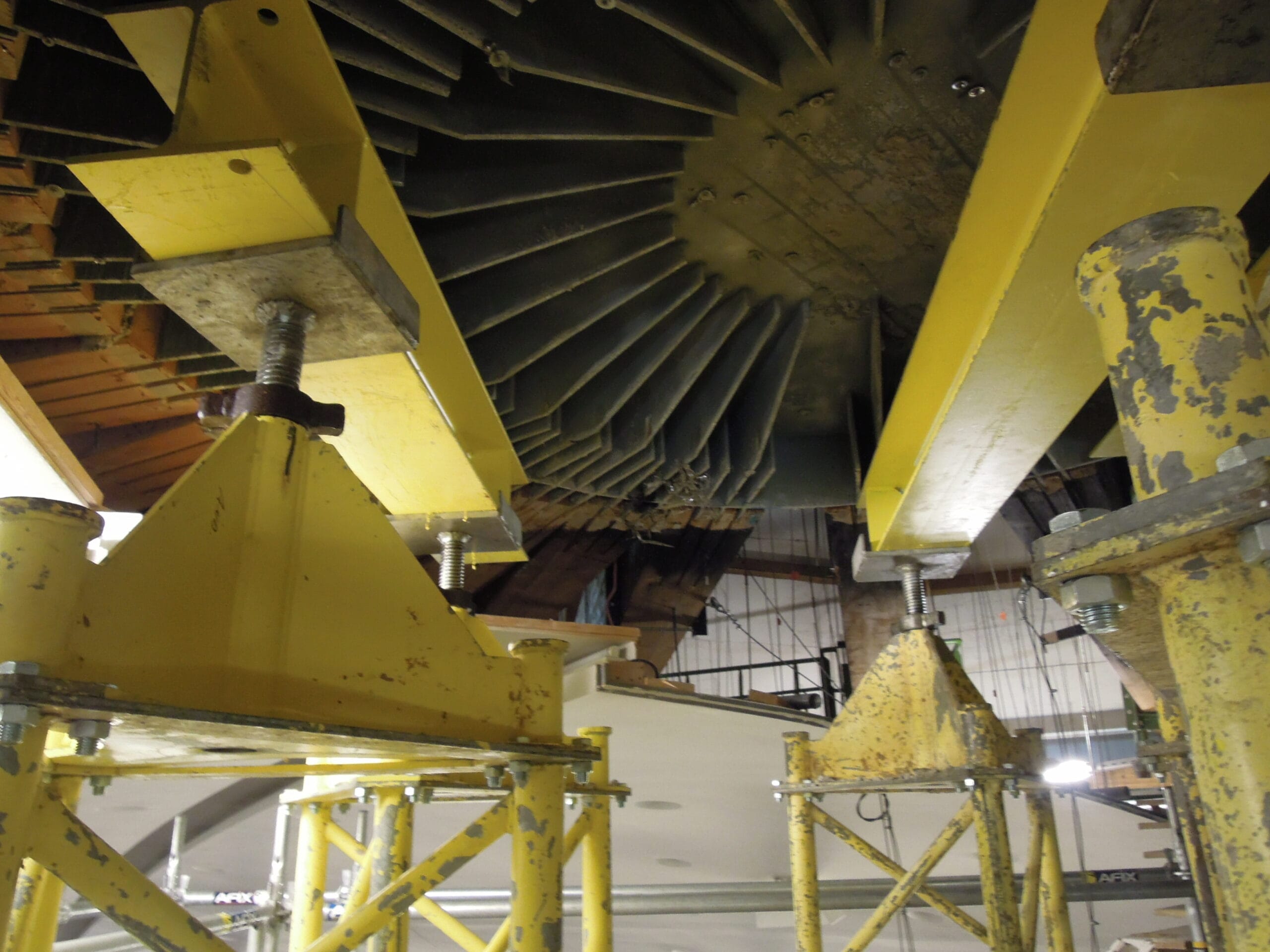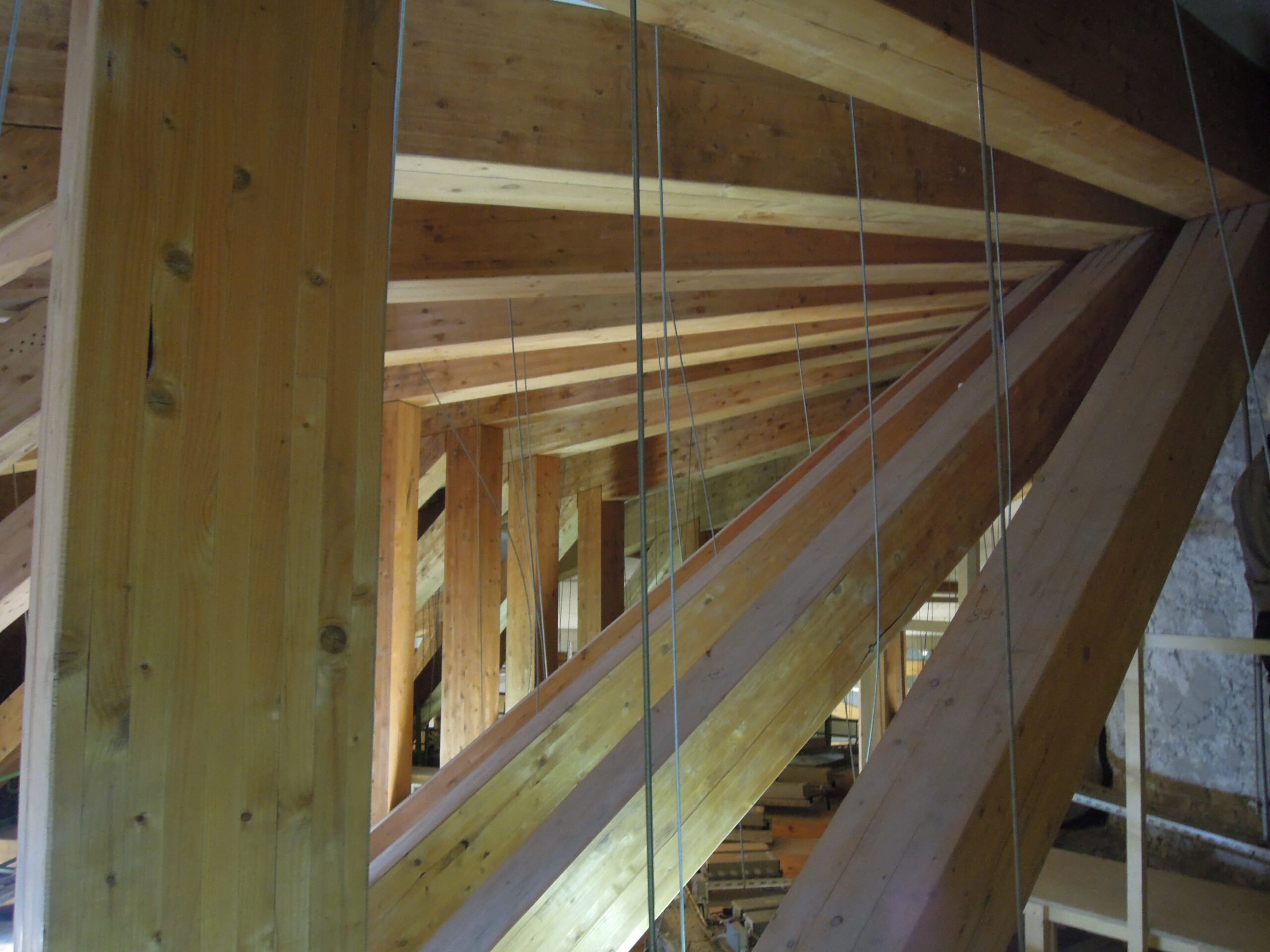 The roof structure of the Hemicycle consists of 22 glulam lattice girders arranged radially around a metal core. During an inspection of the ceilings, significant damages were discovered at certain joints. A complete analysis of the existing structure and a check based on current codes revealed a critical sensitivity of the structure to displacement of the supports due to its hyperstaticity. The new distribution of forces within the structure led to stresses being exceeded at certain joints, to the point of failure. Various repair and reinforcement options were studied, leading to the complete doubling of the structure with a steel frame. The glulam beams were completely unloaded using a complex jacking system.