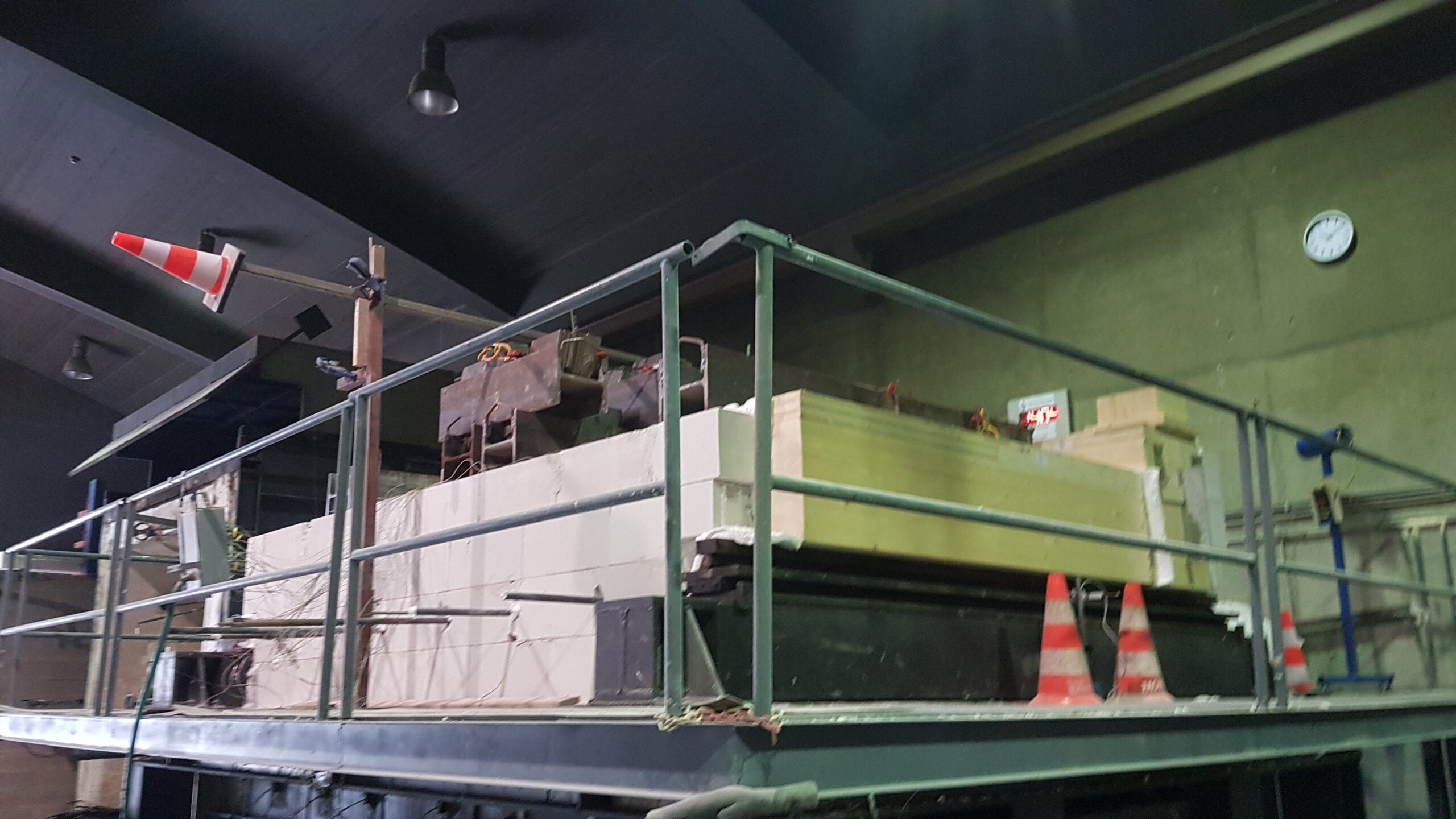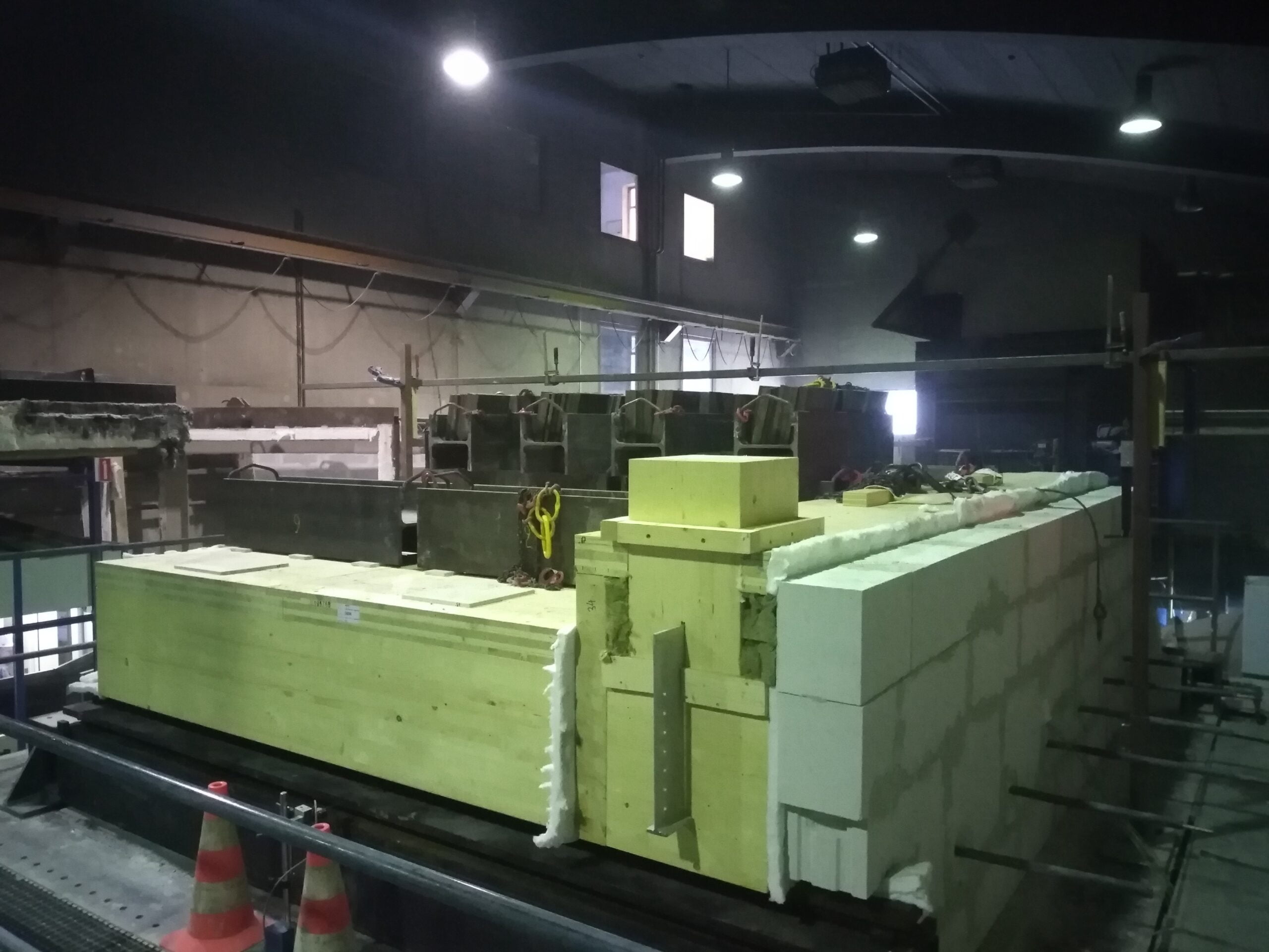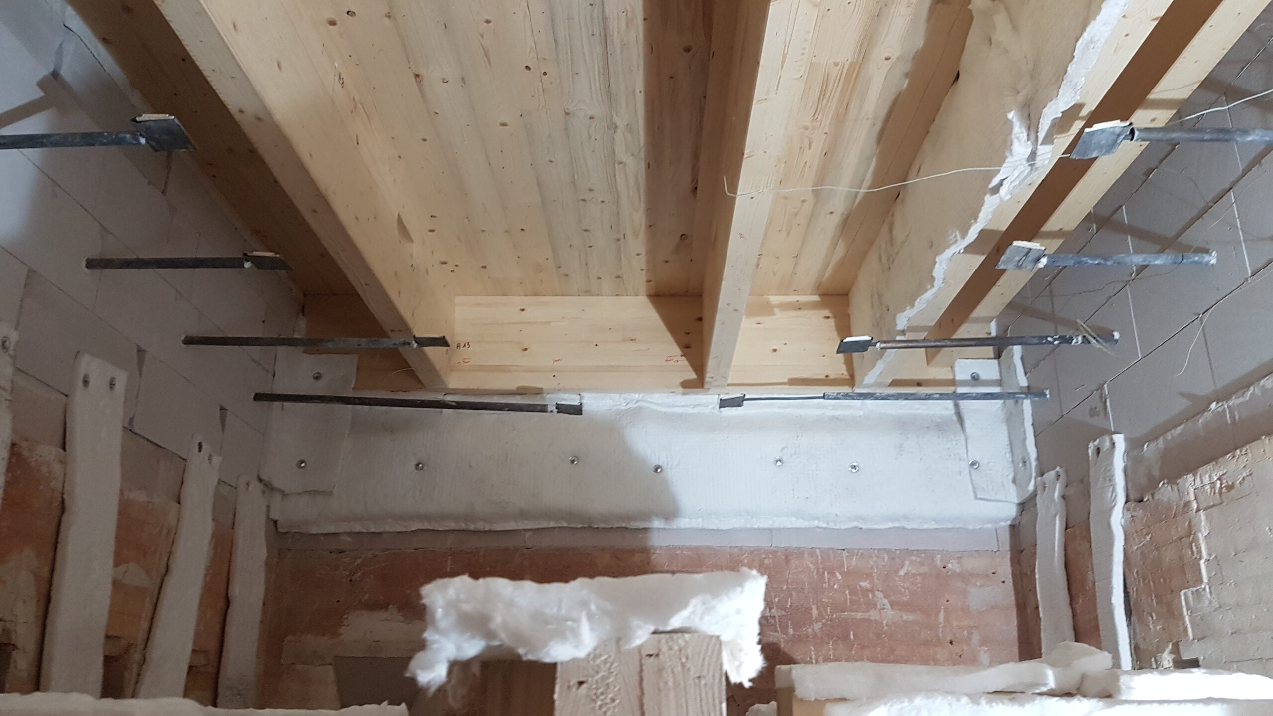 When necessary, it was chosen to work with an intumescent transparent paint specially developed for wood. Many products exist on the market to improve the fire reaction of wood but it was not easy to find a paint that improves the fire resistance with technical datas to understand how to calculate the impact of this painting over the timber section during fire. The painting found had valid datas for a floor with a certain load and span. As these assumptions were not met, the project configuration was tested to validate that the values used were still applicable and so a fire test on a real scale mock-up of the floor has been performed in order to validate the complex.