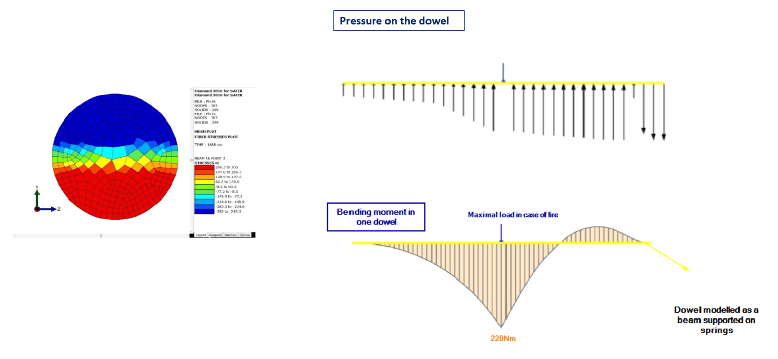 In case of fire, the behaviour of the timber depends not only on the temperature of the material but also on the type of solicitation (tension, shear, …). To be able to determine the load bearing capacity of a dowel, we modelled a beam (the dowel) supported by stiffeners whose stiffness varies along the dowel according to the evolution of the mechanical properties of the wood. The stiffener was thus representing the behavior of the wood depending on its temperature.