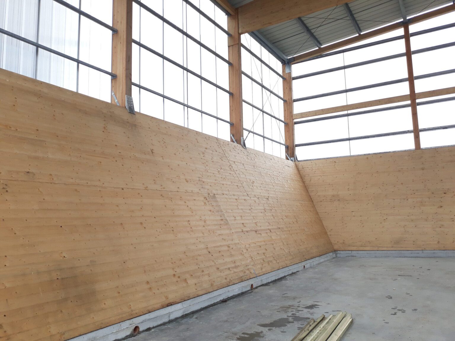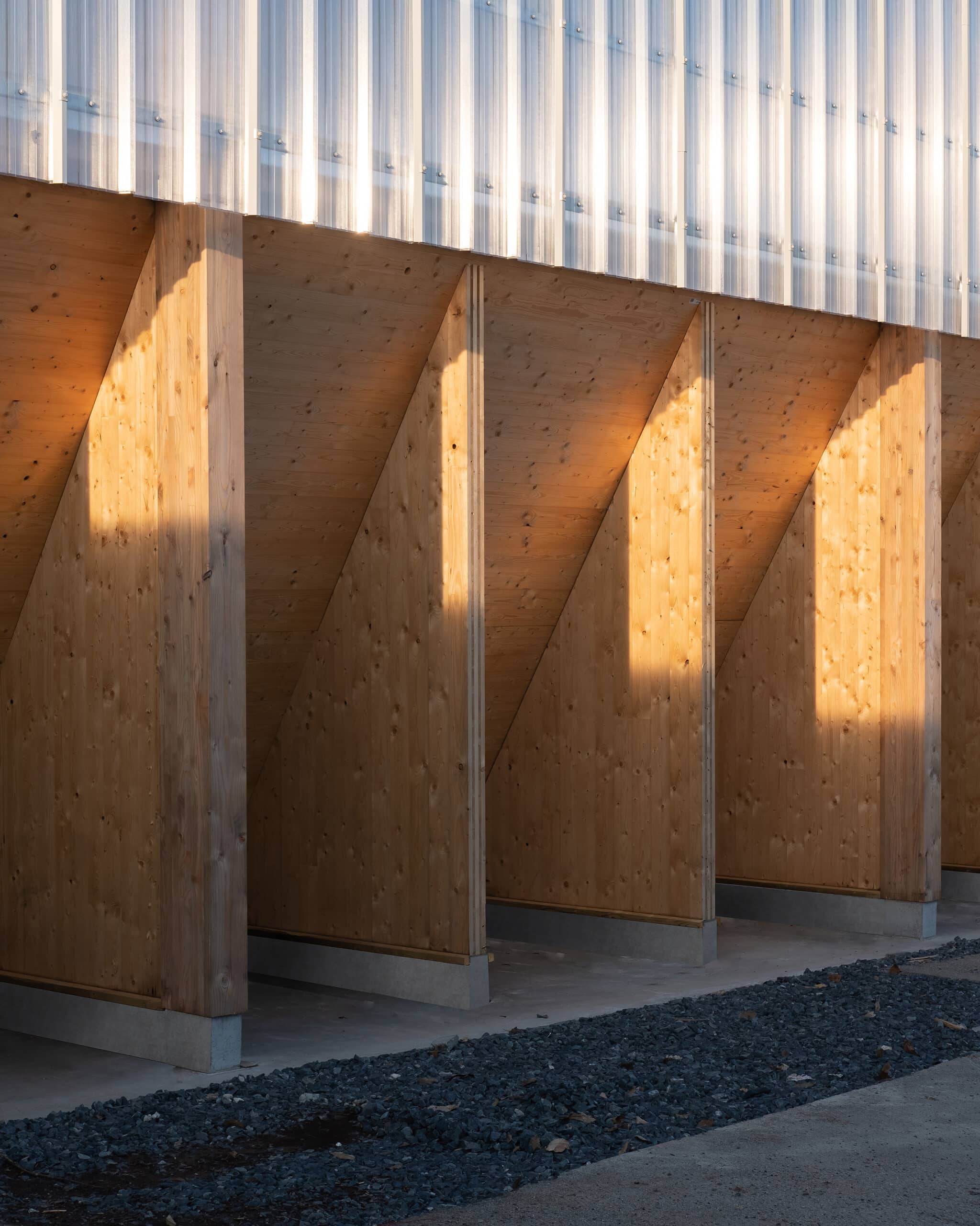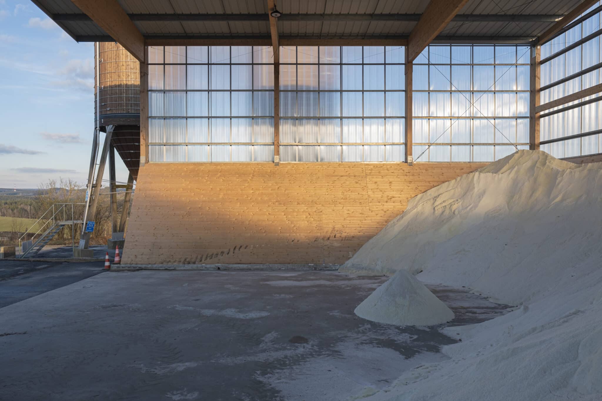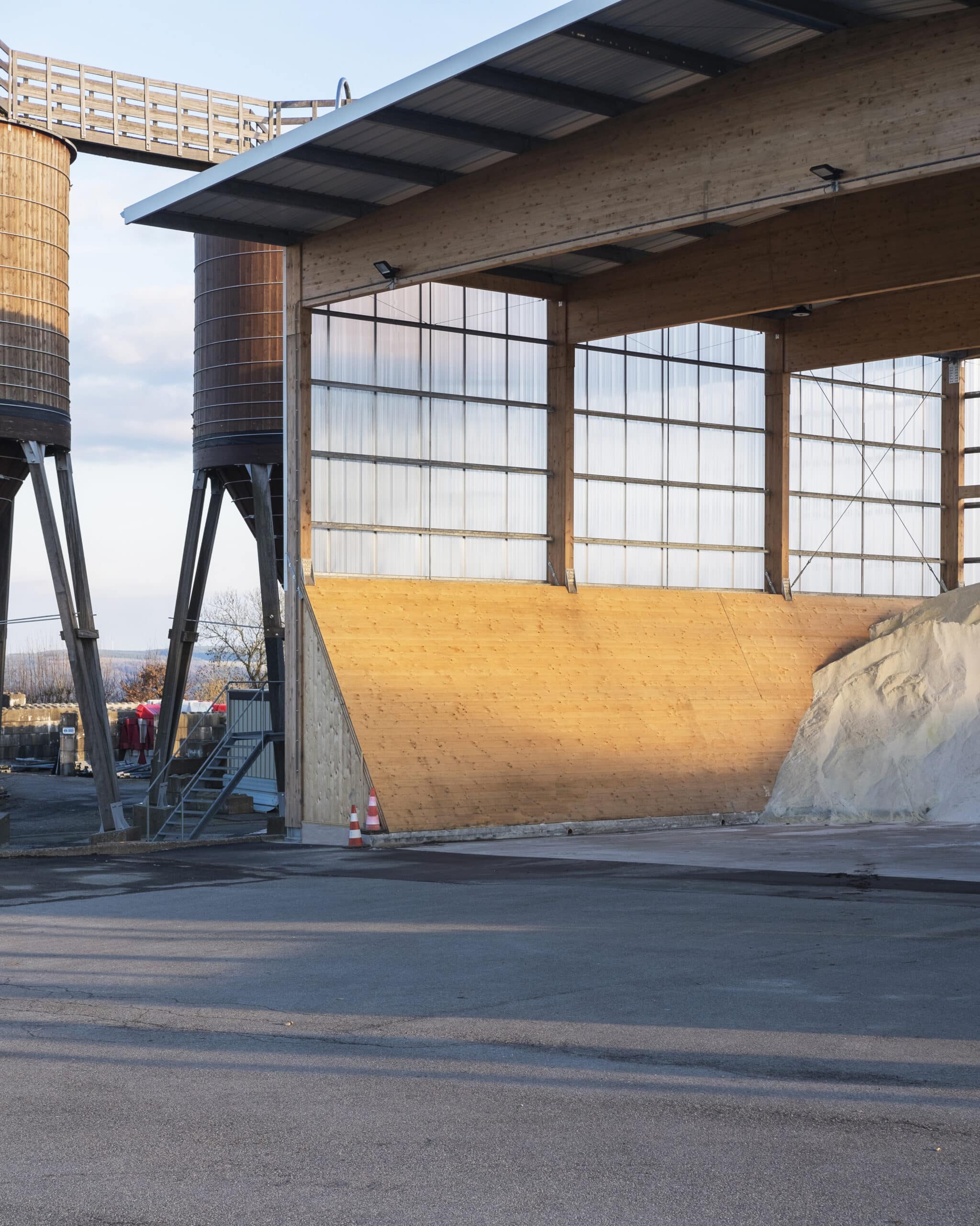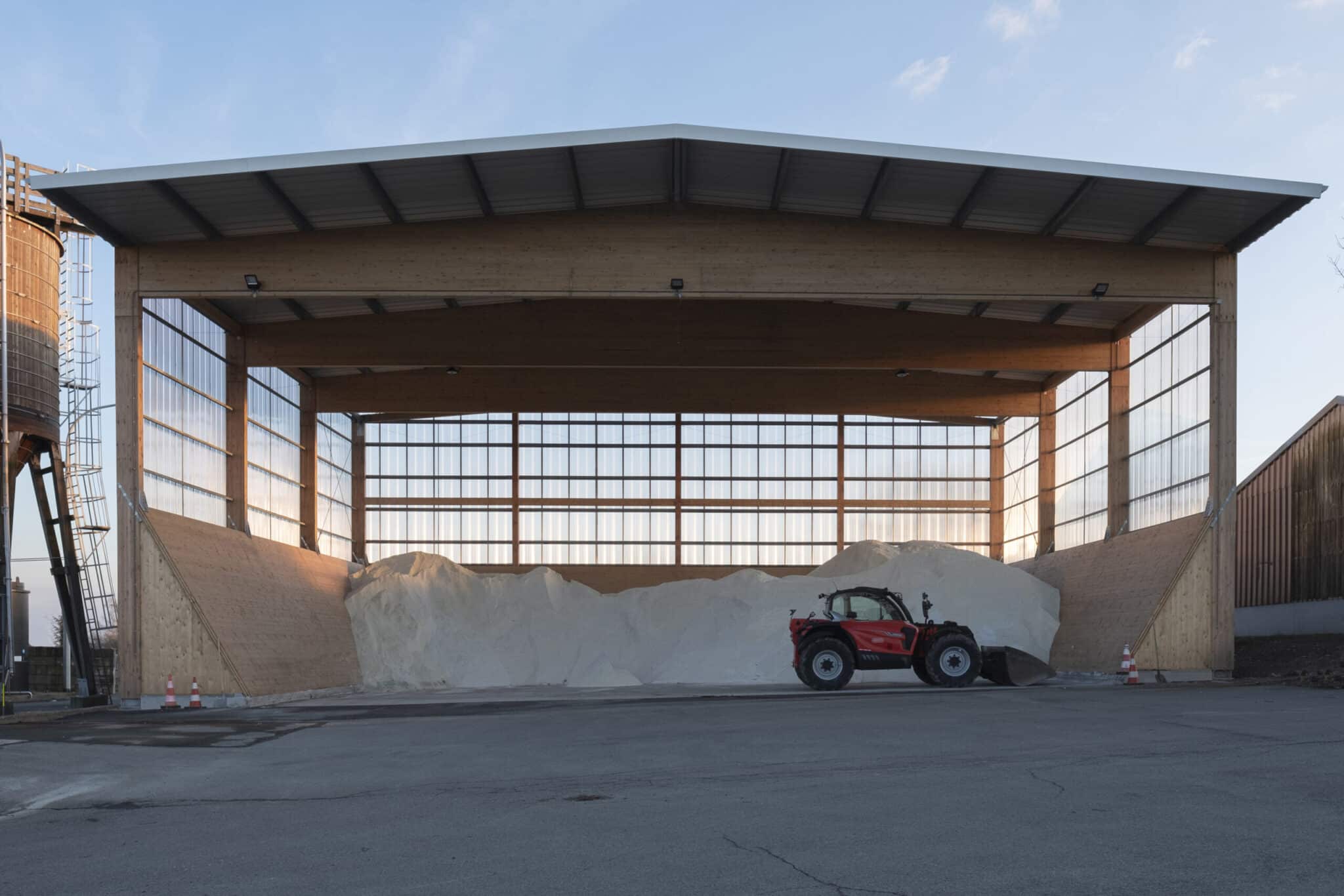 The “Hangar à sel de Houffalize” is a 440 m² (18,5 m x 24 m) warehouse dedicated to the storage of salt that will be spread on the roads during winter frosts. The load bearing structure consists of four timber frames and of 3 inclined CLT walls that are in contact with the salt. The CLT panels play a major role in the wind stabilization of the frames and of the entire structure. The CLT walls are supported by 31 CLT triangles that bring the vertical loads to the foundations. These triangles are covered with a finition to protect them form the weather. The rest of the structure is protected with a transparent polycarbonate cladding. We chose to make the structure in timber because it was economically competitive and because, unlike steel or concrete, wood does not suffer from contact with road salt.
