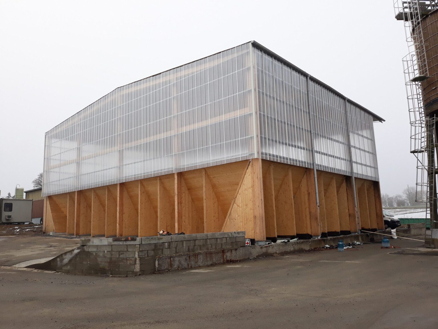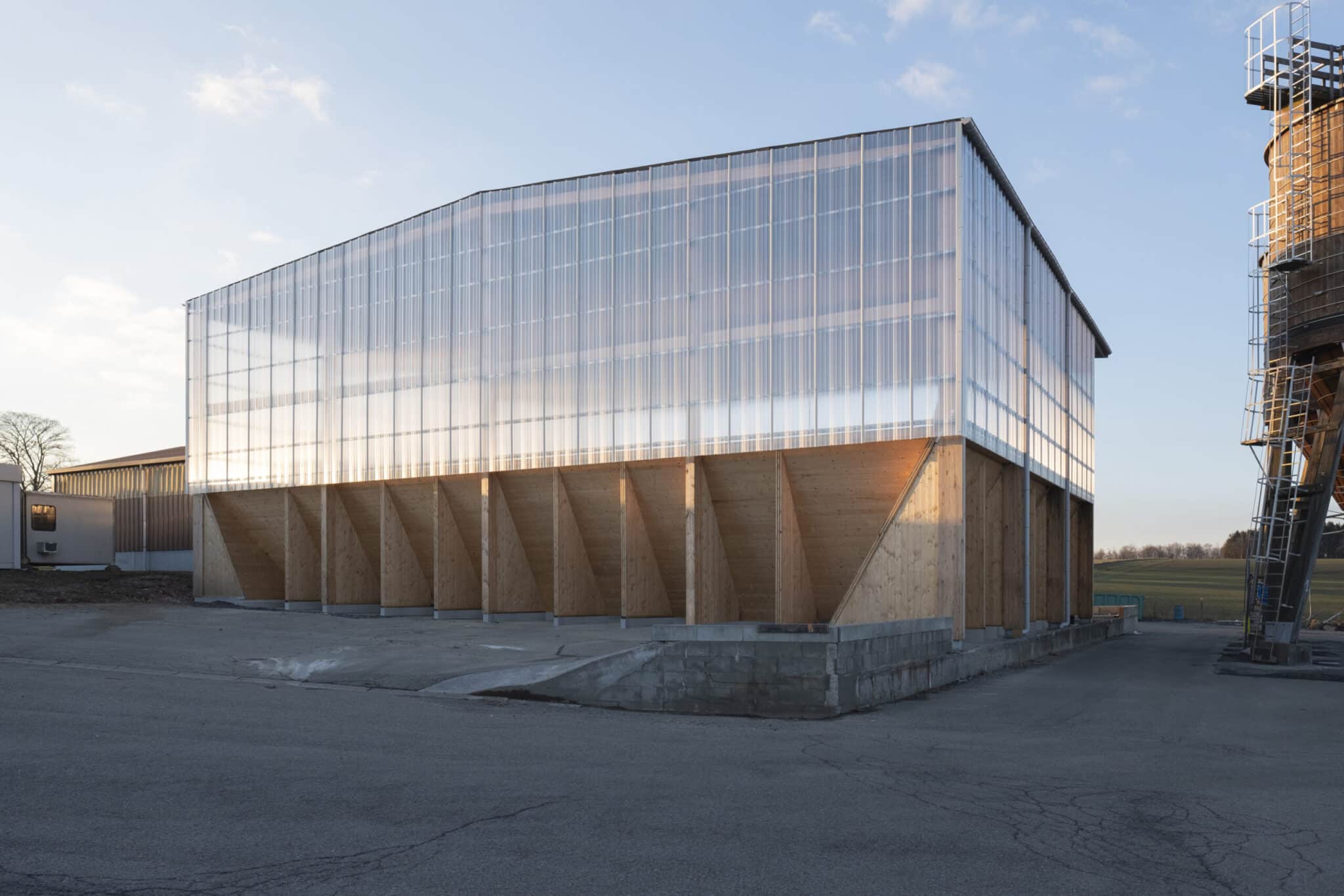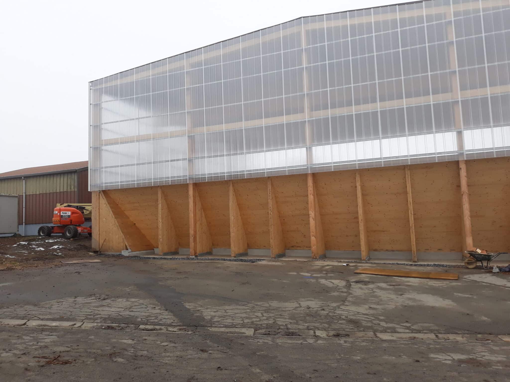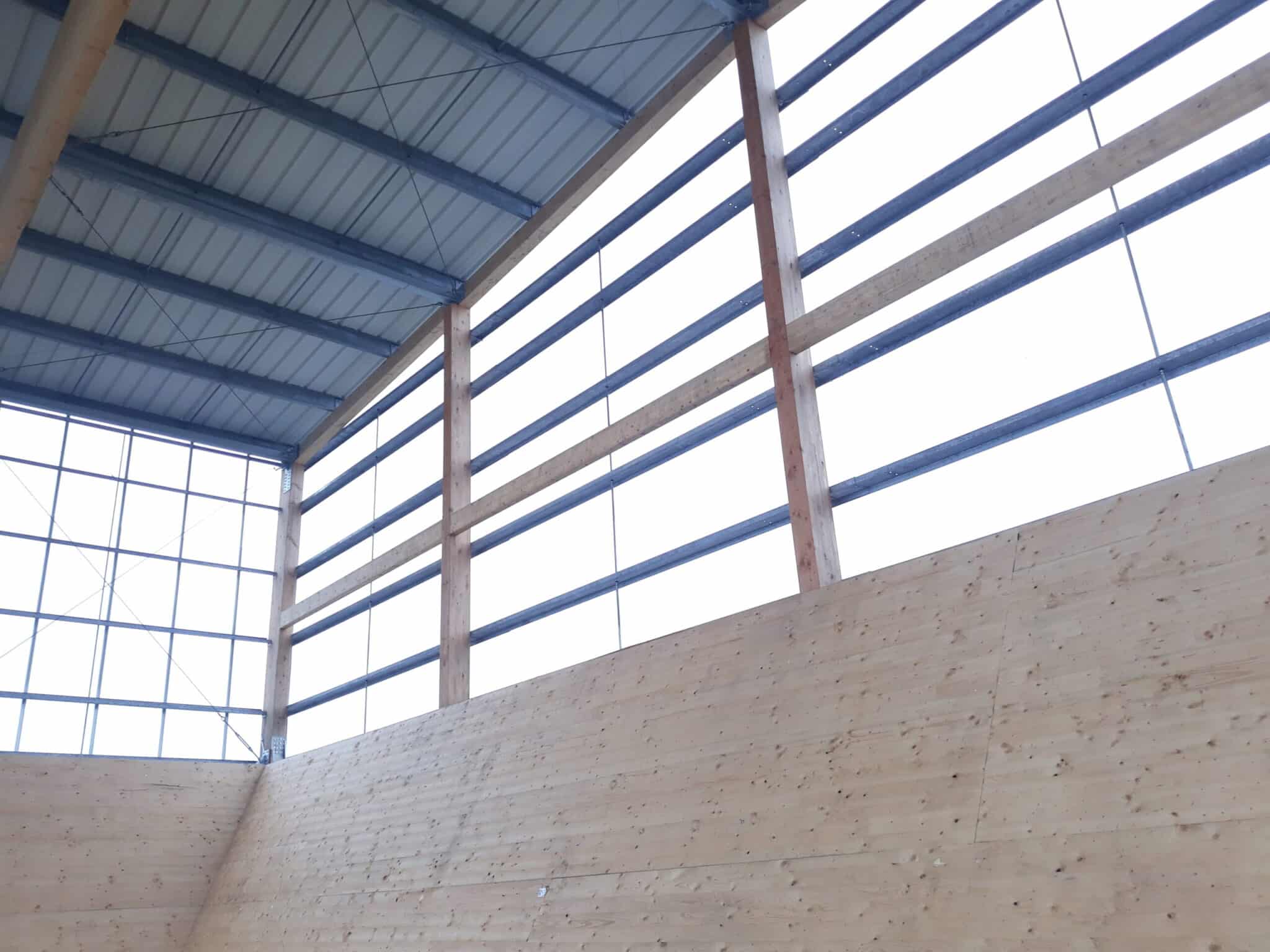 The “Hangar à sel de Houffalize” is a 440 m² (18,5 m x 24 m) warehouse dedicated to the storage of salt that will be spread on the roads during winter frosts. The load bearing structure consists of four timber frames and of 3 inclined CLT walls that are in contact with the salt. The CLT panels play a major role in the wind stabilization of the frames and of the entire structure. The CLT walls are supported by 31 CLT triangles that bring the vertical loads to the foundations. These triangles are covered with a finition to protect them form the weather. The rest of the structure is protected with a transparent polycarbonate cladding. We chose to make the structure in timber because it was economically competitive and because, unlike steel or concrete, wood does not suffer from contact with road salt.