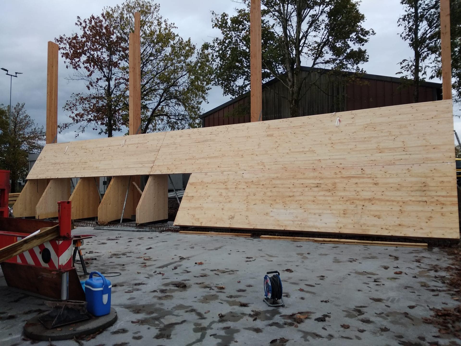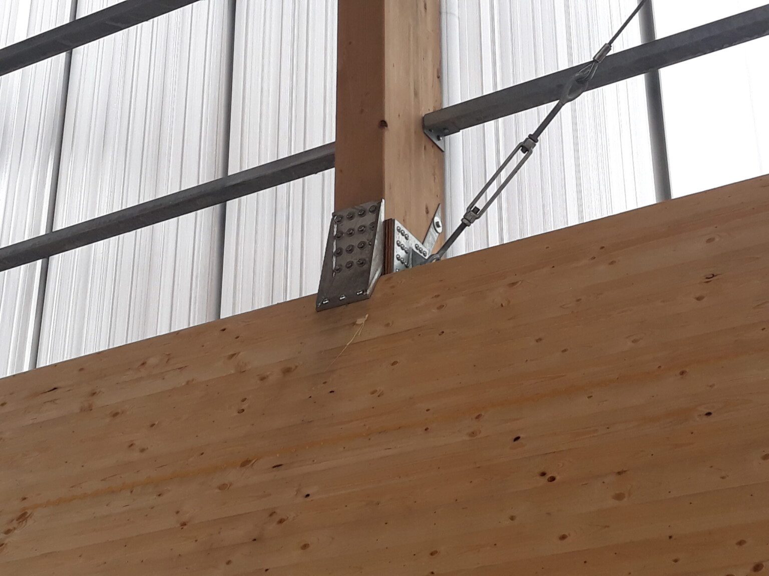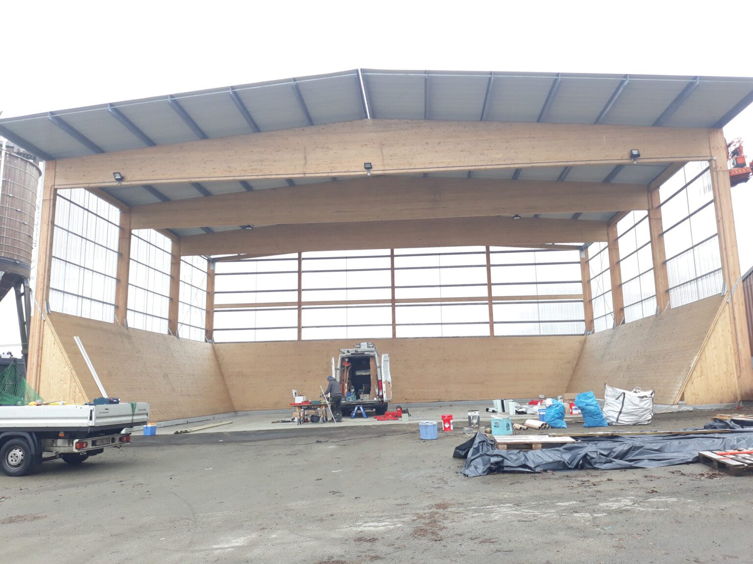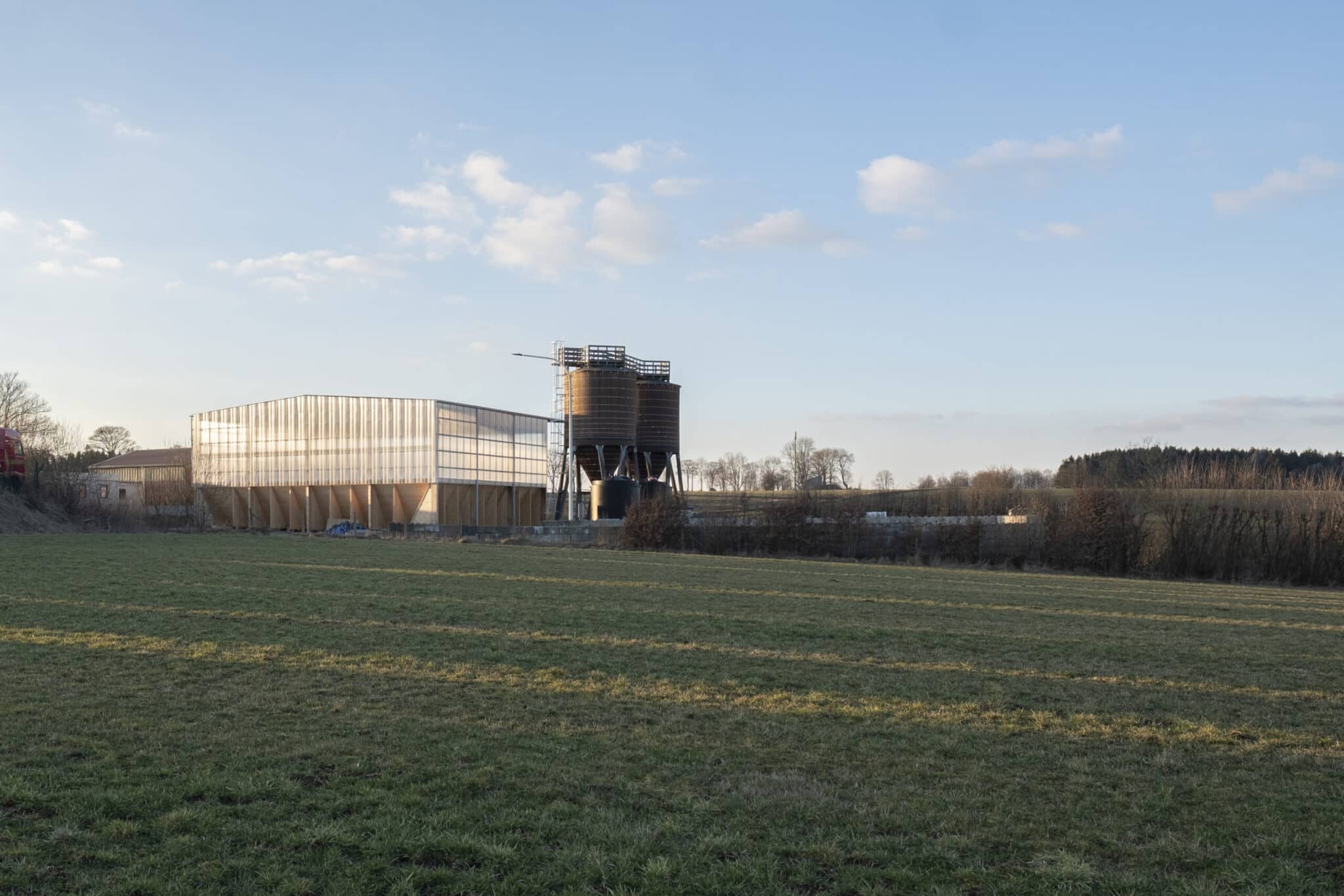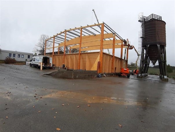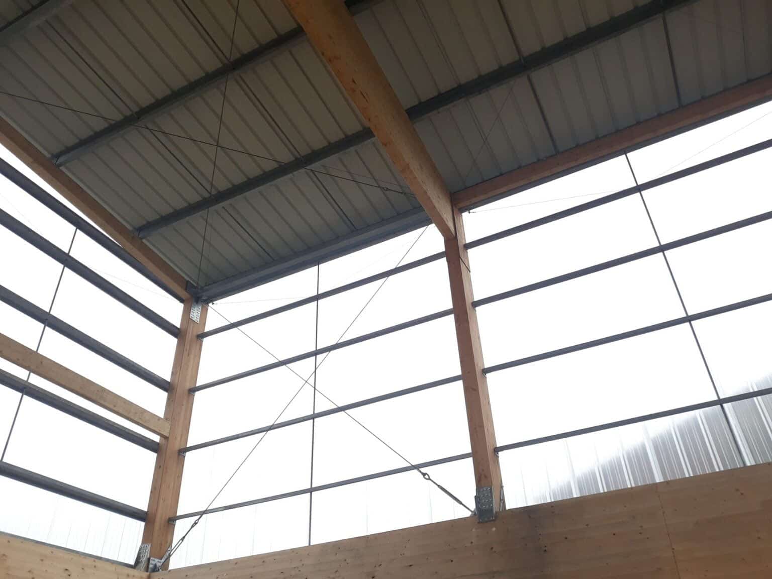 The “Hangar à sel de Houffalize” is a 440 m² (18,5 m x 24 m) warehouse dedicated to the storage of salt that will be spread on the roads during winter frosts. The load bearing structure consists of four timber frames and of 3 inclined CLT walls that are in contact with the salt. The CLT panels play a major role in the wind stabilization of the frames and of the entire structure. The CLT walls are supported by 31 CLT triangles that bring the vertical loads to the foundations. These triangles are covered with a finition to protect them form the weather. The rest of the structure is protected with a transparent polycarbonate cladding. We chose to make the structure in timber because it was economically competitive and because, unlike steel or concrete, wood does not suffer from contact with road salt.