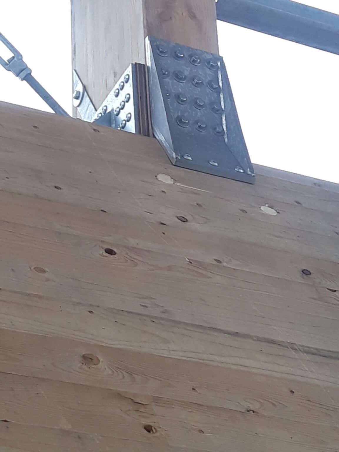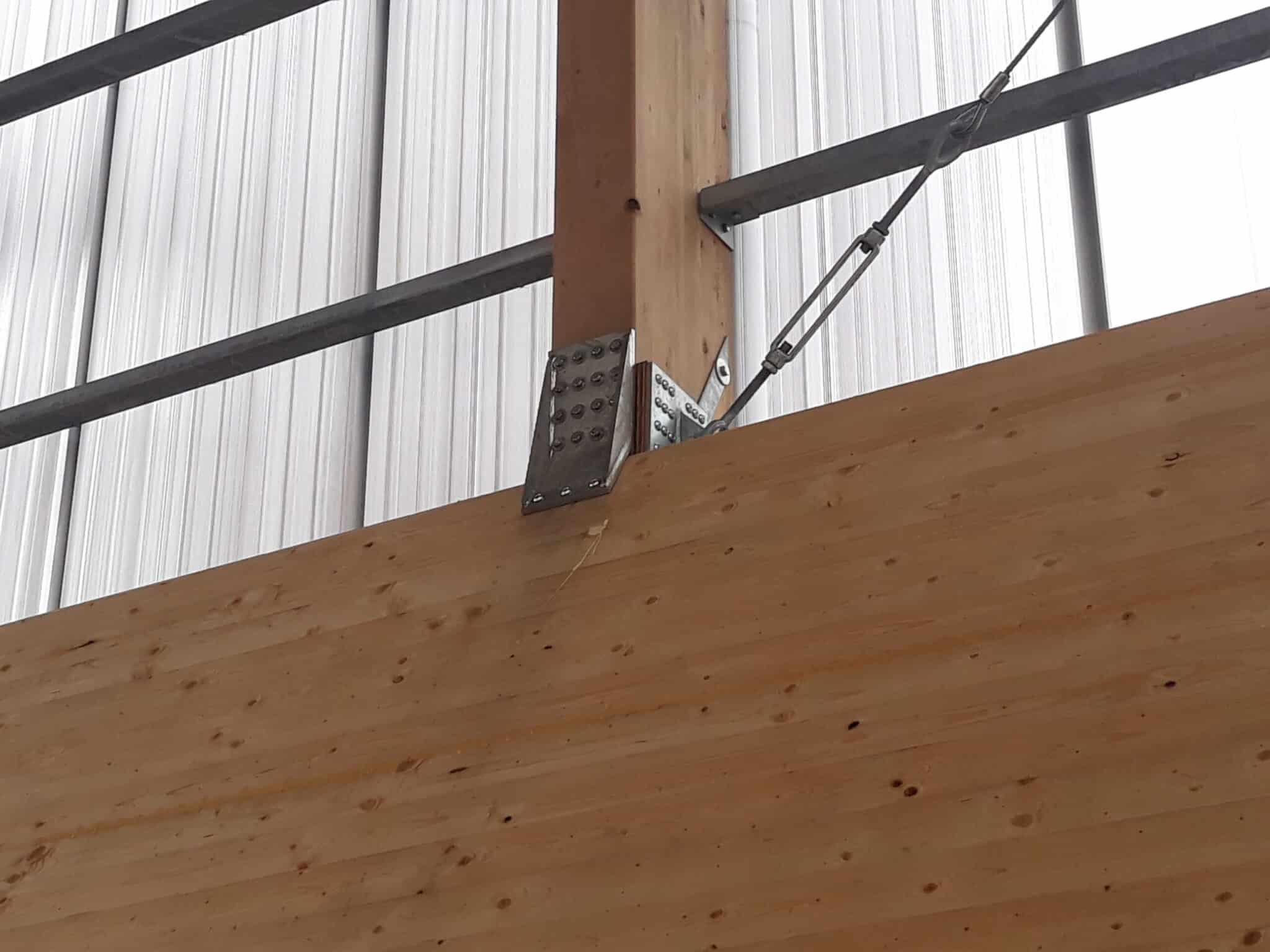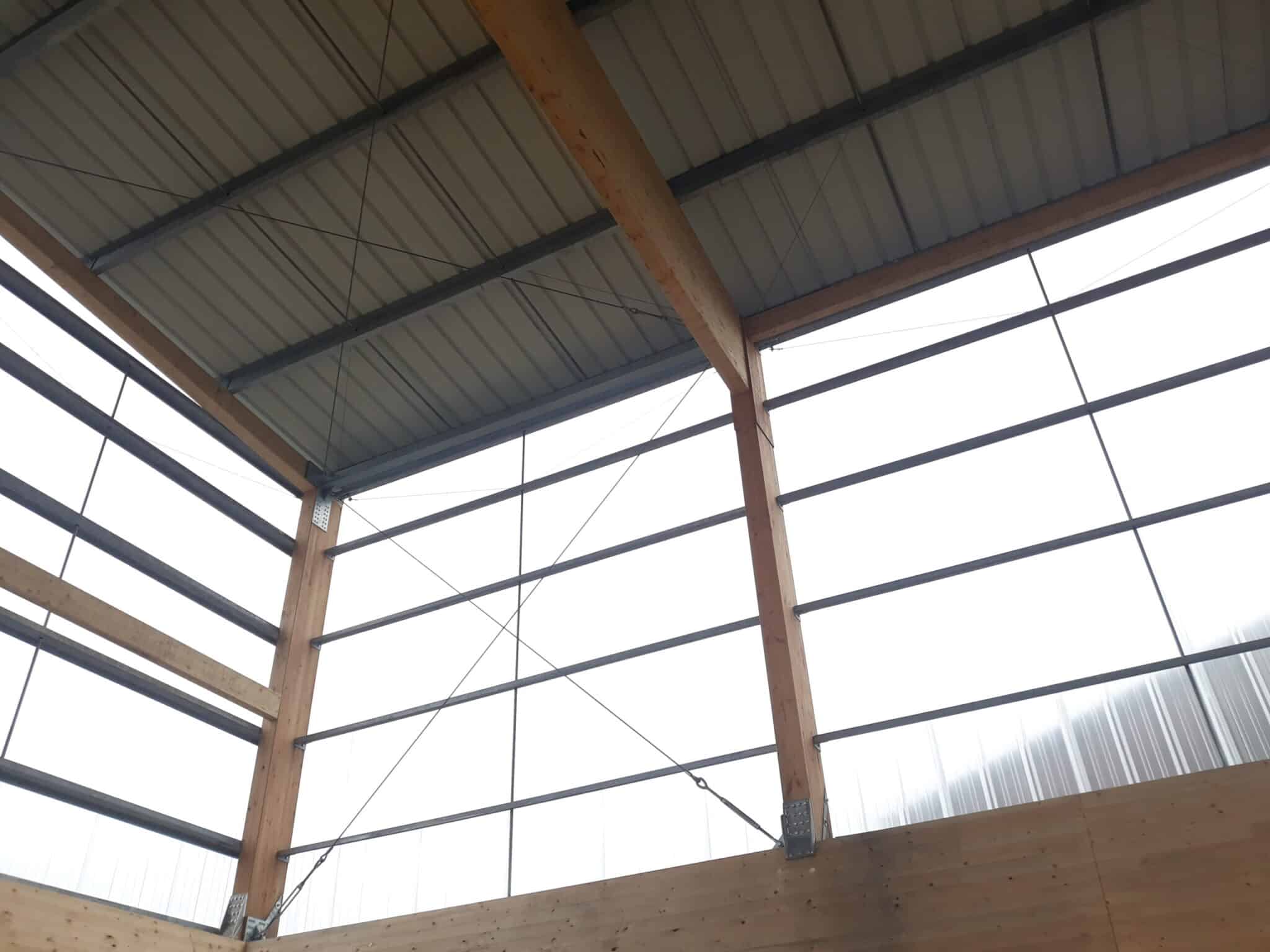 The columns are in douglas because they are exposed to the rain. The rest of the structure is protected by the cladding and is therefore in spruce timber. The main beams have a span of 24 m and have an variable inertia to minimize the amount of timber used. They are fixed to the columns with LVL plates. All the joints have been designed in collaboration with the wood entreprise TS Construct to guarantee the durability.
