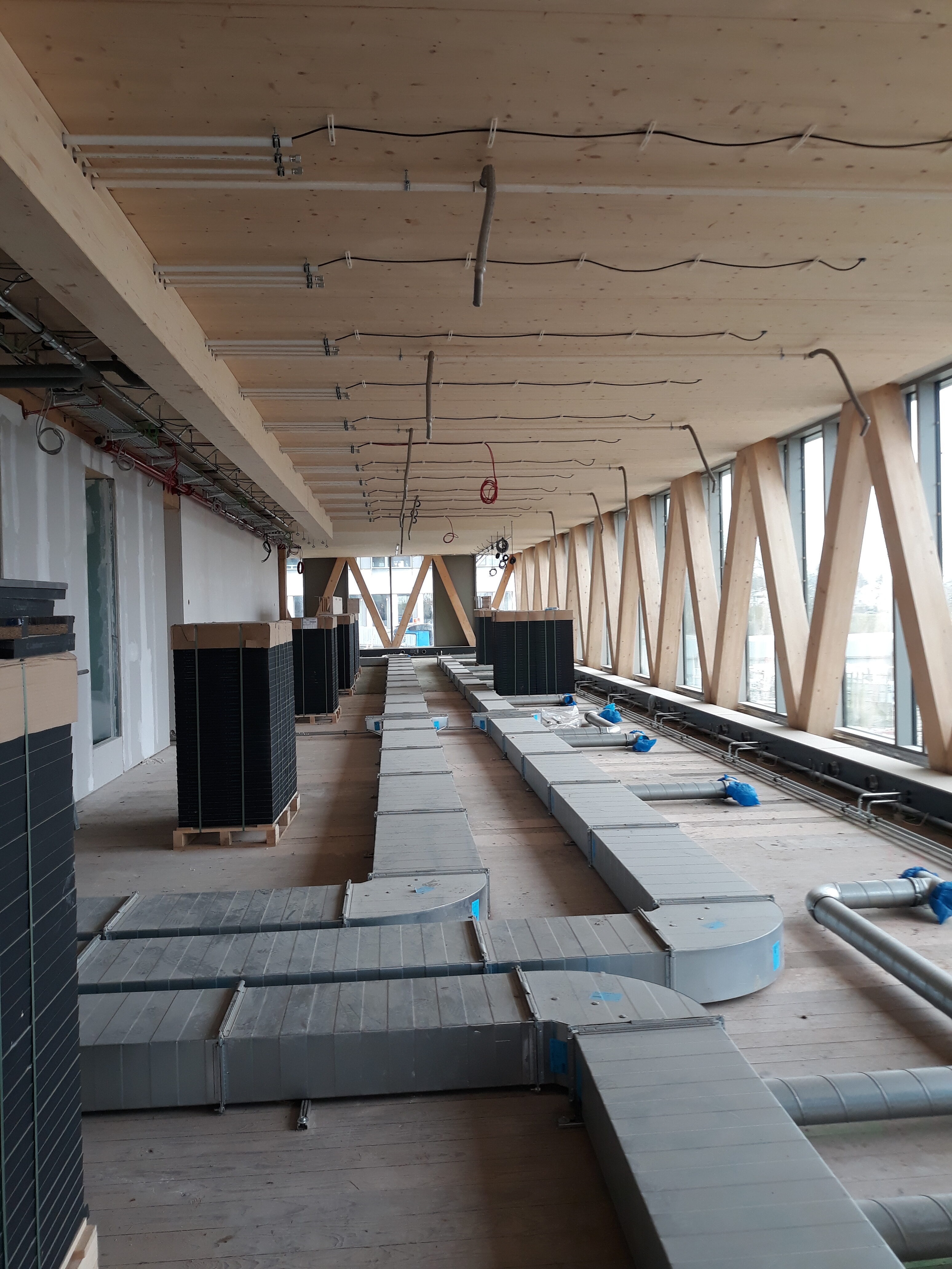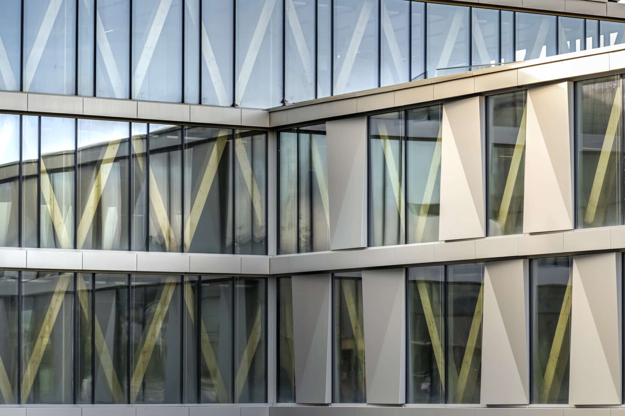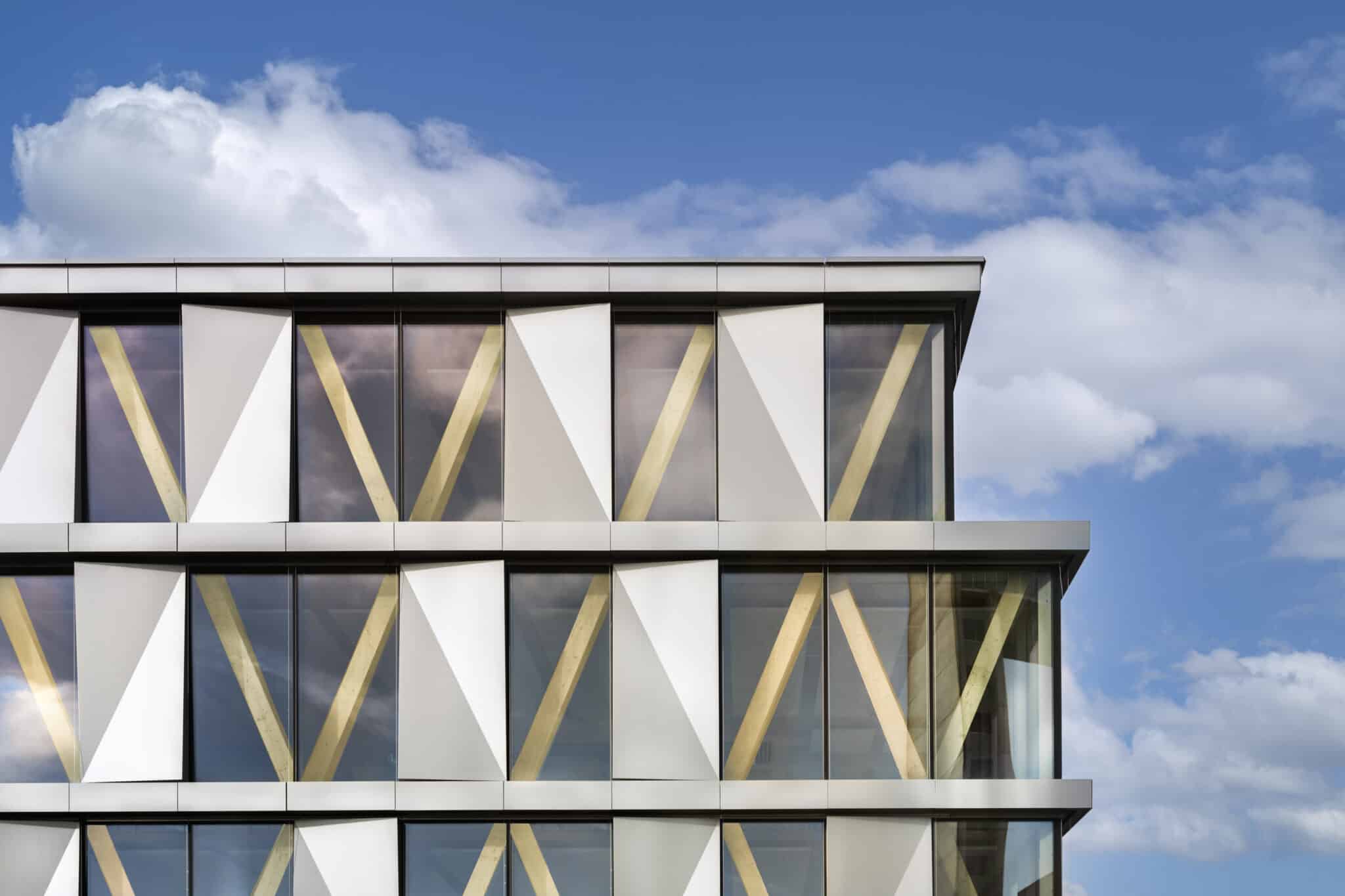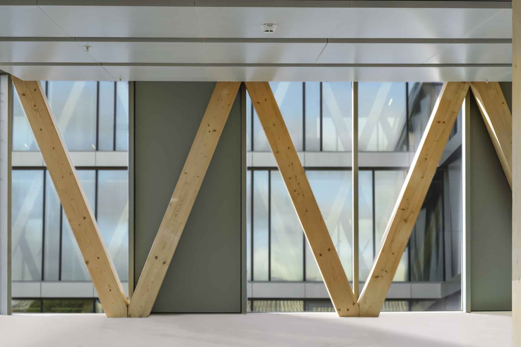 The basement level houses three levels of parking. The entire basement is made of cast-in-place concrete, providing a solid foundation for the building. Moving upward from the ground floor, a beam-column structure made of glued laminated timber (glulam) was installed. This engineered wood material offers excellent structural integrity while maintaining a natural and aesthetically appearance. The CLT floors, with a maximum span of 6.85 meters, provide ample office space. The “V” shape of the timber facades not only gives the building its distinctive character but also serves as the primary bracing system. To speed up the construction schedule, prefabrication techniques were used wherever possible, reducing site work and minimising construction time.