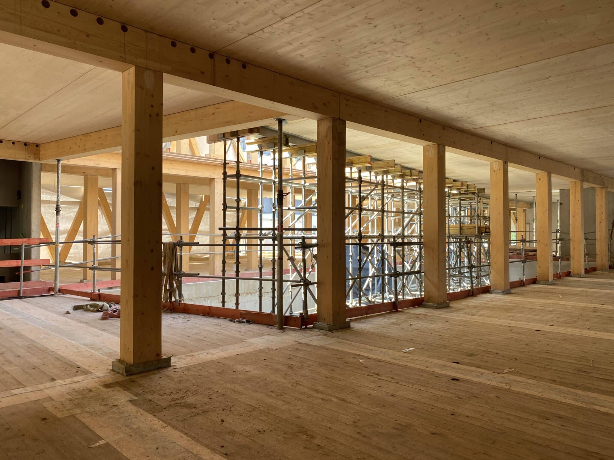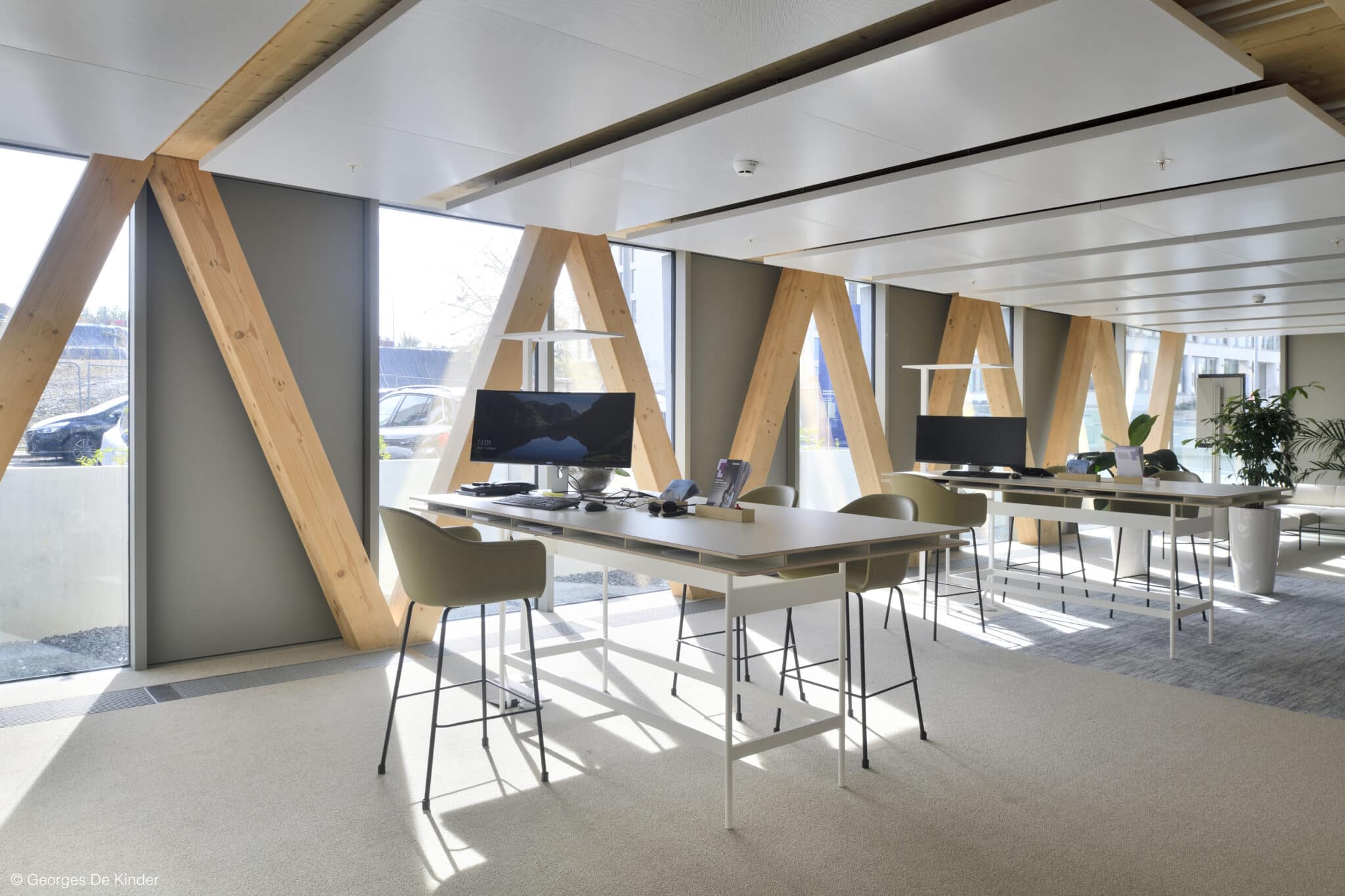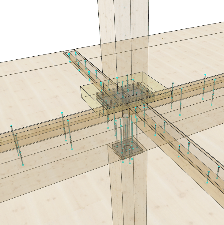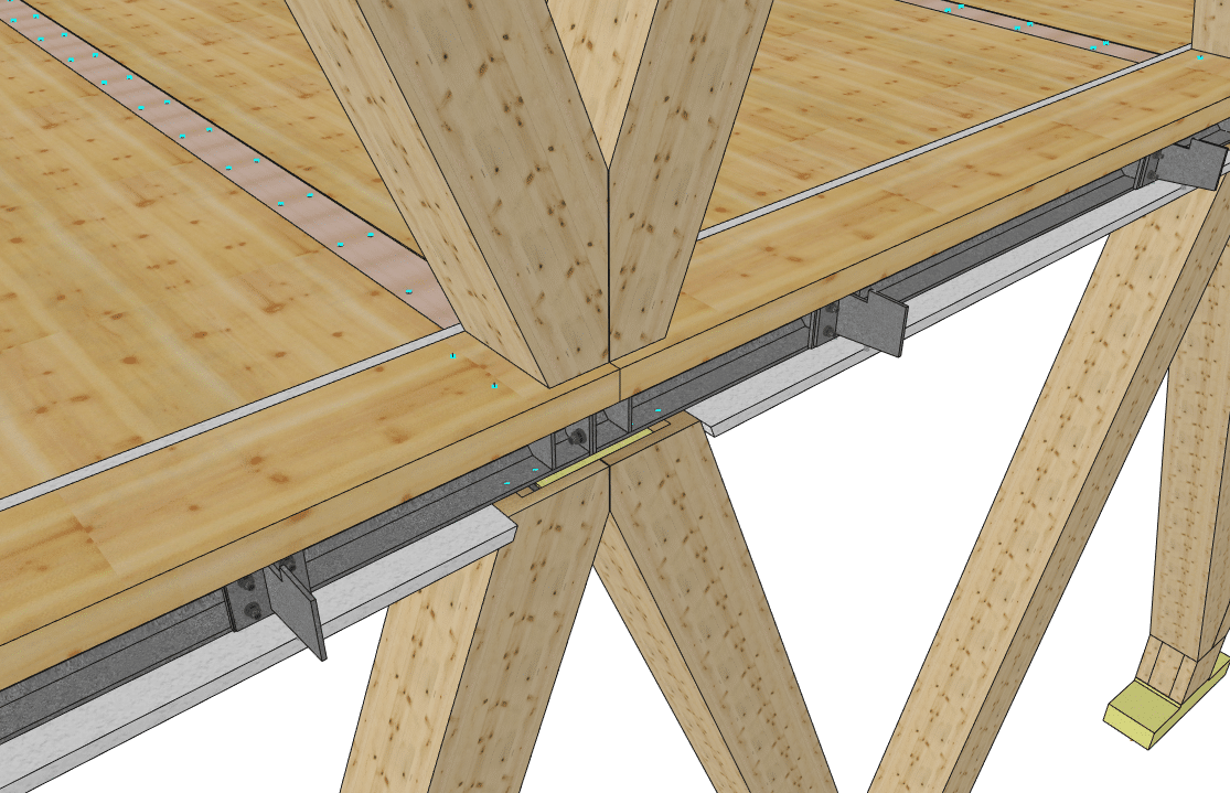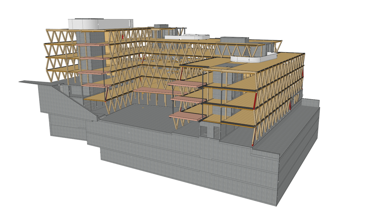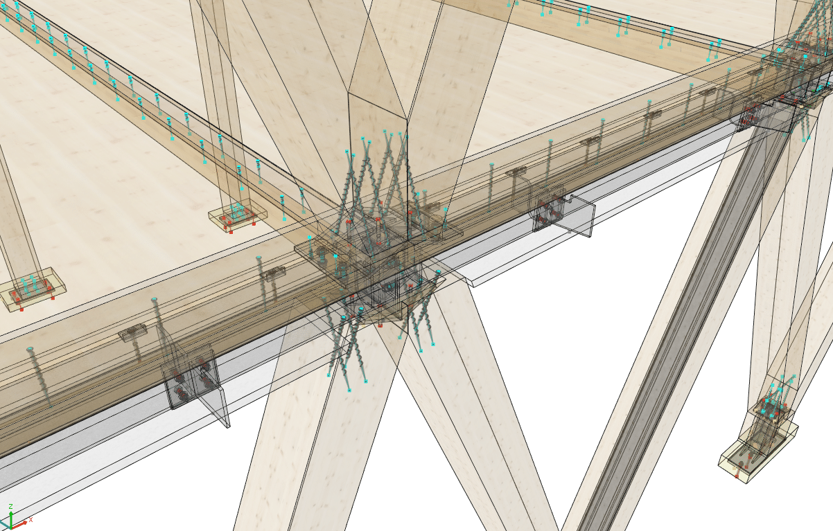 The basement level houses three levels of parking. The entire basement is made of cast-in-place concrete, providing a solid foundation for the building. Moving upward from the ground floor, a beam-column structure made of glued laminated timber (glulam) was installed. This engineered wood material offers excellent structural integrity while maintaining a natural and aesthetically appearance. The CLT floors, with a maximum span of 6.85 meters, provide ample office space. The “V” shape of the timber facades not only gives the building its distinctive character but also serves as the primary bracing system. To speed up the construction schedule, prefabrication techniques were used wherever possible, reducing site work and minimising construction time.