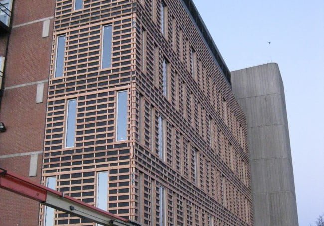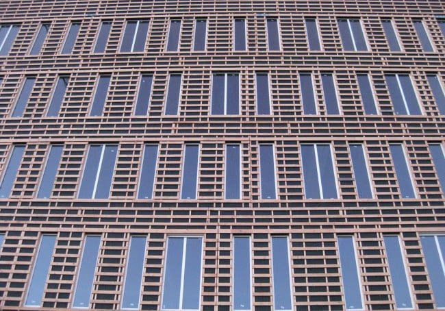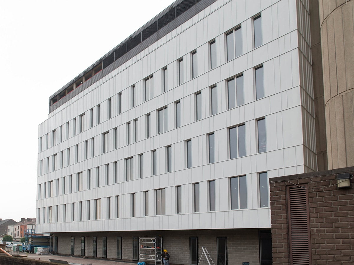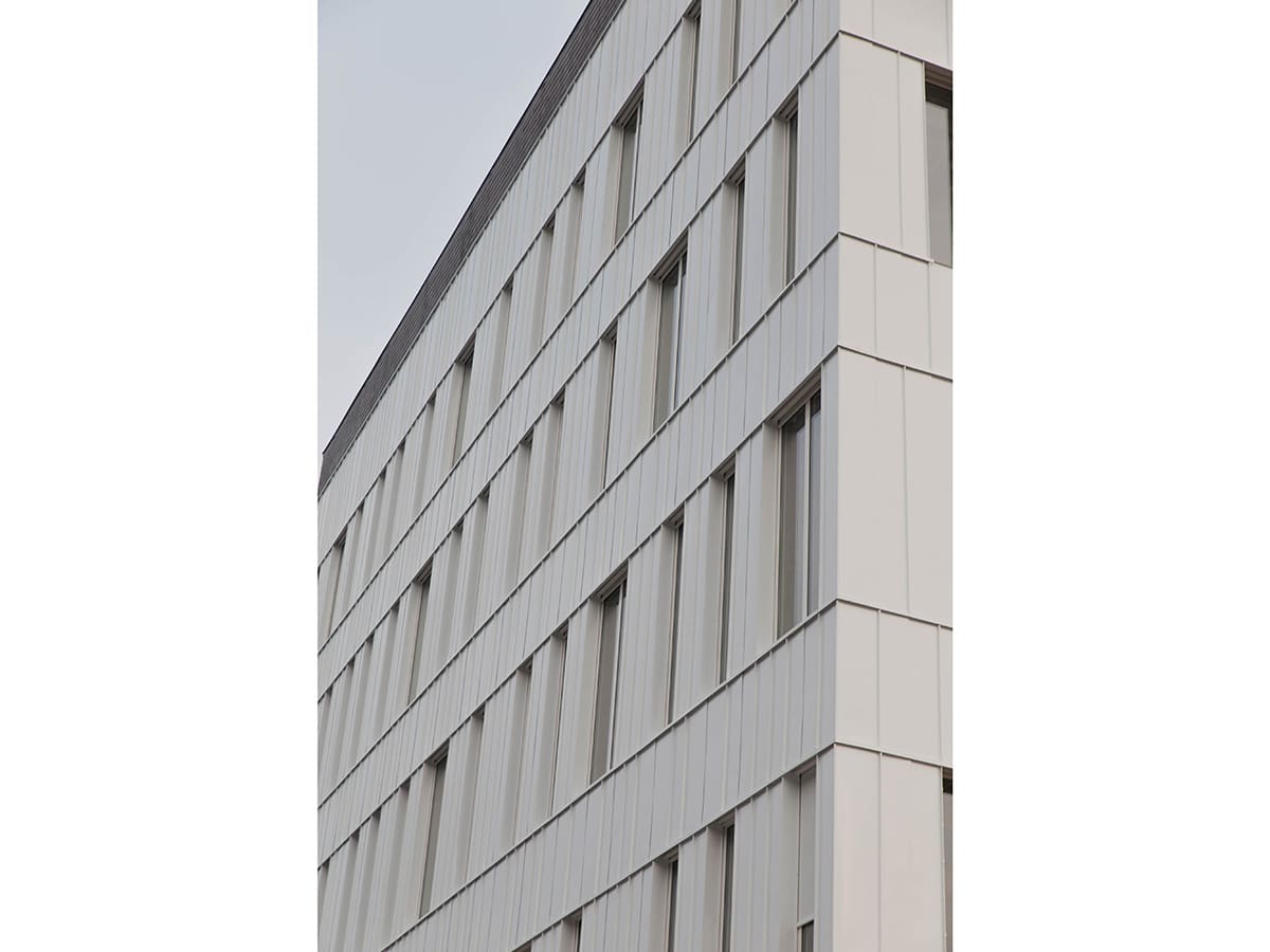 The new holding cells in the existing basement are built with prefabricated concrete wall elements and assembled on site. The new facade brought back to the building is composed of prefabricated wooden panels with white zinc cover.
