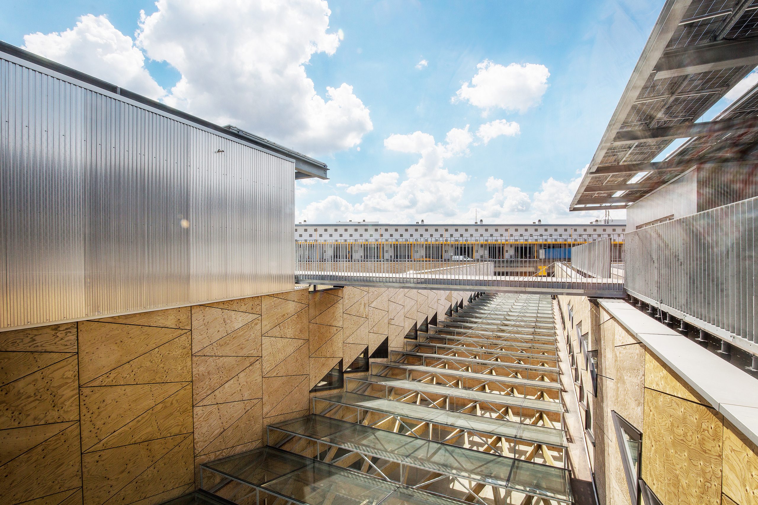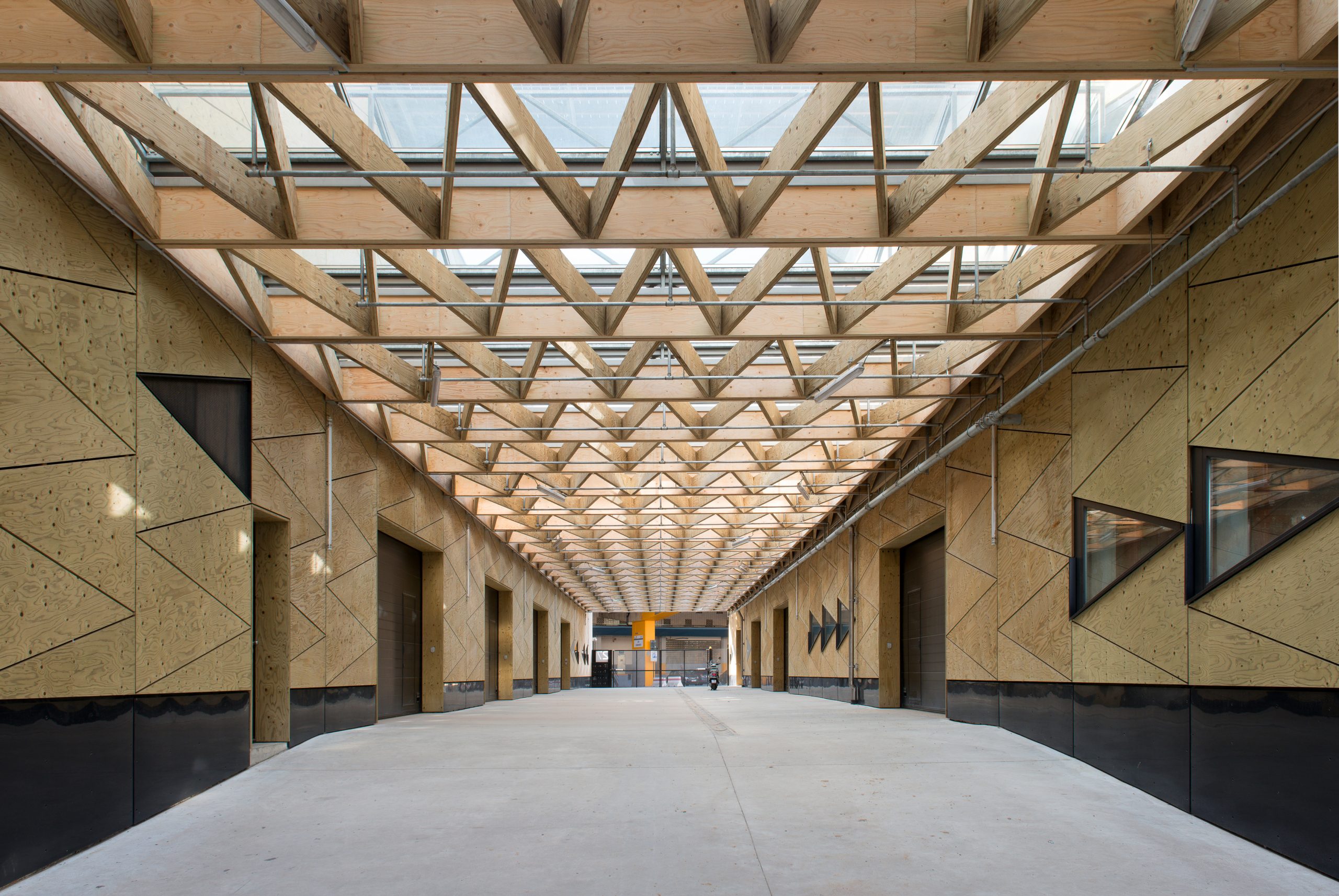 Our commission is to perform the execution studies of the prefabricated facade, the frameworks in LVL (Laminated Veneer Lumber), of the roof lights and the glazed facades, which bear on the main concrete structure of the building.