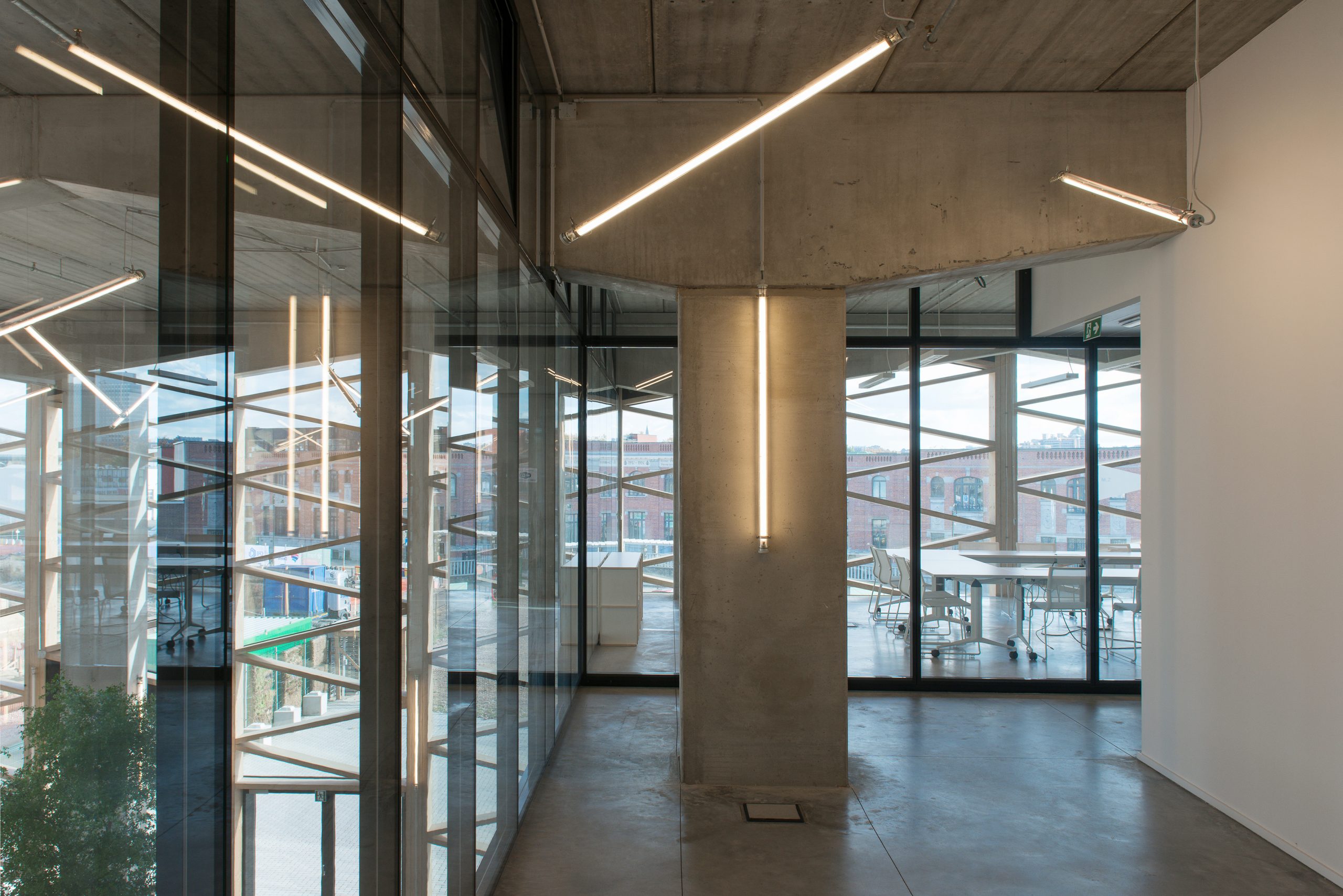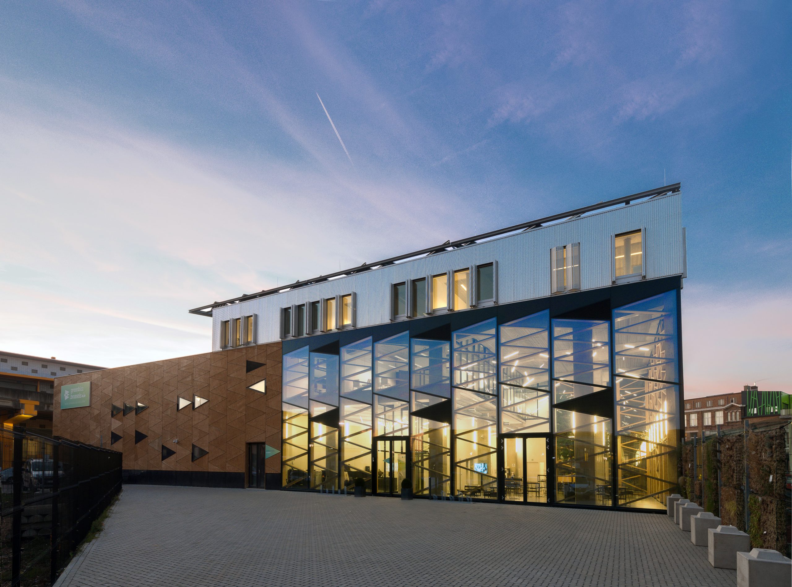The Greenbizz project on the Tivoli site near the Canal and the Tour & Taxi Exhibition Center in Brussels consists in the creation of a center dedicated to the promotion of environmental projects. The center includes 5000 m² of low energy usage workshops and of 2500 m² of “passive” standard incubator space, which will accommodate start-up companies of environmental vocation. A second building of 4500 m² houses workshops on 2 levels.