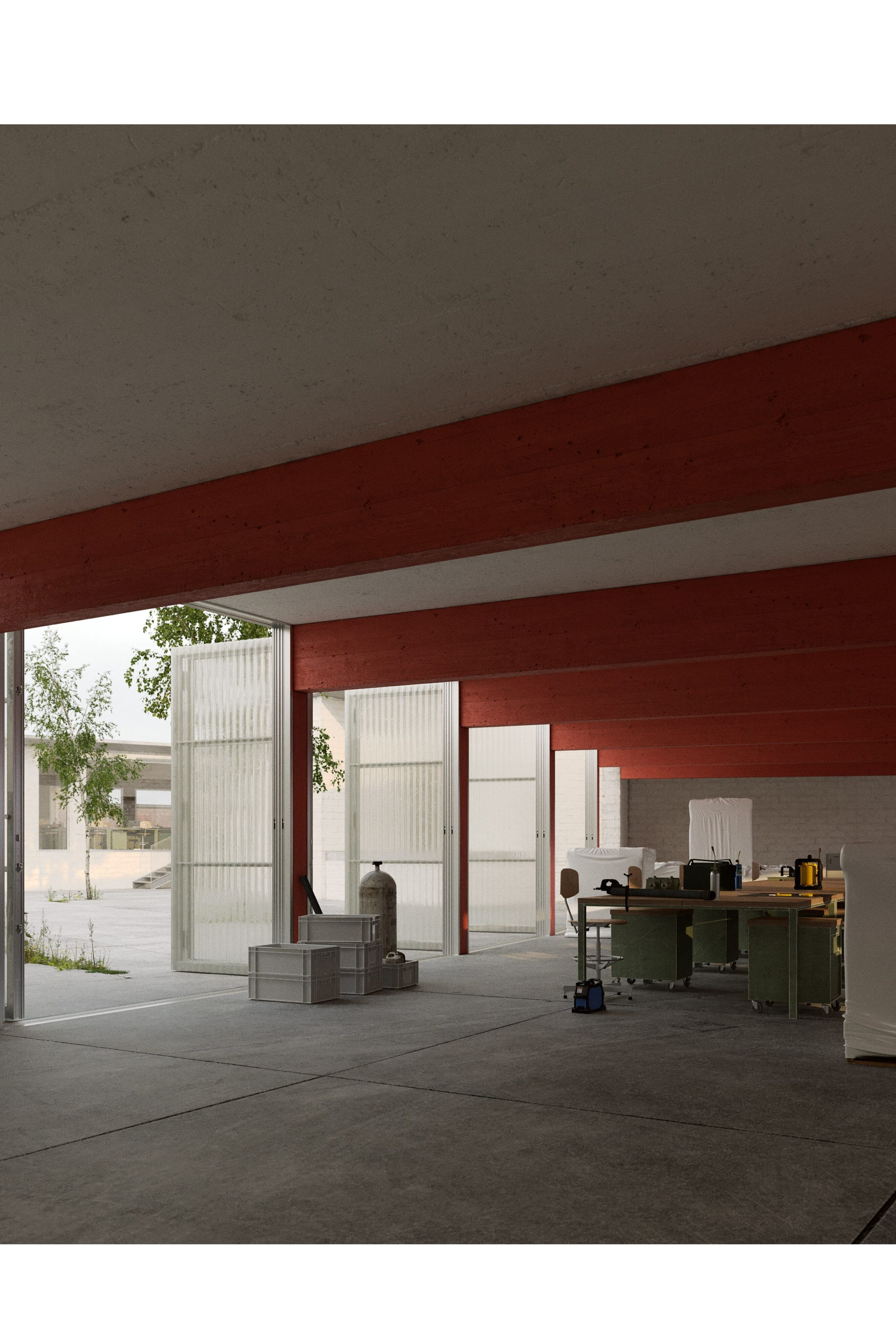 The existing buildings were carefully studied to be preserved, transformed, or selectively deconstructed. The concrete and masonry structures were preserved as the spatial framework of the project, while the lighter metal halls became “donor buildings,” providing profiles, slabs, and cladding for the new construction. At the center of the project, a large hybrid steel-concrete canopy, designed exclusively from elements salvaged from the site, houses the Recypark logistics area with containers.