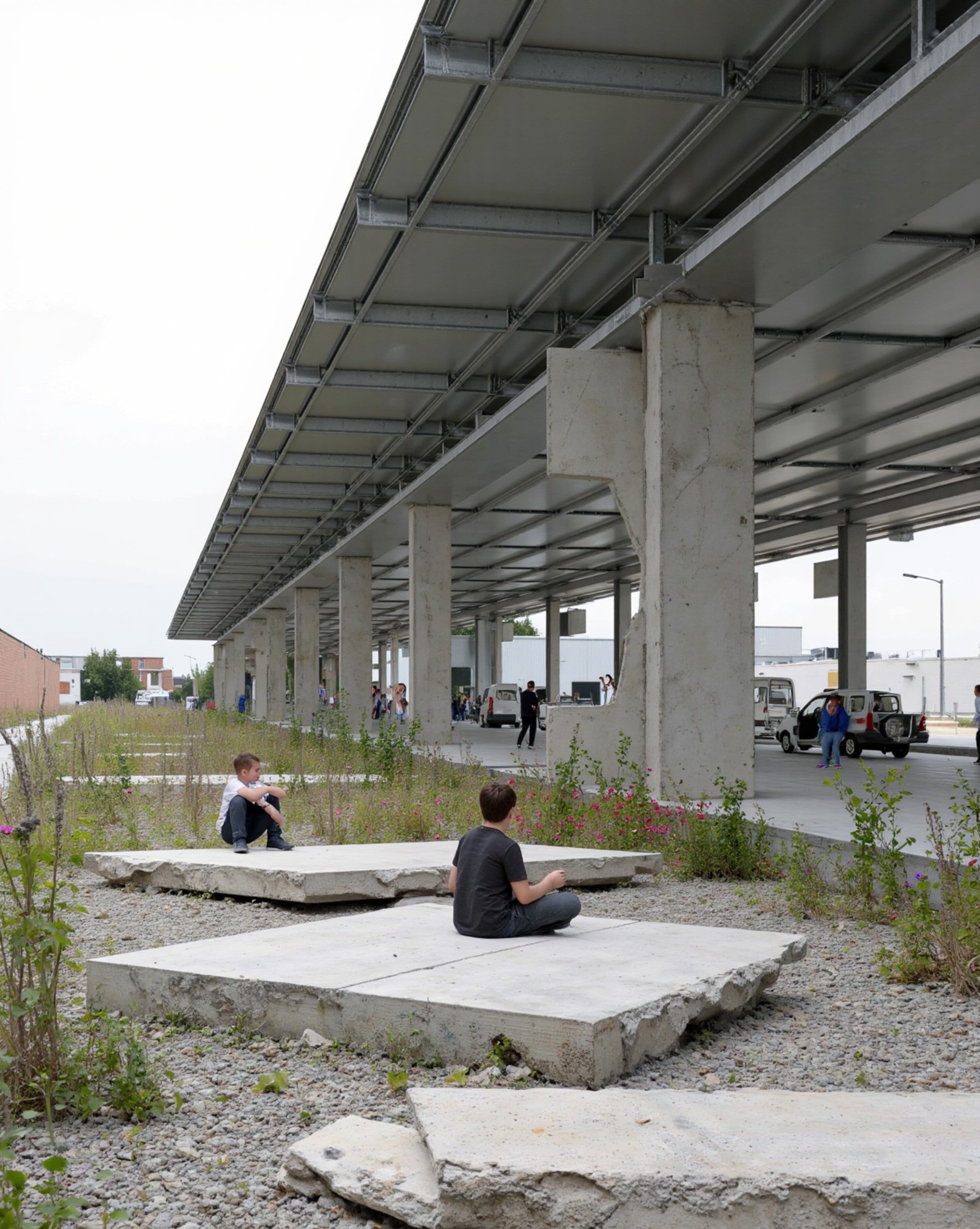 Driven by the conviction that nothing leaves the site, everything is transformed, the project – entitled “Nobody Leaves the Party” – rethinks the life cycle of buildings and the way we build in the city. Rather than building new, it builds on existing structures, transforms them, and reactivates them: each building, each material becomes a resource. The former industrial halls are being rehabilitated to house a recycling park, a donation and repair center, as well as community spaces open to the neighborhood. Across the entire site, the recycling park structures the landscape and is organized around three gardens: fissures, mounds, and rain, promoting water infiltration, biodiversity, and soil regeneration.
