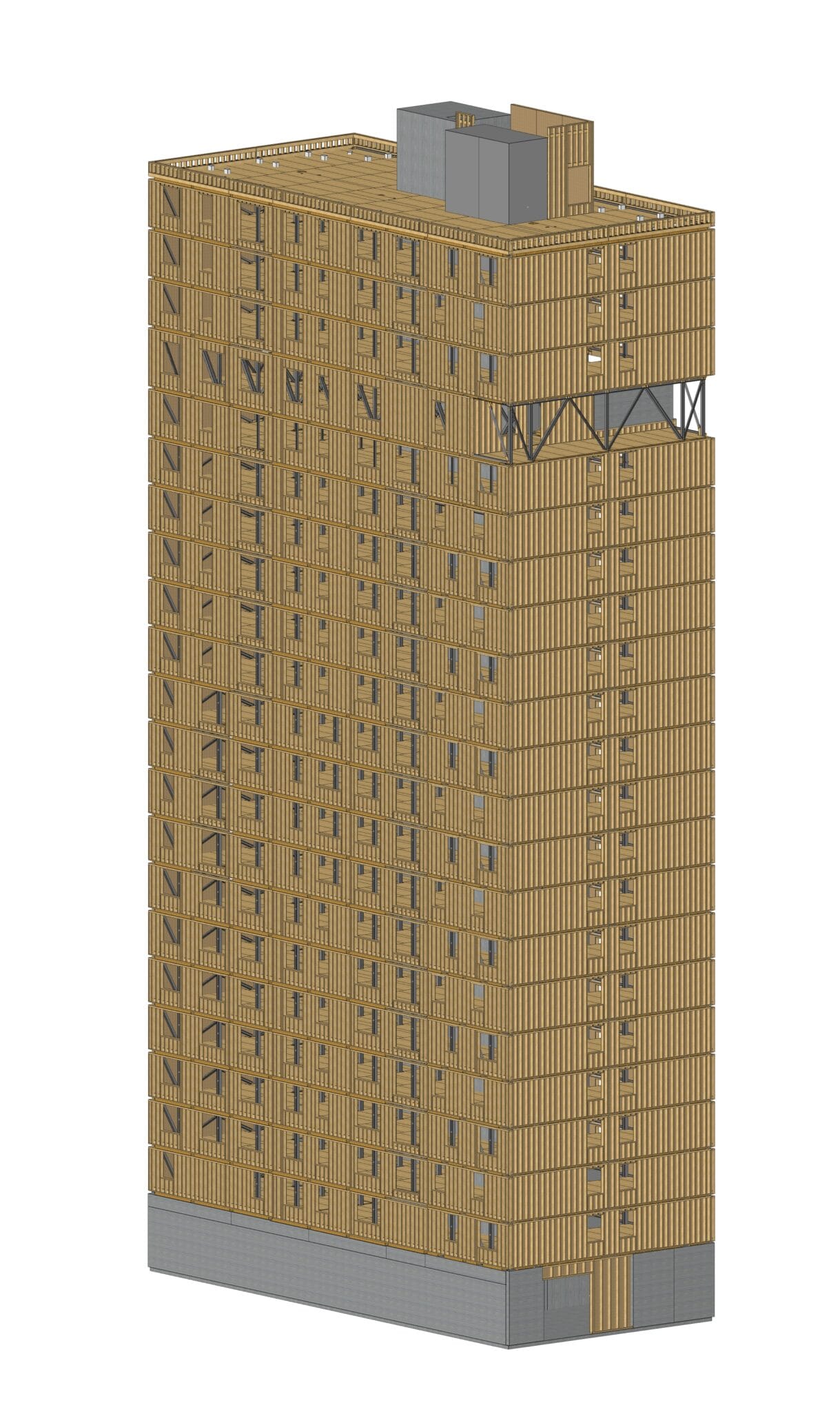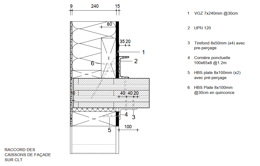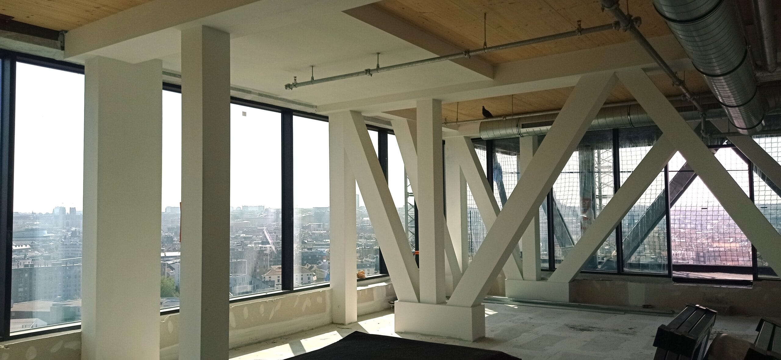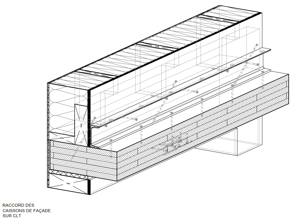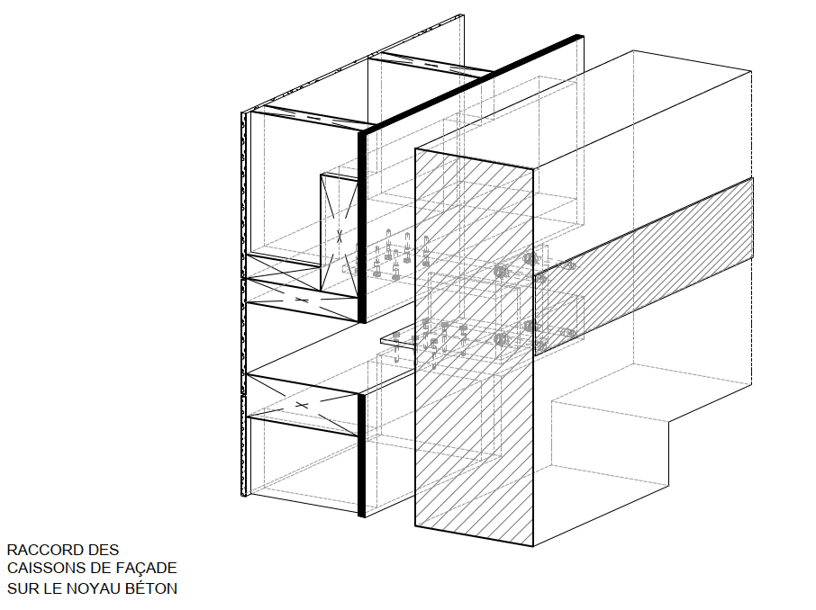 In order to keep the existing structure and foundations in state, the new floors onclude a truss structure which creates a bridge over the existing tower and drives new loads on the new facades. In order to reduce the self-weight of floors structure, there has been chosen to use exposed wood structure on the underside. Thus, 10,000m² of CLT panels are inserted into the existing steel structure. These panels are 160mm thick, ensuring a fire resistance of 90 minutes. They also provide a diaphragm effect on the 22 levels of the tower, allowing the tower to be stabilised in the wind by redirecting horizontal forces towards the central concrete core and the facade bracing. 4650m² of timber frame facade are also used in this renovation.