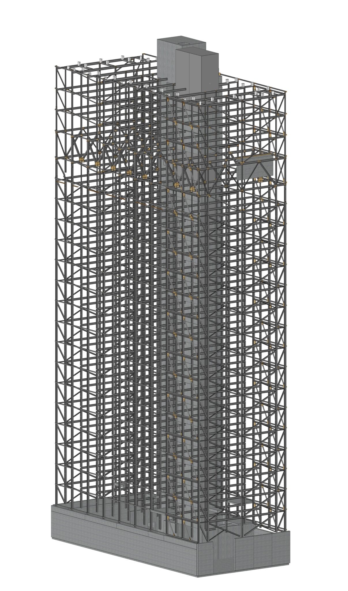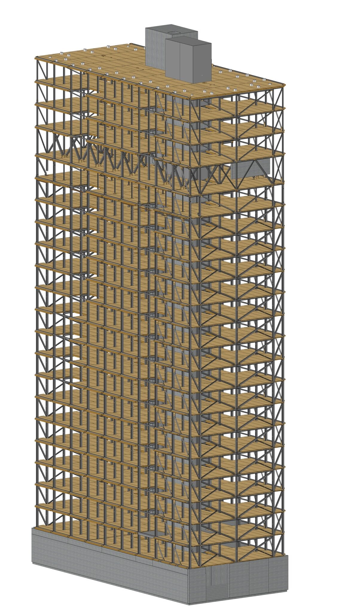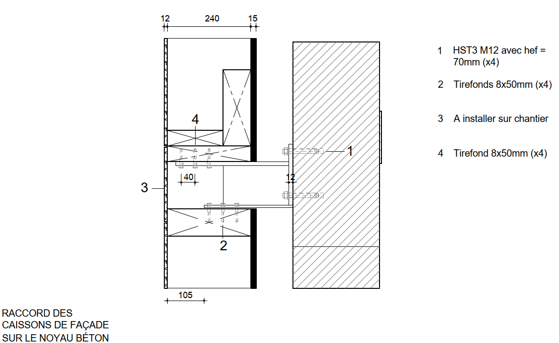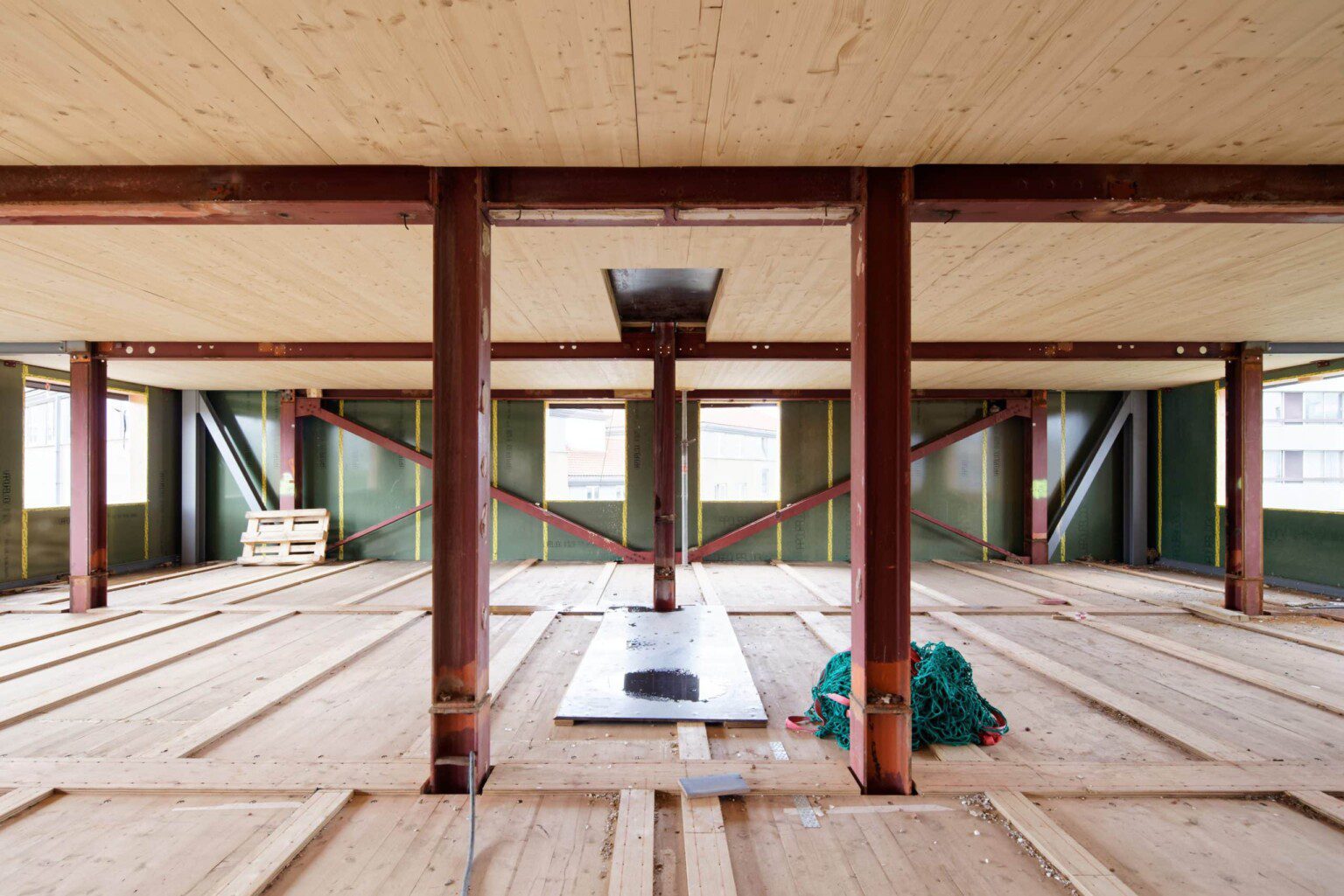 In order to keep the existing structure and foundations in state, the new floors onclude a truss structure which creates a bridge over the existing tower and drives new loads on the new facades. In order to reduce the self-weight of floors structure, there has been chosen to use exposed wood structure on the underside. Thus, 10,000m² of CLT panels are inserted into the existing steel structure. These panels are 160mm thick, ensuring a fire resistance of 90 minutes. They also provide a diaphragm effect on the 22 levels of the tower, allowing the tower to be stabilised in the wind by redirecting horizontal forces towards the central concrete core and the facade bracing. 4650m² of timber frame facade are also used in this renovation.