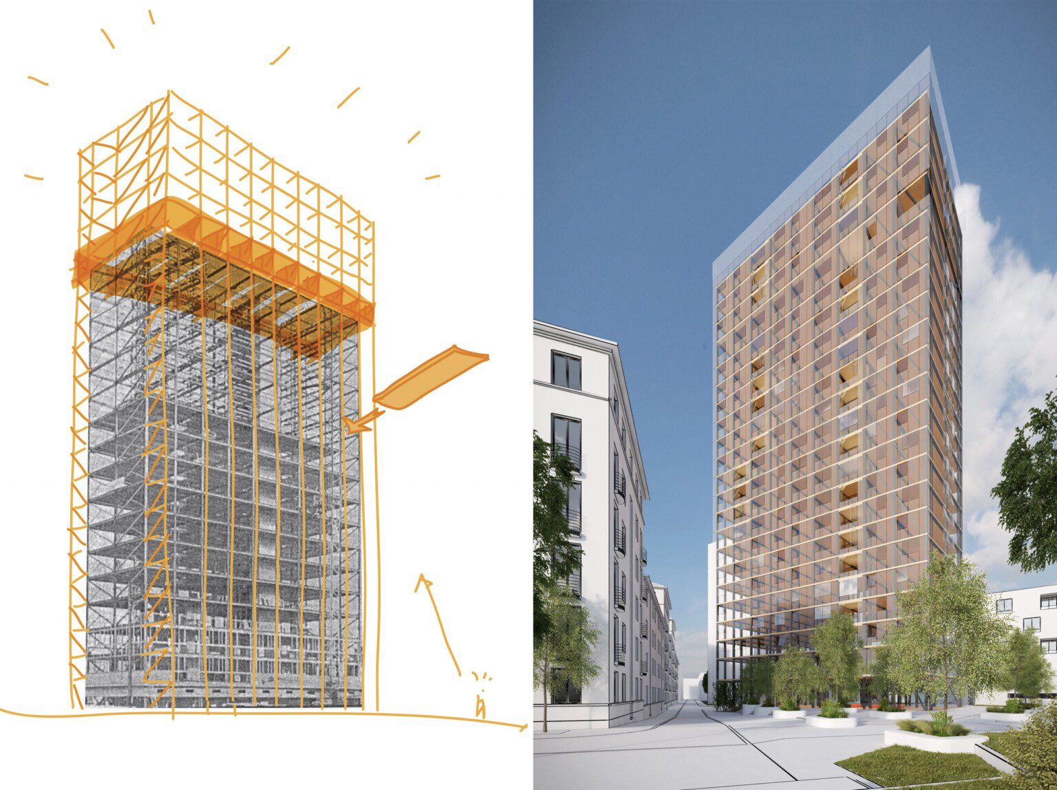 This proposal maintains the existing steel structure, and extends the original volume by offseting the main facades and adding several floors on top. The existing 16-story tower will rise to 21-story with a height of 62m. These operations will provide a greater diversity of housing, a better urban integration and contemporary standards of comfort and safety