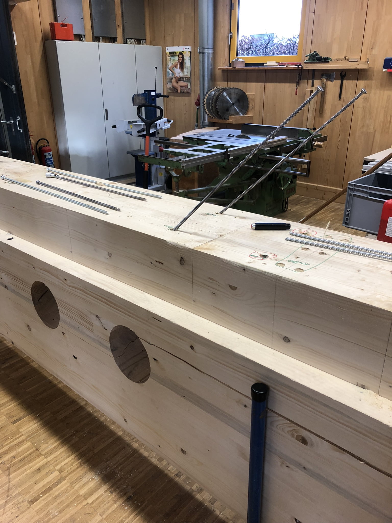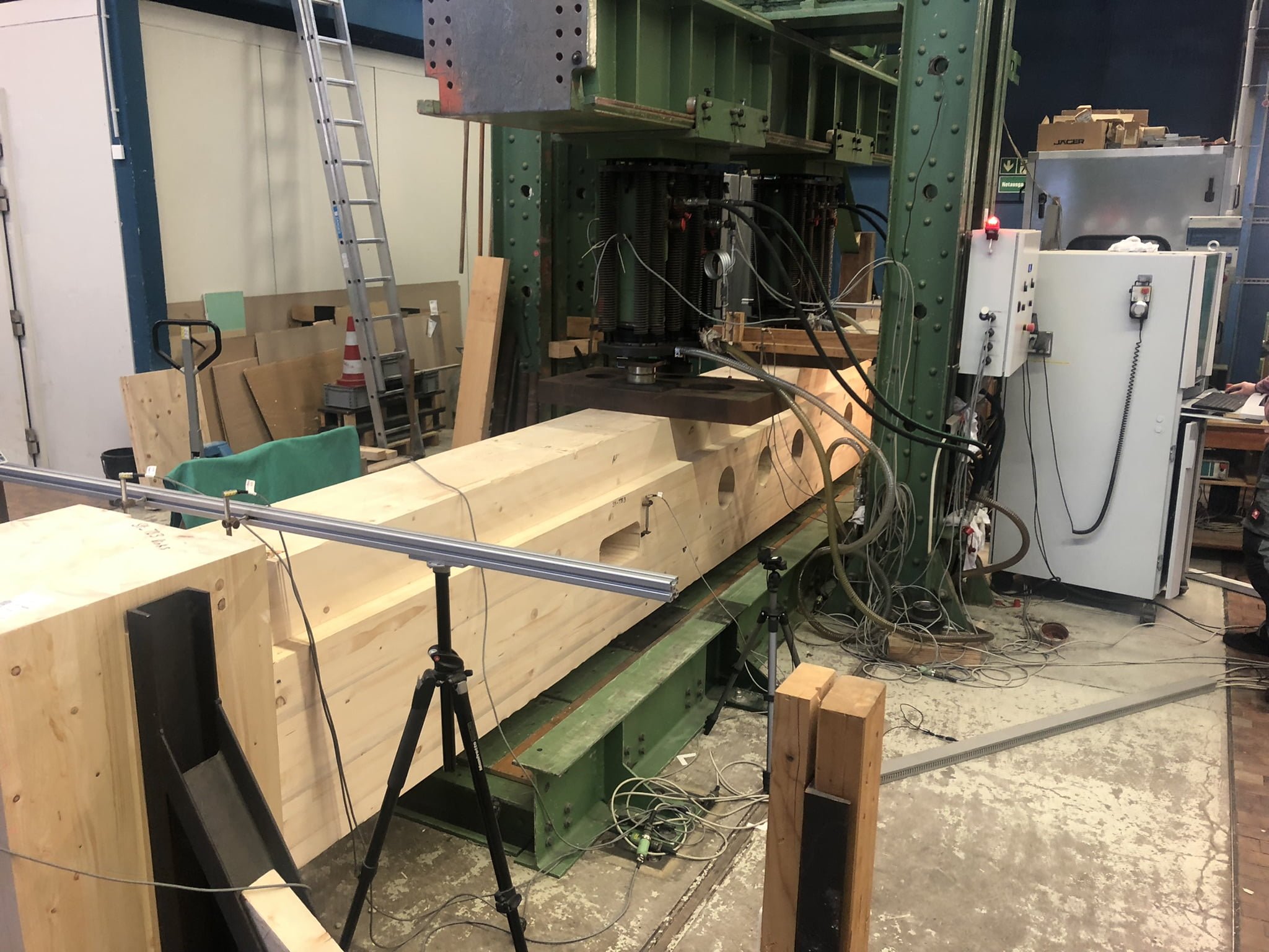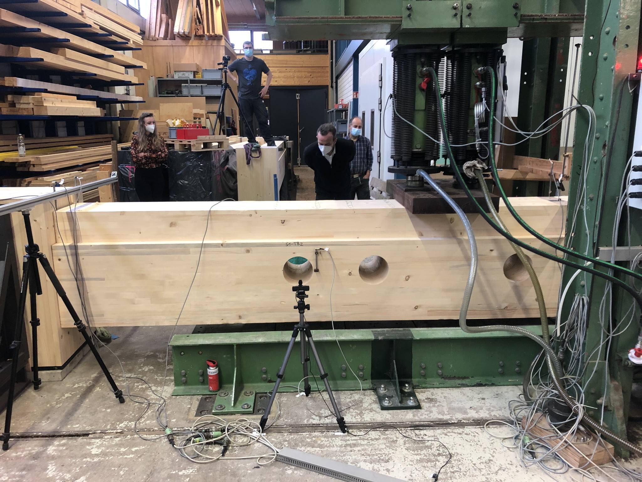 The research, carried out in collaboration with the Karlsruhe Institute of Technology (KIT) and Prof. Philipp Dietsch, aimed to verify the strength of 52x75h cm block glued glulam beams containing openings.