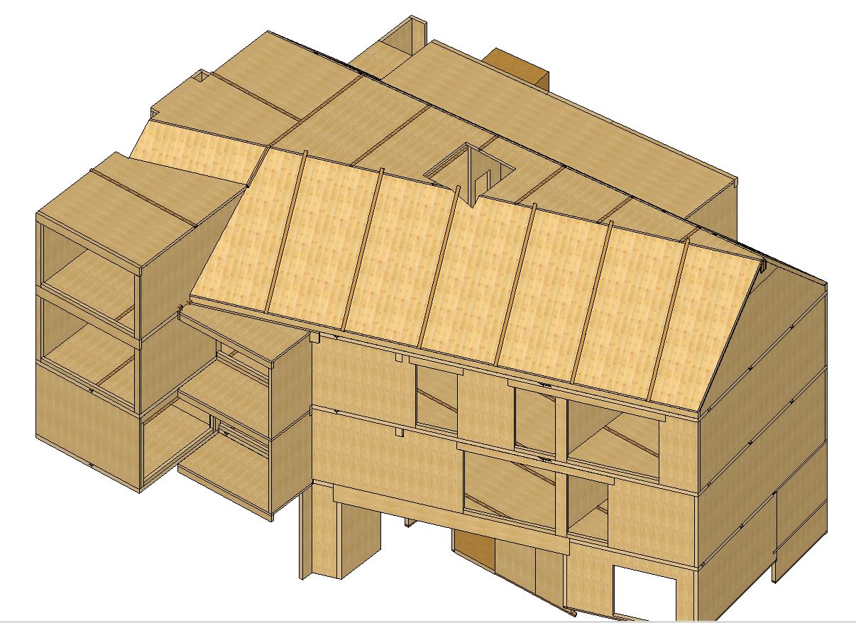 A geometric complexity linked to the location of the property in a neighborhood made of a small winding street and the nesting of a concrete and steel entrance porch. The choice of the wood is a variant of the company. The challenge is therefore to adapt the project to a solid wood structure by respecting the objectives of the architectural plans and the execution schedule. The solid back-necked panels must be prefabricated and factories before arriving on the construction site.