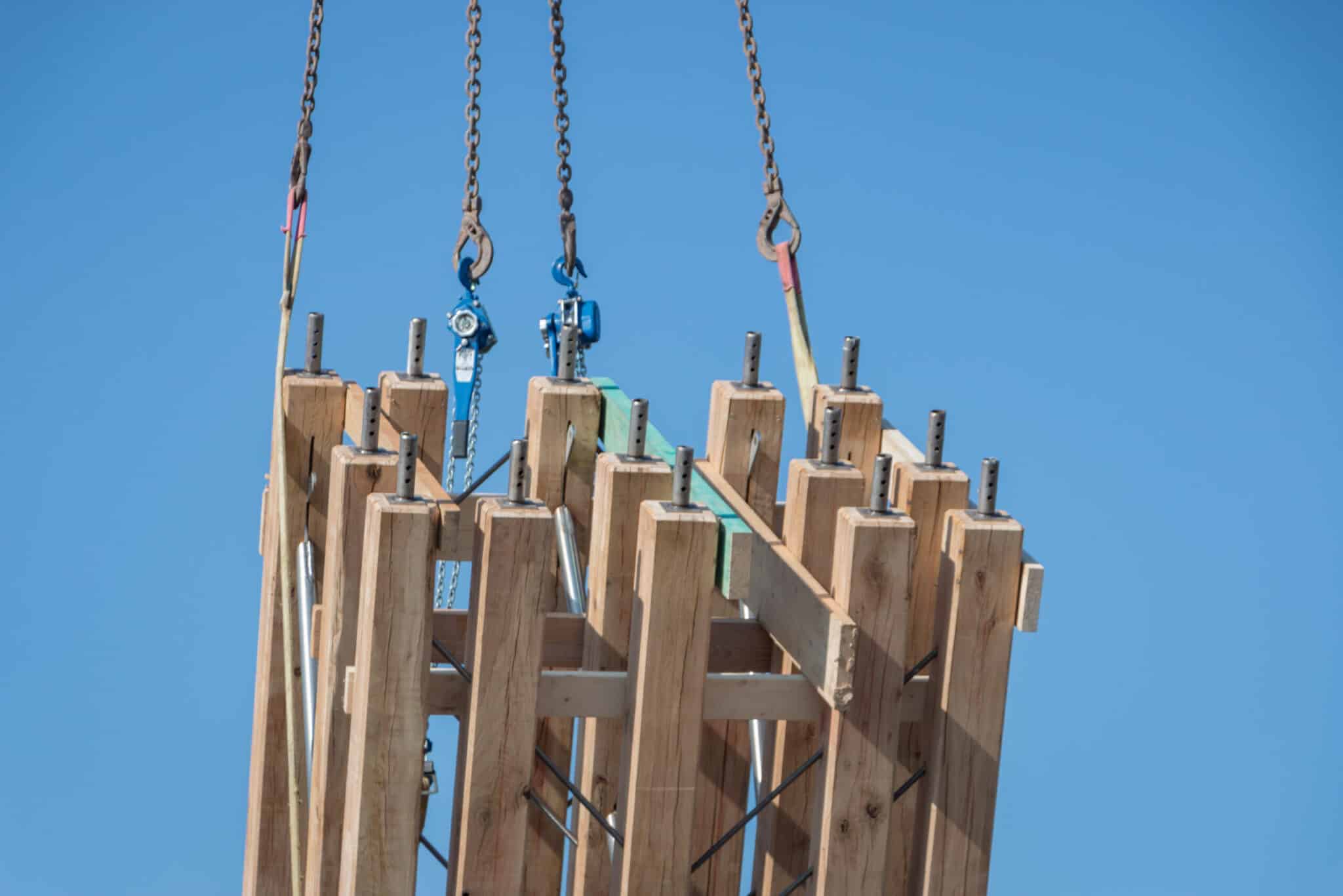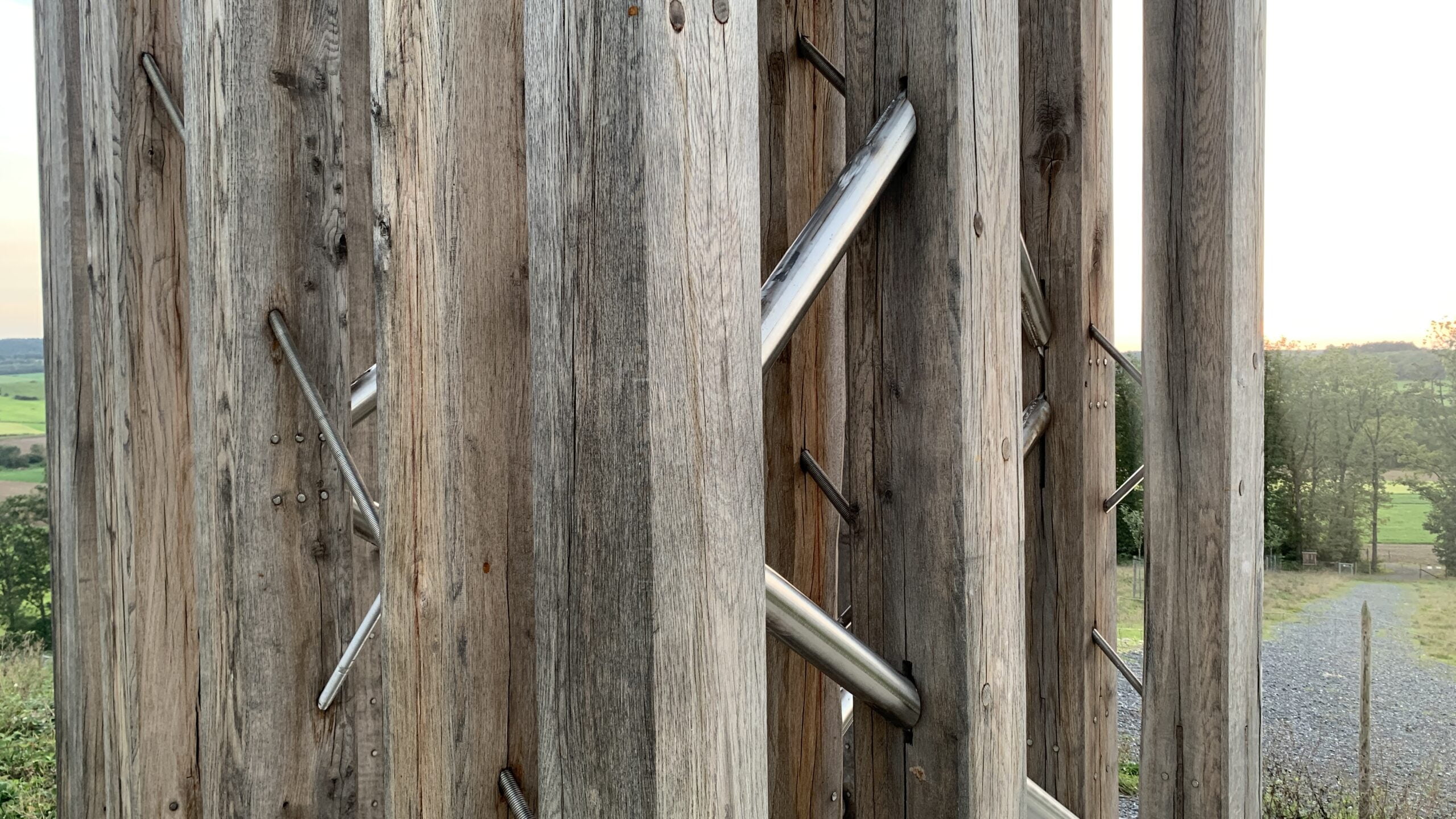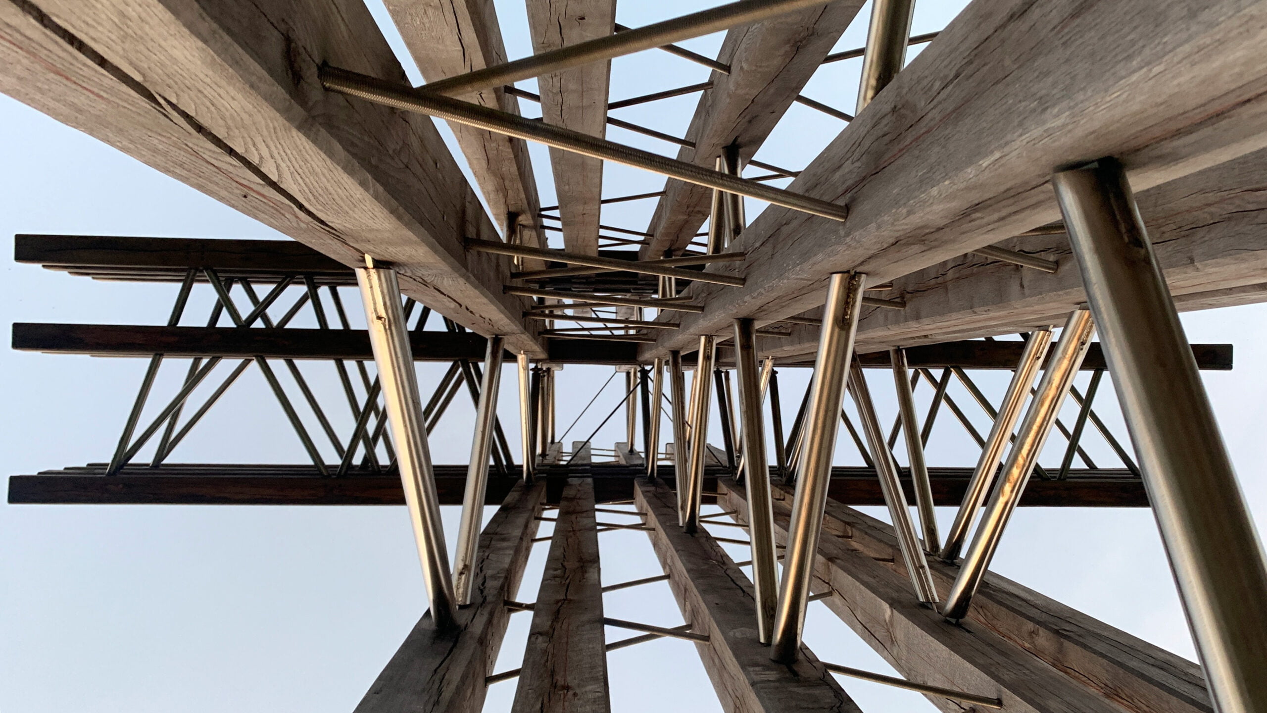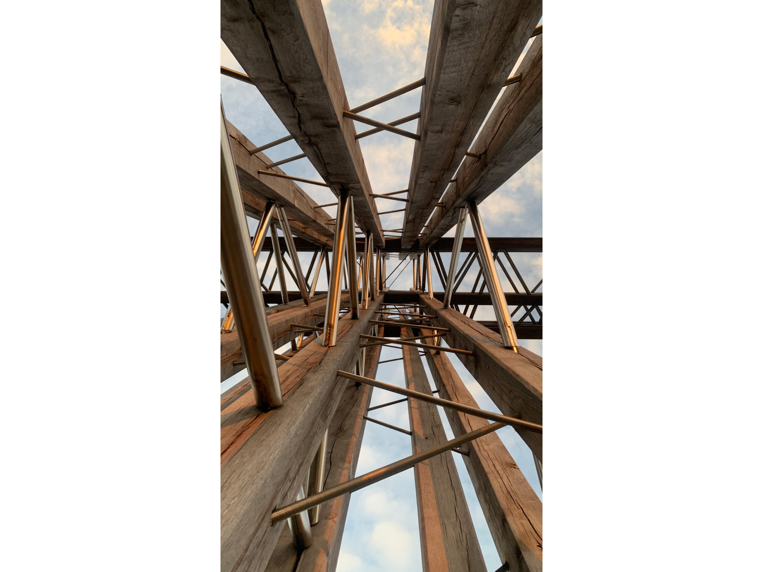 A parametric study was used to define the pattern of diagonals, which symbolise the multiple paths connecting earth and sky. On the front of the cross, threaded rods are screwed into the oak studs to create rigid planes with the alignment of five studs. On the profile, steel tubes are used to create lattice beams connecting all the planes to stabilise the whole structure. The multiplicity of bracing planes, each with a distinct geometry, gives the illusion of a random structure. The details of the connections have been carefully studied to ensure maximum durability of the structure while maintaining a pure and harmonious aesthetic.