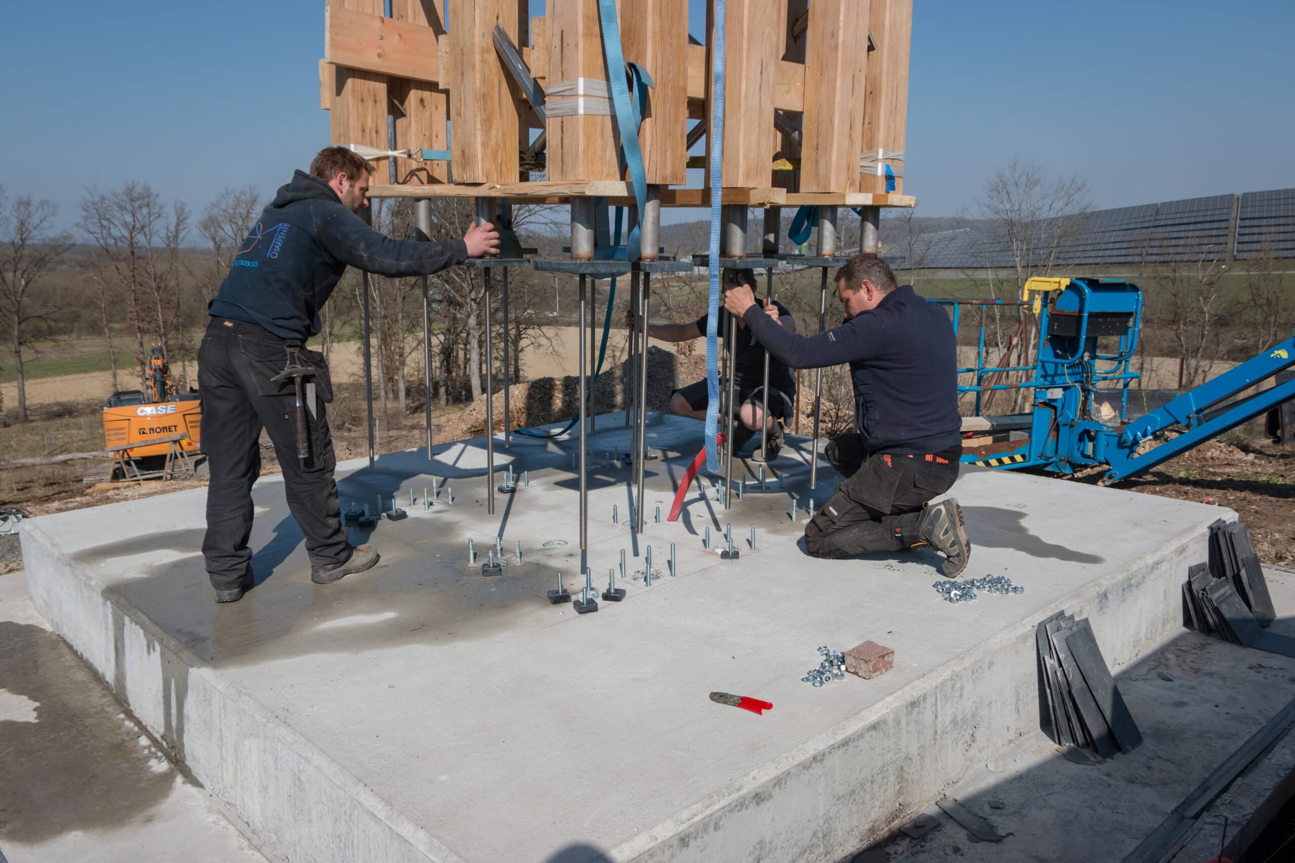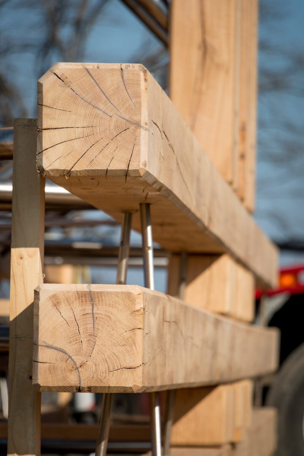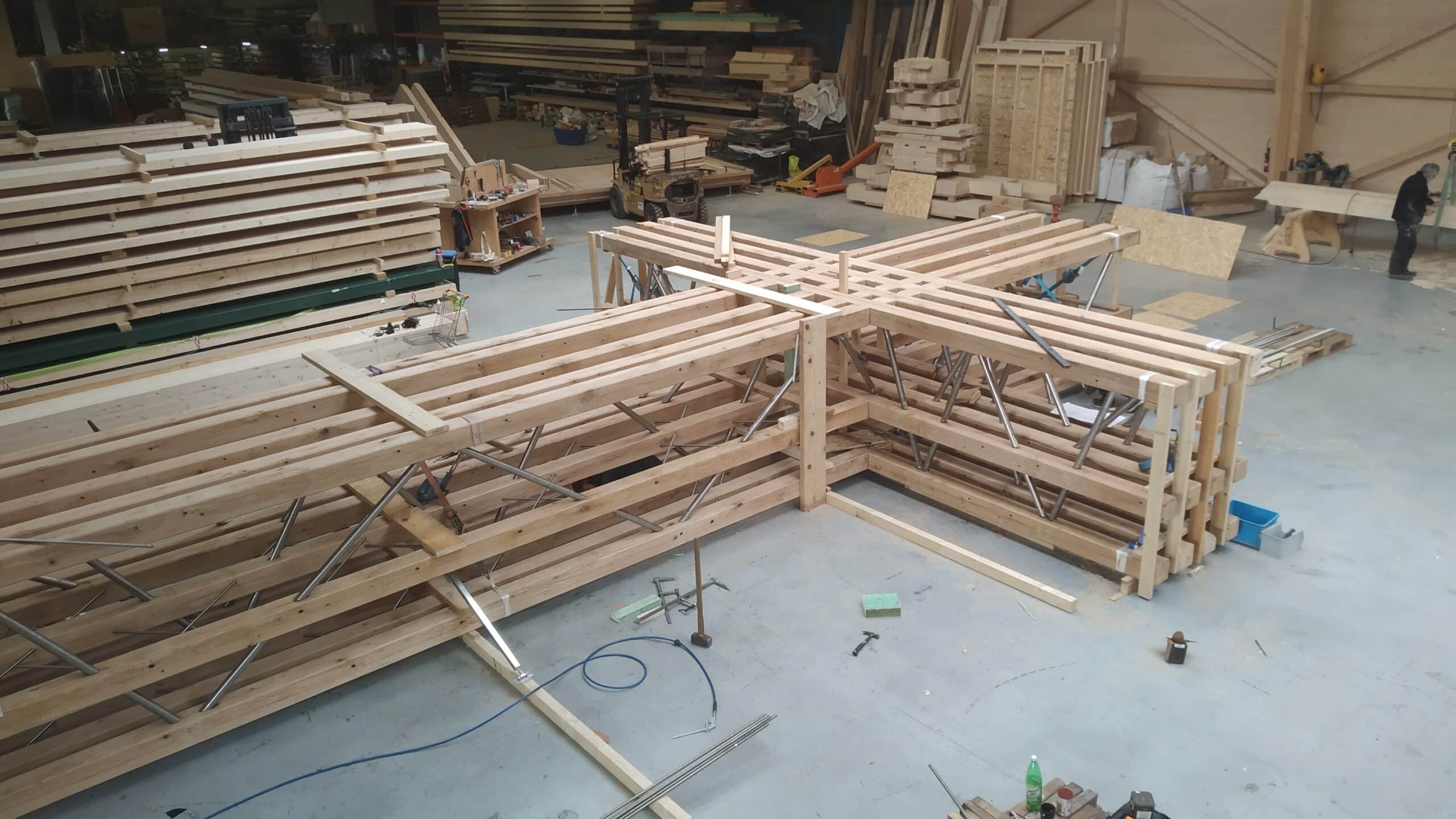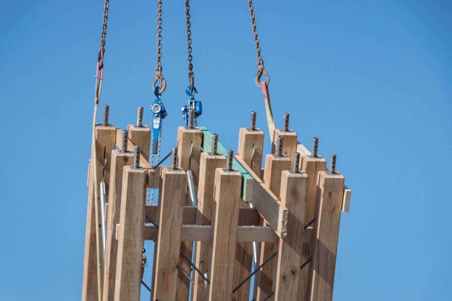A parametric study was used to define the pattern of diagonals, which symbolise the multiple paths connecting earth and sky. On the front of the cross, threaded rods are screwed into the oak studs to create rigid planes with the alignment of five studs. On the profile, steel tubes are used to create lattice beams connecting all the planes to stabilise the whole structure. The multiplicity of bracing planes, each with a distinct geometry, gives the illusion of a random structure. The details of the connections have been carefully studied to ensure maximum durability of the structure while maintaining a pure and harmonious aesthetic.