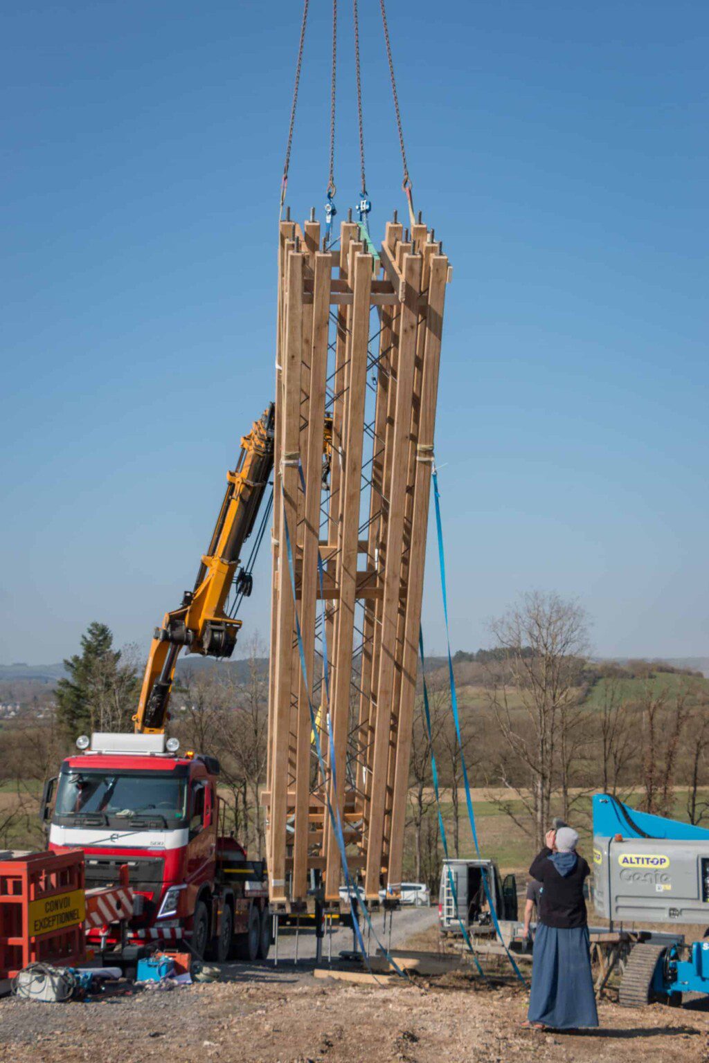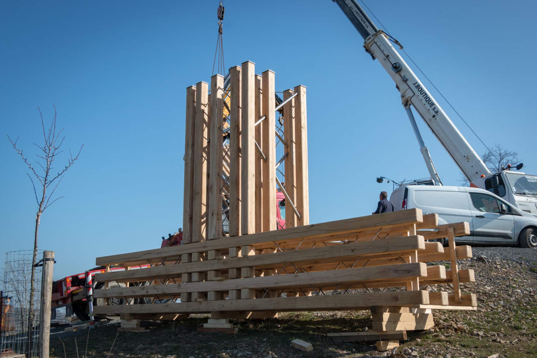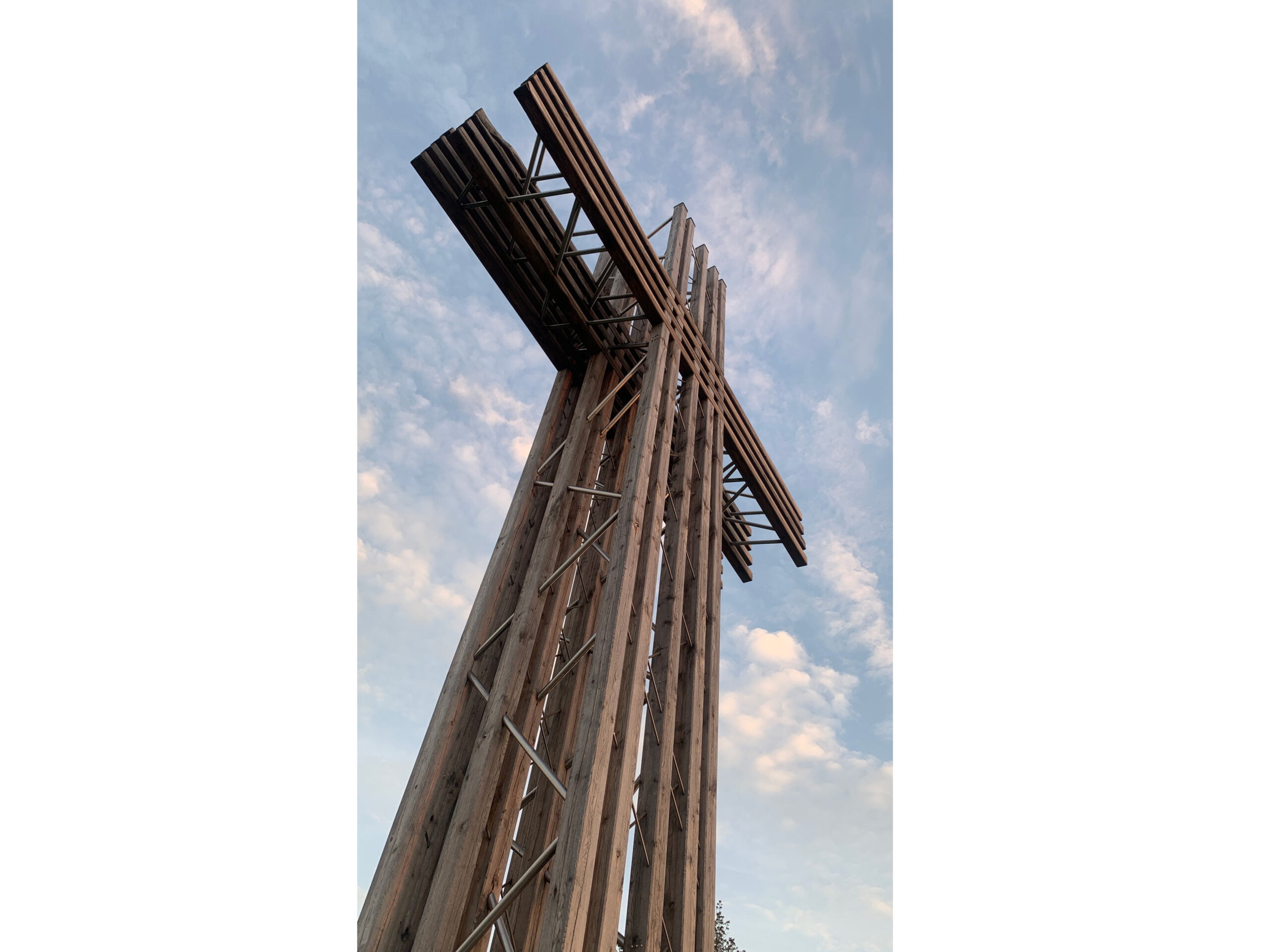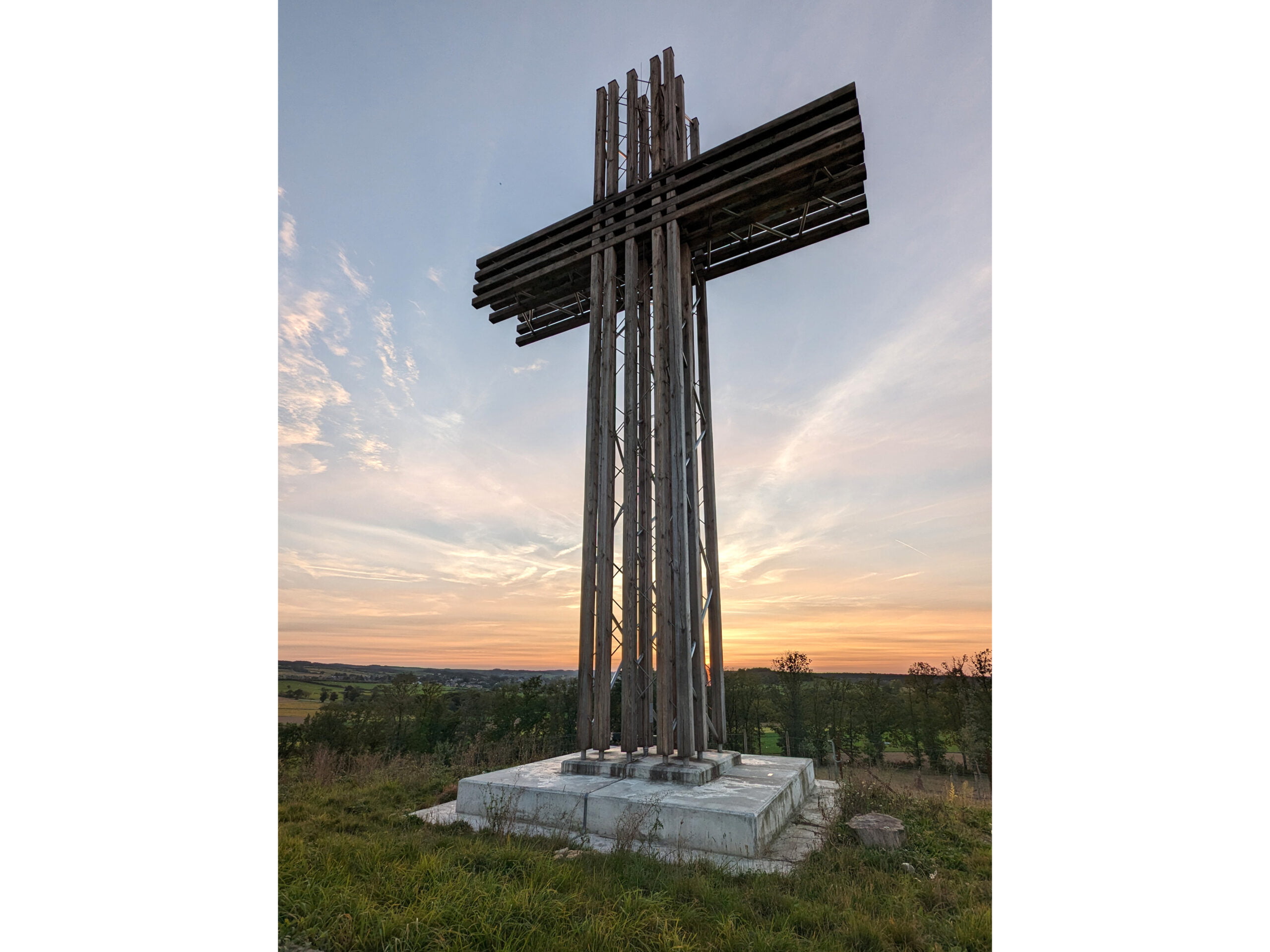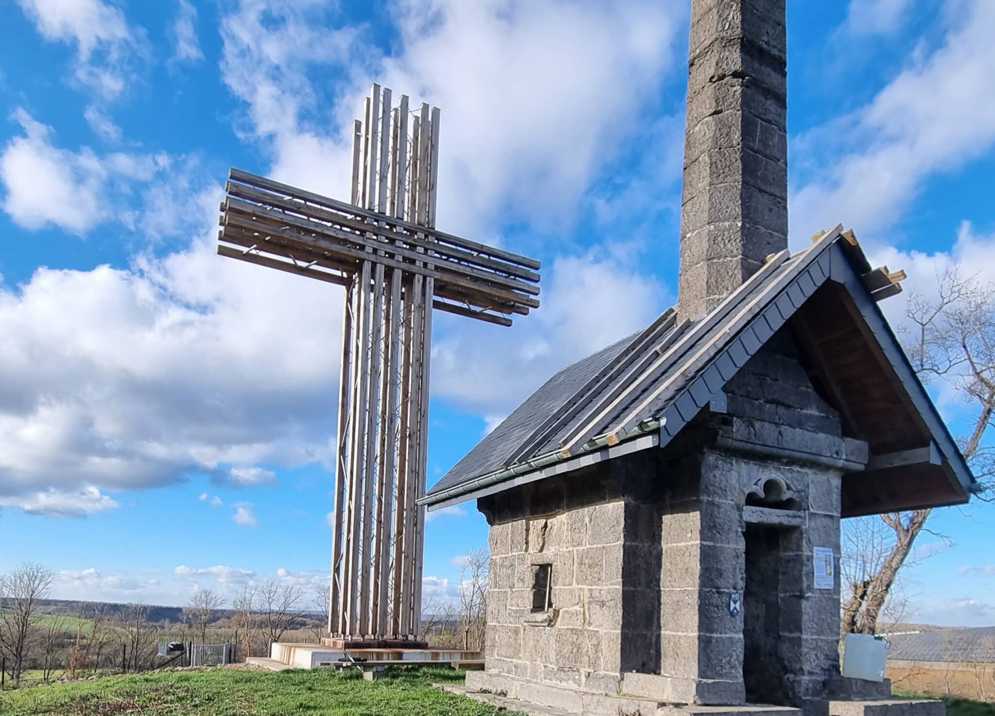 The Jeumont cross was commissioned by the Tiberiade community after the collapse of an old stone cross on Mount Jeumont in Wellin. The new cross can be seen from the E411 motorway and is distinguished by its 14-metre high wooden and steel structure. The studs are made of solid oak from a local forest in the Ardennes, while the bracing is provided by steel diagonals.